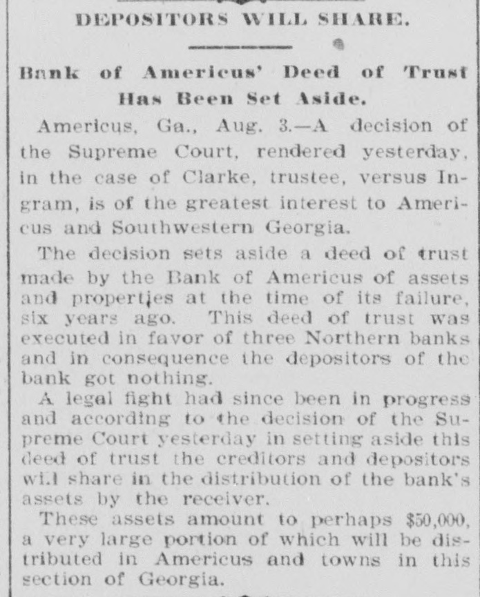 DEPOSITORS WILL SHARE. Bank of Americus' Deed of Trust Has Been Set Aside. Americus, Ga., Aug. 3.-A decision of the Supreme Court, rendered yesterday, in the case of Clarke, trustee, versus Ingram, is of the greatest interest to Americus and Southwestern Georgia. The decision sets aside a deed of trust made by the Bank of Americus of assets and properties at the time of its failure, six years ago. This deed of trust was executed in favor of three Northern banks and in consequence the depositors of the bank got nothing. A legal fight had since been in progress and according to the decision of the Supreme Court yesterday in setting aside this deed of trust the creditors and depositors will share in the distribution of the bank's assets by the receiver. These assets amount to perhaps $50,000, a very large portion of which will be distributed in Americus and towns in this section of Georgia.