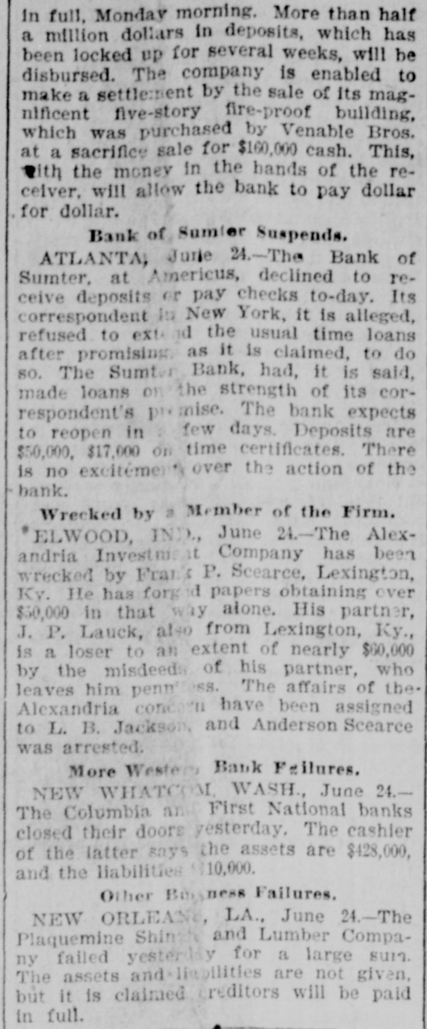 in full, Monday morning. More than half a million dollars in deposits, which has been locked up for several weeks, will be disbursed. The company is enabled to make a settlement by the sale of its magnificent five-story fire-proof building, which was purchased by Venable Bros. at a sacrifice sale for $160,000 cash. This, ith the money in the hands of the recelver, will allow the bank to pay dollar for dollar. Bank of Sumier Suspends. ATLANTA, June 24. -The Bank of Sumter, at Americus, declined to receive deposits or pay checks to-day. Its correspondent Its New York, it is alleged, refused to extend the usual time loans after promising as it is claimed, to do so. The Sumter Bank, had, it is said, made loans on the strength of its correspondent's pirmise. The bank expects to reopen in few days. Deposits are $50,000, $17,000 on time certificates. There is no excitême) over the action of the bank. Wrecked by a Member of the Firm. ELWOOD IND., June 24.-The Alexandria Investment Company has been wrecked by Fran's P. Scearce, Lexington, Ky. He has forged papers obtaining over $50,000 in that way alone. His partner, J. P. Lauck, also from Lexington, Ky., is a loser to all extent of nearly $60,000 by the misdeeds of his partner, who leaves him penniless. The affairs of the. Alexandria concern have been assigned to L. B. Jackson and Anderson Scearce was arrested. More Western Bank Feilures. NEW WHATCOM WASH., June 24.The Columbia an First National banks closed their doors yesterday, The cashier of the latter says the assets are $428,000, and the liabilities 10,000. Other Birth ness Failures. NEW ORLEANE, LA., June 24.-The Plaquemine Shinat and Lumber Company failed yesterdly for a large sun. The assets and >liabilities are not given, but it is claimed creditors will be paid in full.