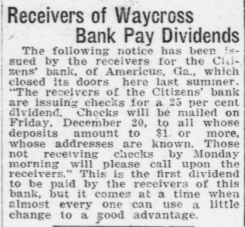 Receivers of Waycross Bank Pay Dividends The following notice has been issued by the receivers for the Citizens' bank, of Americus, Ga., which closed its doors here last summer. "The receivers of the Citizens' bank are issuing checks for a 25 per cent dividend. Checks will be mailed on Friday, December 20, to all whose deposits amount to $1. or more, whose addresses are known. Those not receiving checks by Monday morning will please call upon the receivers." This is the first dividend to be paid by the receivers of this bank, but it comes at a time when almost every one can use a little change to a good advantage.