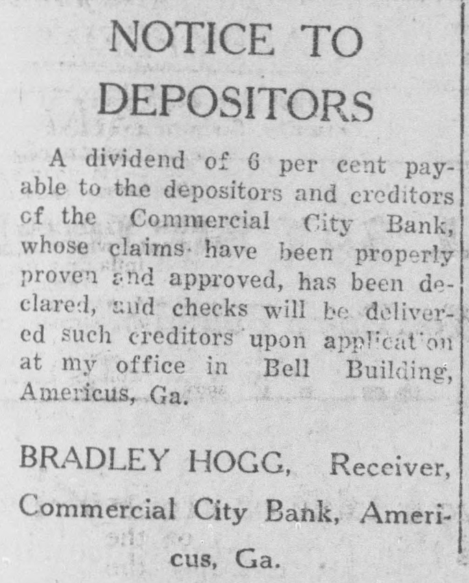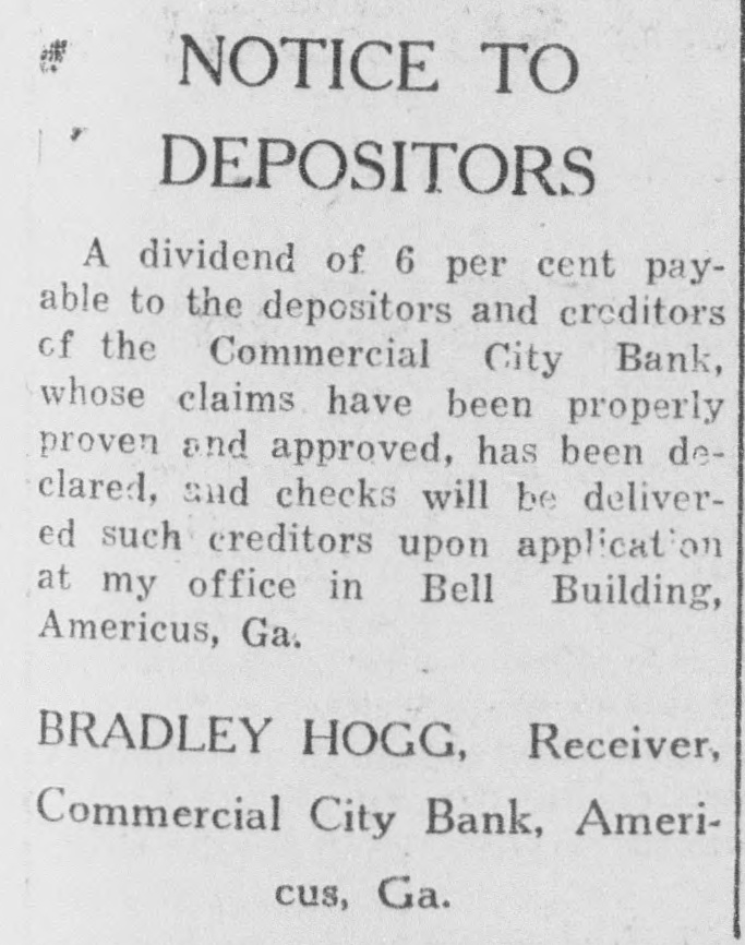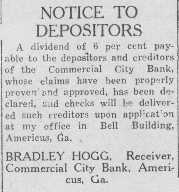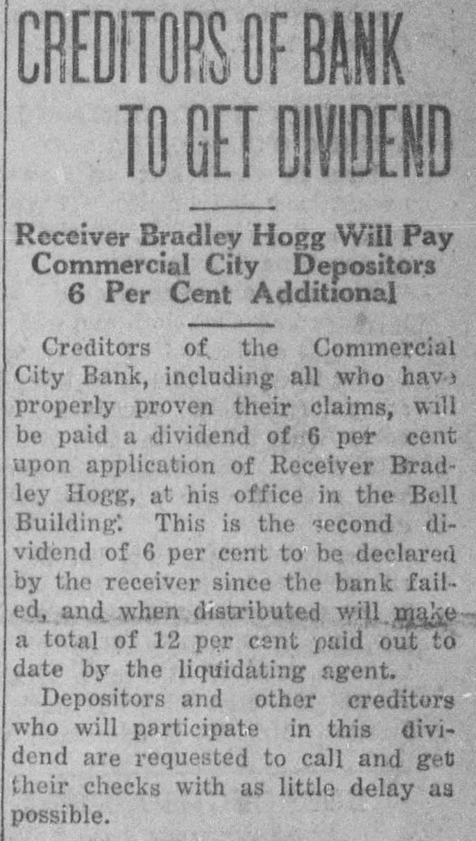 # CREDITORS OF BANK # TO GET DIVIDEND Receiver Bradley Hogg Will Pay Commercial City Depositors 6 Per Cent Additional Creditors of the Commercial City Bank, including all who have properly proven their claims, will be paid a dividend of 6 per cent upon application of Receiver Bradley Hogg, at his office in the Bell Building. This is the second dividend of 6 per cent to be declared by the receiver since the bank failed, and when distributed will make a total of 12 per cent paid out to date by the liquidating agent. Depositors and other creditors who will participate in this dividend are requested to call and get their checks with as little delay as possible.
