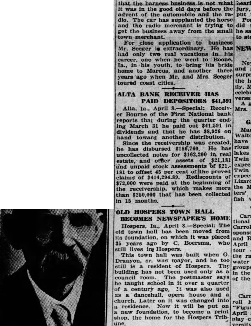 Bank Receiver Reports. Alta, Ia., July 26.-Special: W. M. Grimes, receiver of the First National bank of Alta, has made his quarterly report to the controller of currency. Since his appointment, December, he has collected and disbursed 416 and now has $39,529 on hand. The assets his hands include in $99,751 in other as$2,198 in assets acquired since the established, and $23,196 in unpaid stock total $353,085, against which there are liabilities of $414,319.