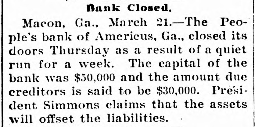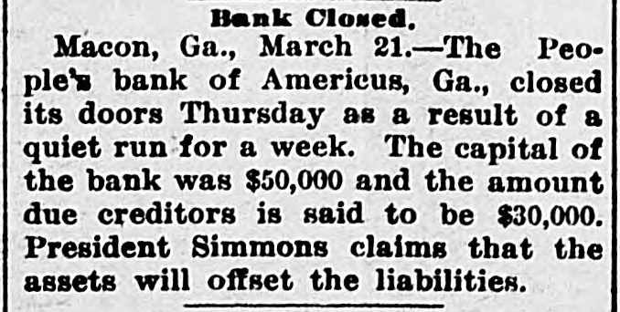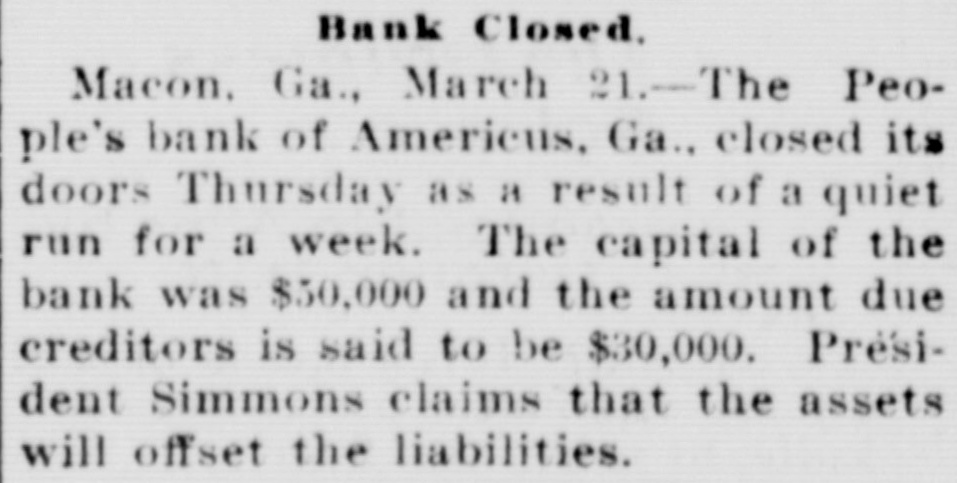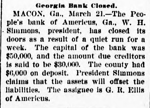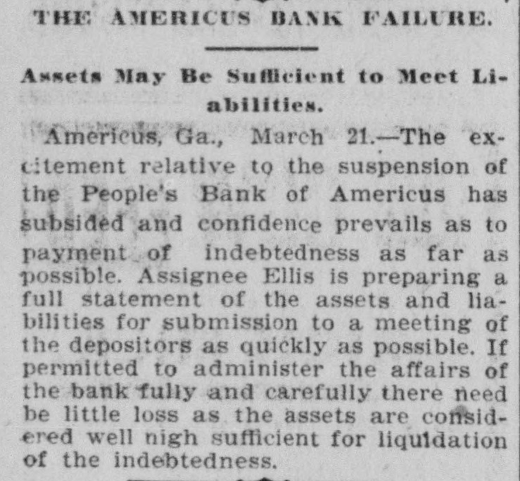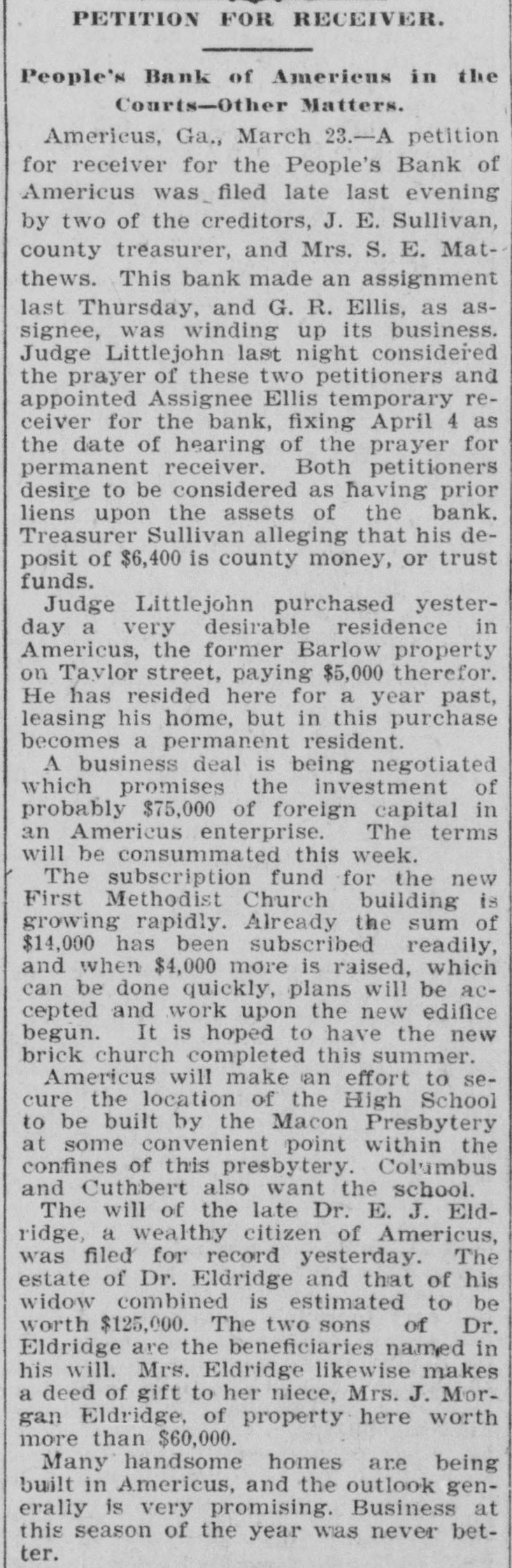 PETITION FOR RECEIVER. People's Bank of Americus in the Courts-Other Matters. Americus, Ga,, March 23.-A petition for receiver for the People's Bank of Americus was filed late last evening by two of the creditors, J. E. Sullivan, county treasurer, and Mrs. S. E. Matthews. This bank made an assignment last Thursday, and G. R. Ellis, as assignee, was winding up its business. Judge Littlejohn last night considered the prayer of these two petitioners and appointed Assignee Ellis temporary receiver for the bank, fixing April 4 as the date of hearing of the prayer for permanent receiver. Both petitioners desire to be considered as having prior liens upon the assets of the bank. Treasurer Sullivan alleging that his deposit of $6,400 is county money, or trust funds. Judge Littlejohn purchased yesterday a very desirable residence in Americus, the former Barlow property on Tavlor street, paying $5,000 therefor. He has resided here for a year past, leasing his home, but in this purchase becomes a permanent resident. A business deal is being negotiated which promises the investment of probably $75,000 of foreign capital in an Americus enterprise. The terms will be consummated this week. The subscription fund for the new First Methodist Church building is growing rapidly. Already the sum of $14,000 has been subscribed readily, and when $4,000 more is raised, which can be done quickly, plans will be accepted and work upon the new edifice begun. It is hoped to have the new brick church completed this summer. Americus will make an effort to secure the location of the High School to be built by the Macon Presbytery at some convenient point within the confines of this presbytery. Columbus and Cuthbert also want the school. The will of the late Dr. E. J. Eldridge, a wealthy citizen of Americus, was filed for record yesterday. The estate of Dr. Eldridge and that of his widow combined is estimated to be worth $125,000. The two sons of Dr. Eldridge are the beneficiaries named in his will. Mrs. Eldridge likewise makes a deed of gift to her niece, Mrs. J. Morgan Eldridge, of property here worth more than $60,000. Many handsome homes are being built in Americus, and the outlook generally is very promising. Business at this season of the year was never better.
