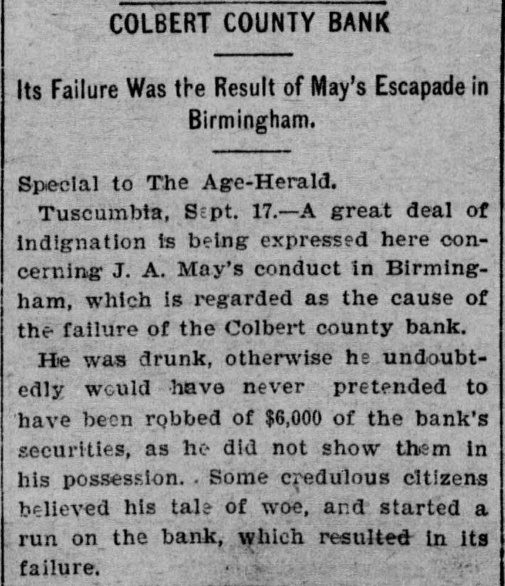 Closed Its Doors, Nashville, Tenn., September 16.-Today the Colbert County bank, Tuscumbia, Ala., closed its doors. A run started yesterday and was continued this morning. The bank is two years old. Capital stock, $50,000; officials claim all liabilities will be paid, as they are small.