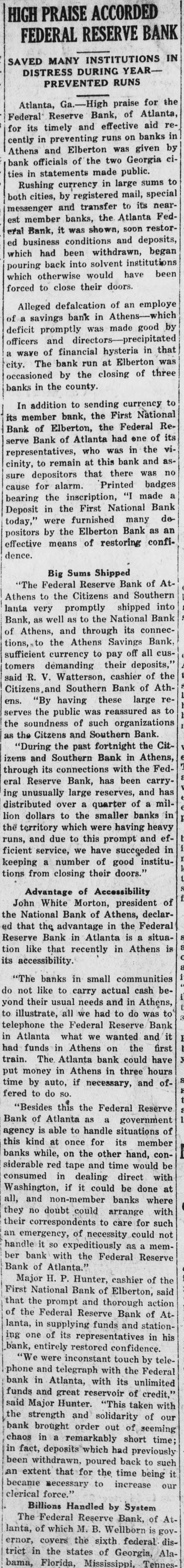 HIGH PRAISE ACCORDED FEDERAL RESERVE BANK SAVED MANY INSTITUTIONS IN DISTRESS DURING YEARPREVENTED RUNS Atlanta, Ga.-High praise for the Federal Reserve Bank, of Atlanta, for its timely and effective aid recently in preventing runs on banks in Athens and Elberton was given by bank officials of the two Georgia cities in statements made public. Rushing currency in large sums to both cities, by registered mail, special messenger and transfer to its nearest member banks, the Atlanta Federal Bank, it was shown, soon restored business conditions and deposits, which had been withdrawn, began pouring back into solvent institutions which otherwise would have been forced to close their doors. Alleged defalcation of an employe of a bank in Athens-which officers deficit a a wave of financial hysteria in that city. The bank run at Elberton was occasioned by the closing of three banks in the county. In addition to sending currency to its member bank, the First National Bank of Elberton, the Federal Reserve Bank of Atlanta had one of its representatives, who was in the vicinity, to remain at this bank and assure depositors that there was no cause for alarm. Printed badges bearing the inscription, "I made a Deposit in the First National Bank today," were furnished many depositors by the Elberton Bank as an effective means of restoring confidence. Big Sums Shipped "The Federal Reserve Bank of AtAthens to the Citizens and Southern lanta very promptly shipped into Bank, as well as to the National Bank of Athens, and through its connections, to the Athens Savings Bank, sufficient currency to pay off all customers demanding their deposits," said R. V. Watterson, cashier of the Citizens and Southern Bank of Athens. "By having these large reserves the public was reassured as to the soundness of such organizations as the Citzens and Southern Bank. "During the past fortnight the Citizens and Southern Bank in Athens, through its connections with the Federal Reserve Bank, has been carrying unusually large reserves, and has distributed over a quarter of a million dollars to the smaller banks in the territory which were having heavy runs, and due to this prompt and efficient service, we have succeeded in keeping a number of good institutions from closing their doors." Advantage of Accessibility John White Morton, president of the National Bank of Athens, declared that the advantage in the Federal Reserve Bank in Atlanta is a situation like that recently in Athens is its accessibility. "The banks in small communities do not like to carry actual cash beyond their usual needs and in Athens, to illustrate, all we had to do was to telephone the Federal Reserve Bank I in Atlanta what we wanted and it had funds in Athens on the first train. The Atlanta bank could have put money in Athens in three hours time by auto, if necessary, and offered to do SO. "Besides this the Federal Reserve Bank of Atlanta as a government agency is able to handle situations of this kind at once for its member banks while, on the other hand, considerable red tape and time would be consumed in dealing direct with Washington, if it could be done at all, and non-member banks where they no doubt could arrange with their correspondents to care for such an emergency, of necessity could not handle it so expeditiously as a member bank with the Federal Reserve Bank of Atlanta." Major H. P. Hunter, cashier of the First National Bank of Elberton, said that the prompt and thorough action of the Federal Reserve Bank of Atlanta, in supplying funds and stationing one of its representatives in his bank, entirely restored confidence. "We were inconstant touch by telephone and telegraph with the Federal bank in Atlanta, with its unlimited funds and great reservoir of credit," said Major Hunter. "This taken with the strength and solidarity of our bank brought order out of seeming chaos in a remarkably short time; in fact, deposits which had previously been withdrawn, poured back to such an extent that for the time being it became necessary to increase our clerical force." Billions Handled by System The Federal Reserve Bank, of Atlants of which M. B. Wellborn is gov-