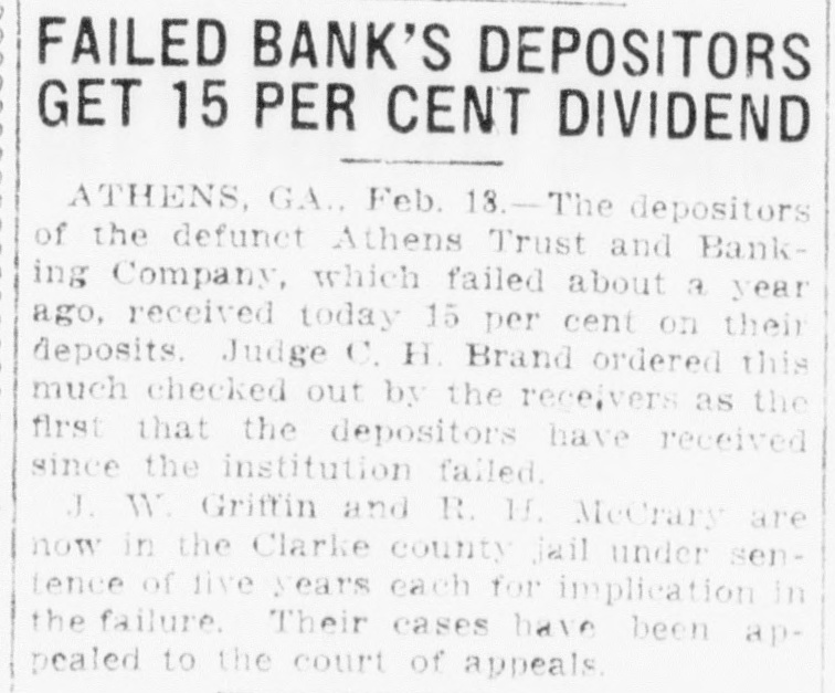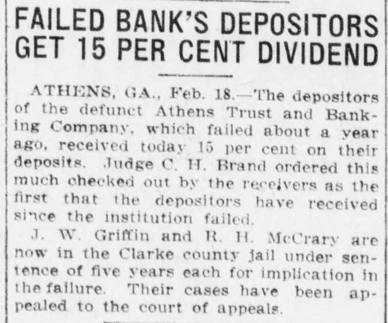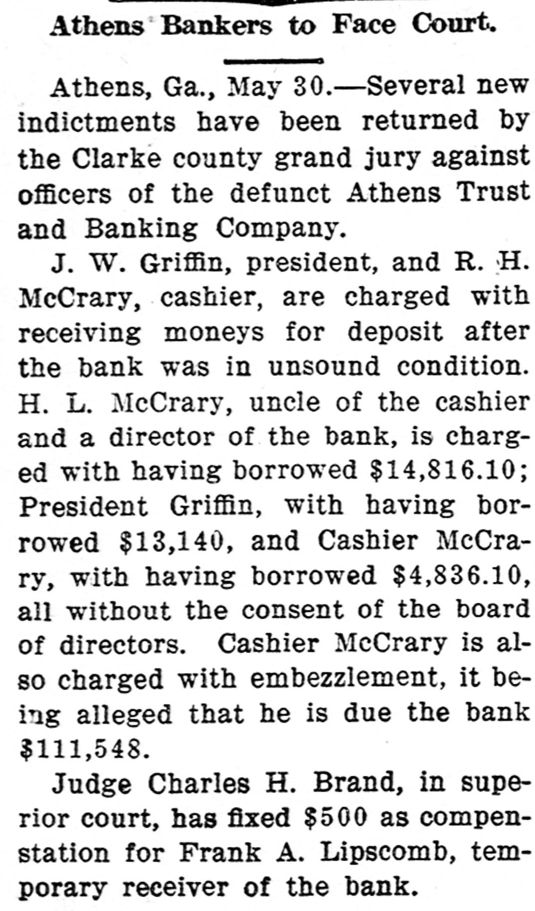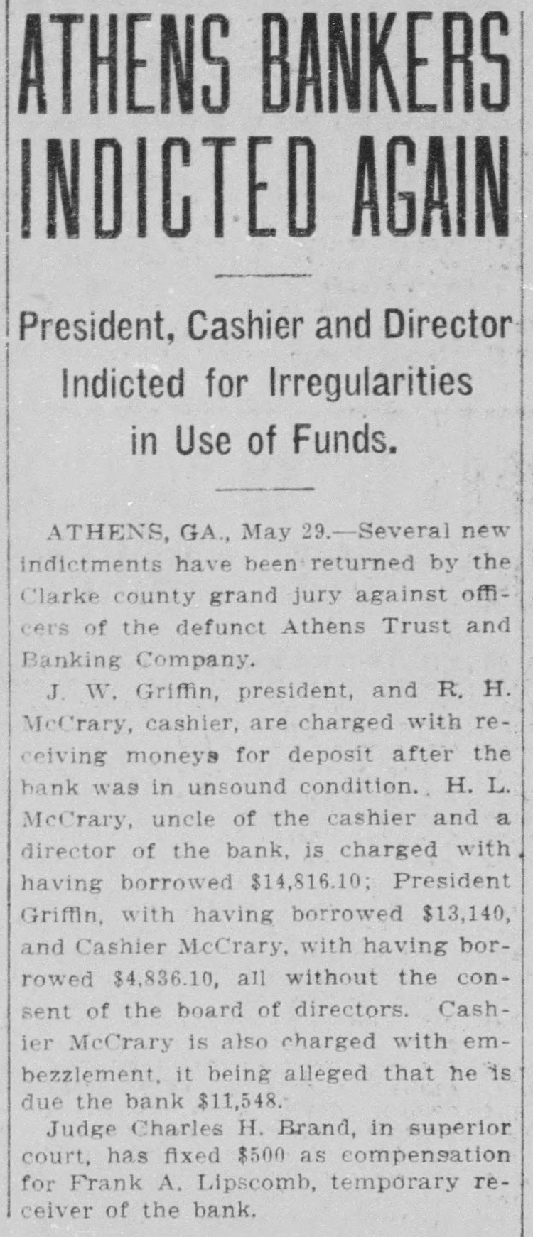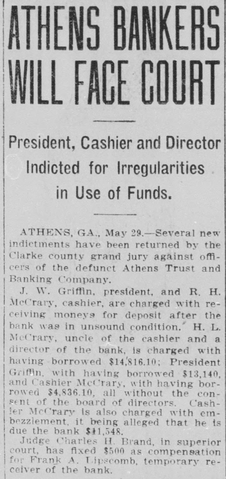 ATHENS BANKERS WILL FACE COURT President, Cashier and Director Indicted for Irregularities in Use of Funds. ATHENS, GA., May 29.-Several new indictments have been returned by the Clarke county grand jury against officers of the defunct Athens Trust and Banking Company. J. W. Griffin, president, and R. H. McCrary, cashier, are charged with receiving moneys for deposit after the bank was in unsound condition. H. L. McCrary, uncle of the cashier and a director of the bank, is charged with having borrowed $14,816.10; President Griffin, with having borrowed $13,140, and Cashier McCrary, with having borrowed $4,836.10, all without the consent of the board of directors. Cashler McCrary is also charged with embezzlement, it being alleged that he is due the bank $11,548. Judge Charles H. Brand, in superior court, has fixed $500 as compensation for Frank A. Lipscomb, temporary receiver of the bank.
