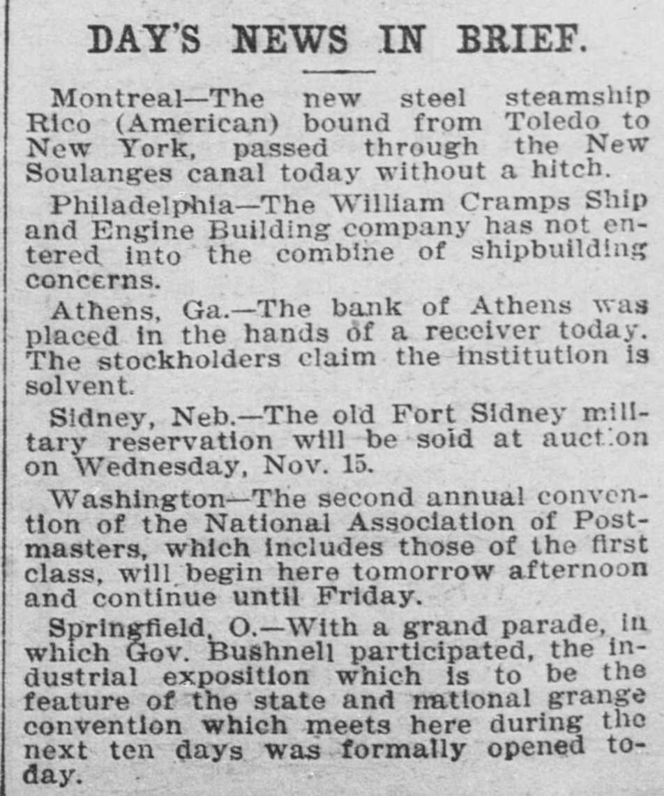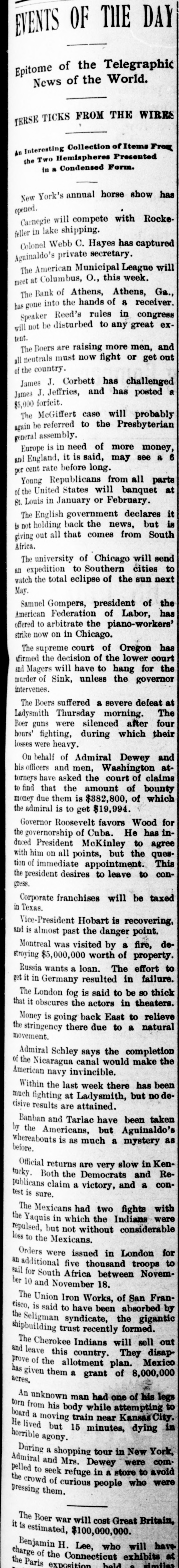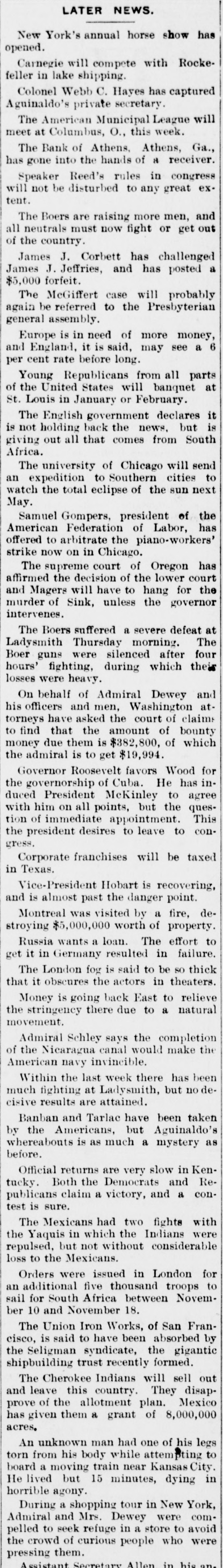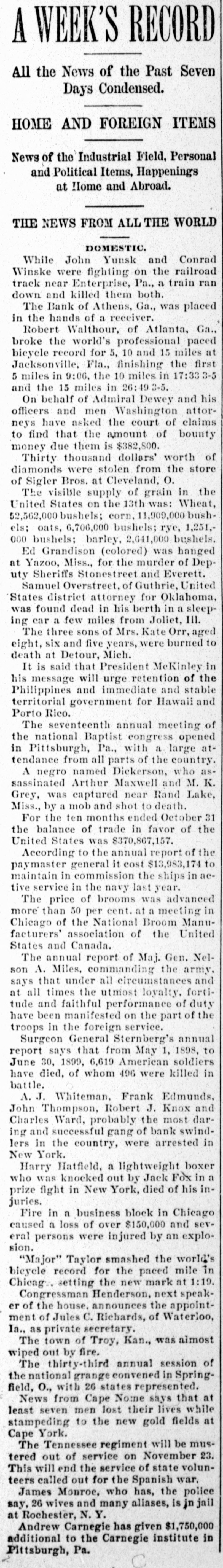 A WEEK'S RECORD All the News of the Past Seven Days Condensed. HOME AND FOREIGN ITEMS News of the Industrial Field, Personal and Political Items, Happenings at Home and Abroad. THE NEWS FROM ALL THE WORLD DOMESTIC. While John Yunsk and Conrad Winske were fighting on the railroad track near Enterprise, Pa., a train ran down and killed them both. The Bank of Athens, Ga., was placed in the hands of a receiver. Robert Walthour, of Atlanta, Ga., broke the world's professional paced bicycle record for 5, 10 and 15 miles at Jacksonville, Fla., finishing the first 5 miles in 9:06, the 10 miles in 17:33 3-5 and the 15 miles in 26:49 3-5. On behalf of Admiral Dewey and his officers and men Washington attorneys have asked the court of claims to find that the amount of bounty money due them is $382,800. Thirty thousand dollars' worth of diamonds were stolen from the store of Sigler Bros. at Cleveland, O. The visible supply of grain in the United States on the 13th was: Wheat, 52,562,000 bushels; corn, 11,909,000 bushels; oats, 6,706,000 bushels; rye, 1,251,000 bushels; barley, 2,041,000 bushels. Ed Grandison (colored) was hanged at Yazoo, Miss., for the murder of Deputy Sheriffs Stonestreet and Everett. Samuel Overstreet, of Guthrie, United States district attorney for Oklahoma, was found dead in his berth in a sleeping car a few miles from Joliet, III. The three sons of Mrs. Kate Orr, aged eight, six and five years, were burned to death at Detour, Mich. It is said that President McKinley in his message will urge retention of the Philippines and immediate and stable territorial government for Hawaii and Porto Rico. The seventeenth annual meeting of the national Baptist congress opened in Pittsburgh, Pa., with a large attendance from all parts of the country. A negro named Dickerson, who assassinated Arthur Maxwell and M. K. Grey, was eaptured near Rand Lake, Miss., by a mob and shot to death. For the ten months ended October 31 the balance of trade in favor of the United States was $370,867,157. According to the annual report of the paymaster general it cost $13,983,174 to maintain in commission the ships in active service in the navy last year. The price of brooms was advanced more' than 50 per cent. at a meeting in Chicago of the National Broom Manufacturers' association of the United States and Canada. The annual report of Maj. Gen. Nelson A. Miles, commanding the army, says that under all eircumstances and at all times the utmost loyalty, fortitude and faithful performance of duty have been manifested on the part of the