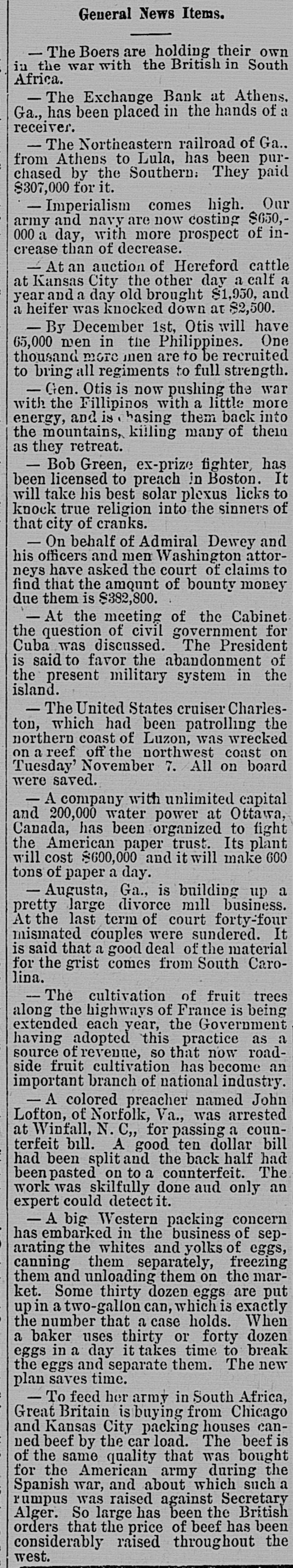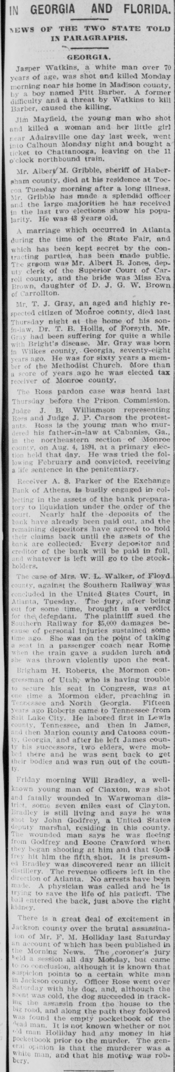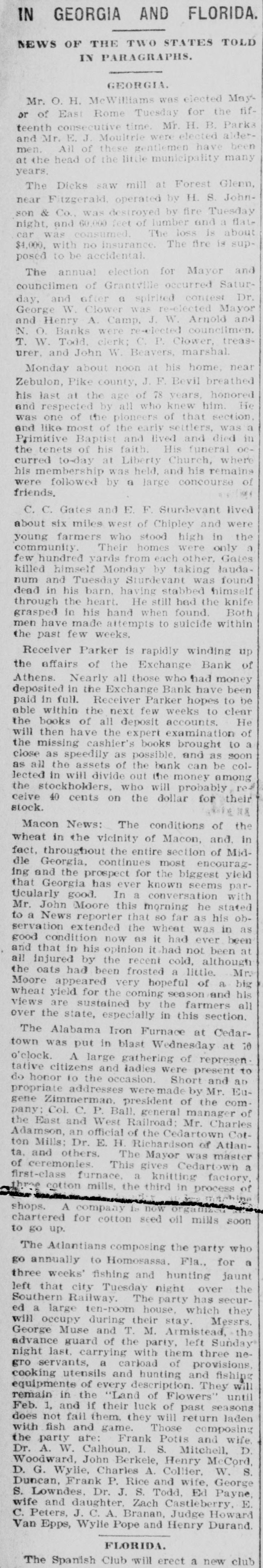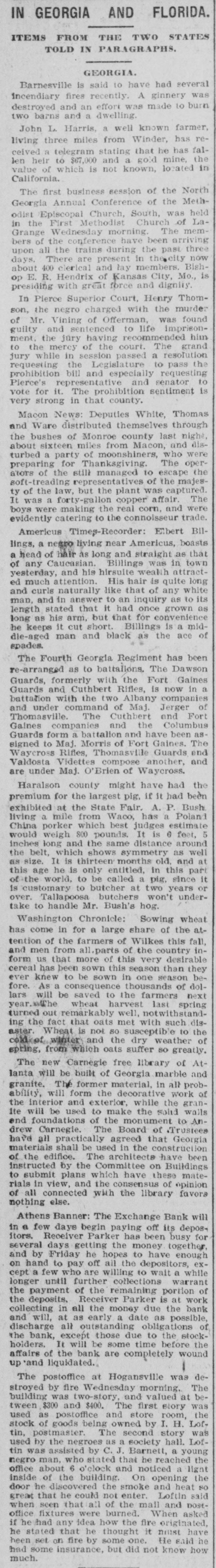 FLORIDA. AND GEORGIA IN ITEMS FROM THE TWO STATES TOLD IN PARAGRAPHS. GEORGIA. Barnesville is said to have had several incendiary fires recently. A ginnery was destroyed and an effort was made to burn two barns and a dwelling. John L. Harris, a well known farmer, living three miles from Winder, has recelved a telegram stating that he has fallen heir to $67,000 and a gold mine, the value of which is not known, located in California. The first business session of the North Georgia Annual Conference of the Methodist Episcopal Church, South, was held in the First Methodist Church of LaGrange Wednesday morning. The members of the conference have been arriving upon all the trains during the past three days. There are present in the city now about 400 clerical and lay members. Bishop E. R. Hendrix of Kansas City, Mo., is presiding with great force and dignity. In Pierce Superior Court, Henry Thomson, the negro charged with the murder of Mr. Vining of Offerman, was found guilty and sentenced to life imprisonment. the jury having recommended him to the mercy of the court. The grand jury while in session passed a resolution requesting the Legislature to pass the prohibition bill and especially requesting Pierce's representative and senator to vote for it. The prohibition sentiment is very strong in that county. Macon News: Deputies White, Thomas and Ware distributed themselves through the bushes of Monroe county last night, about sixteen miles from Macon, and disturbed a party of moonshiners, who were preparing for Thanksgiving. The operators of the still managed to escape the soft-treading representatives of the majesty of the law, but the plant was captured. It was a forty-gallon copper affair. The boys were making the real corn. and were evidently catering to the connoisseur trade. Americus Times-Recorder: Elbert Billings, a negro living near Americus, boasts a head of hair as long and straight as that of any Caucasian. Billings was in town yesterday, and his hirsuite wealth attracted much attention. His hair is quite long and curls naturally like that of any white man, and in answer to an inquiry as to its length stated that It had once grown as long as his arm, but that for convenience he keeps it cut short. Billings is a middie-aged man and black as the ace of spades. The Fourth Georgia Regiment has been re-arranged as to battallons. The Dawson Guards, formerly with the Fort Gaines Guards and Cuthbert Rifles, is now in a battalion with the two Albany companies and under command of Maj. Jerger of Thomasville. The Cuthbert and Fort Gaines companies and the Columbus Guards form a battalion and have been assigned to Maj. Morris of Fort Gaines. The Waycross Rifles, Thomasville Guards and Valdosta Videttes compose another, and are under Maj. O'Brien of Waycross. Haralson county might have had the premium for the largest pig, if it had been exhibited at the State Fair. A. P. Bush living a mile from Waco, has a Poland China porker which best judges estimate would weigh 800 pounds. It is 6 feet, 5 inches long and the same distance around the belt, which shows symmetry as well as size. It is thirteen months old. and at this age he is only entitled, in this part of the world. to be called a pig, since it is customary to butcher at two years or over. Tallapoosa butchers won't undertake to handle Mr. Bush's hog. Washington Chronicle: Sowing wheat has come in for a large share of the attention of the farmers of Wilkes this fall, and men from all.parts of the country inform us that more of this very desirable cereal has been sown this season than they ever knew to be sown in one season before. As a consequence thousands of dollars will be saved to the farmers next year.wThe wheat harvest last spring turned out remarkably well, notwithstanding the fact that oats met with such disaster. Wheat is not so susceptible to the cold of winter and the dry weather of spring, from which oats suffer so greatly. The new Carnegie free library of Atlanta will be built of Georgia marble and granite. The former material, in all probability, will form the decorative work of the interior and exterior, while the granIte will be used to make the solid walls end foundations of the monument to Andrew Carnegie. The Board of Trustees have all practically agreed that Georgia materials shall be used in the construction of the edifice. The architects have been instructed by the Committee on Buildings to submit plans which have these materials in view, and the consensus of opinion of all connected with the library favors nothing else. Athens Banner: The Exchange Bank will in a few days begin paying off its depositors. Receiver Parker has been busy for several days getting the money together, and by Friday he hopes to have enough on hand to pay off all the depositors, except a few who are willing to wait a while longer until further collections warrant the payment of the remaining portion of the deposits, Receiver Parker is at work collecting in all the money due the bank and will, at as early a date as possible, discharge all outstanding obligations of the bank, except those due to the stockholders. It will be some time before the affairs of the bank are completely wound up and liquidated. The postoffice at Hogansville was destroyed by fire Wednesday morning. The building was two-story, and valued at between $300 and $400. The first story was used as postoffice and store room, the stock of goods being owned by I. H. Loftin, postmaster. The second story was used by the negroes as a society hall. Loftin was assisted by C. J. Barnett, a young megro man, who stated that he reached the office about 6 o'clock and noticed a light inside of the building. On opening the door he discovered the smoke and heat SO great that he could not enter. Loftin said when seen that all of the mail and Dostoffice fixtures were burned. When asked