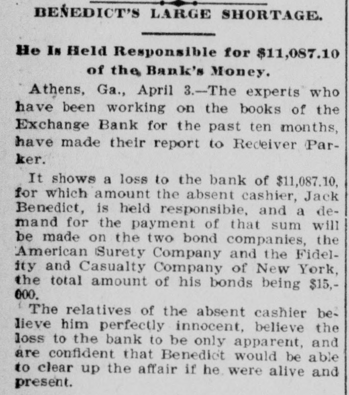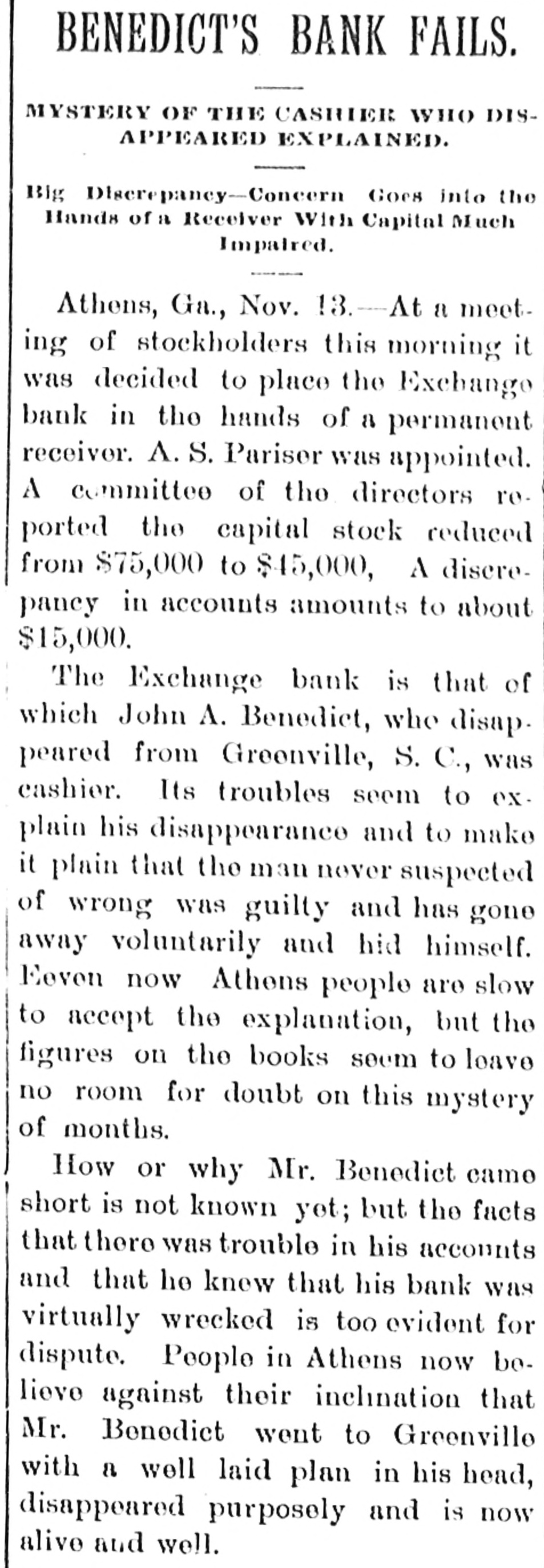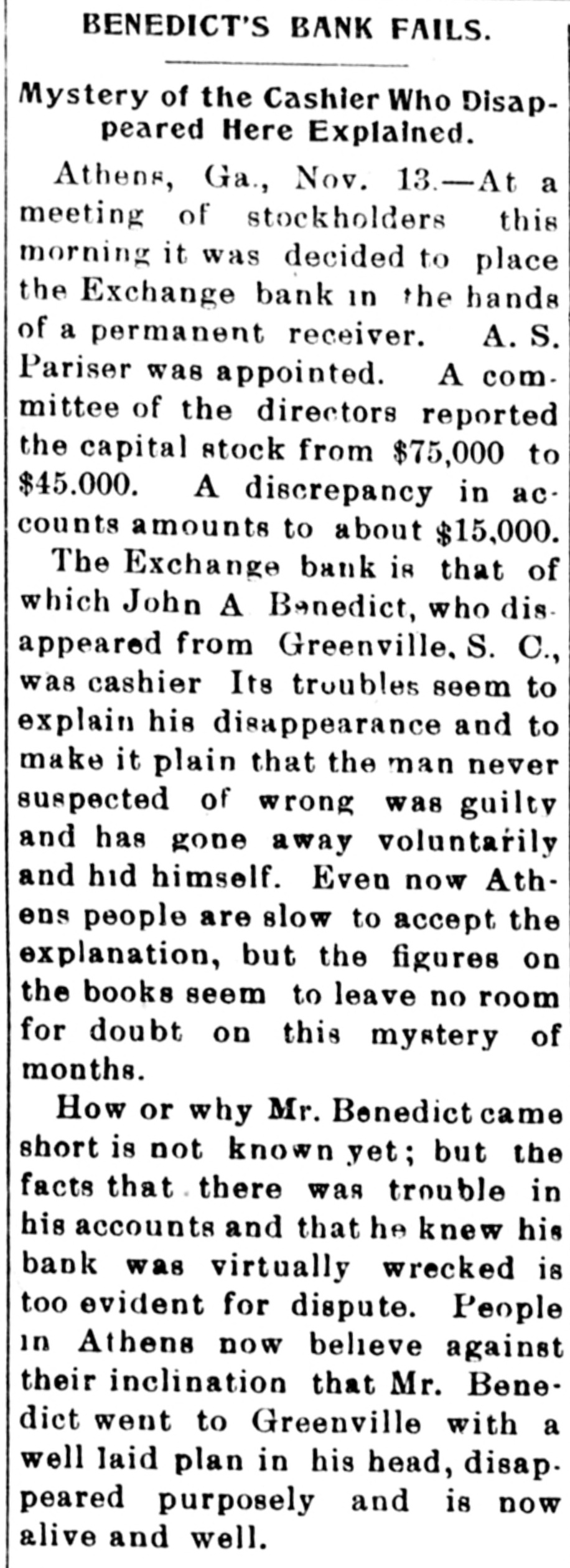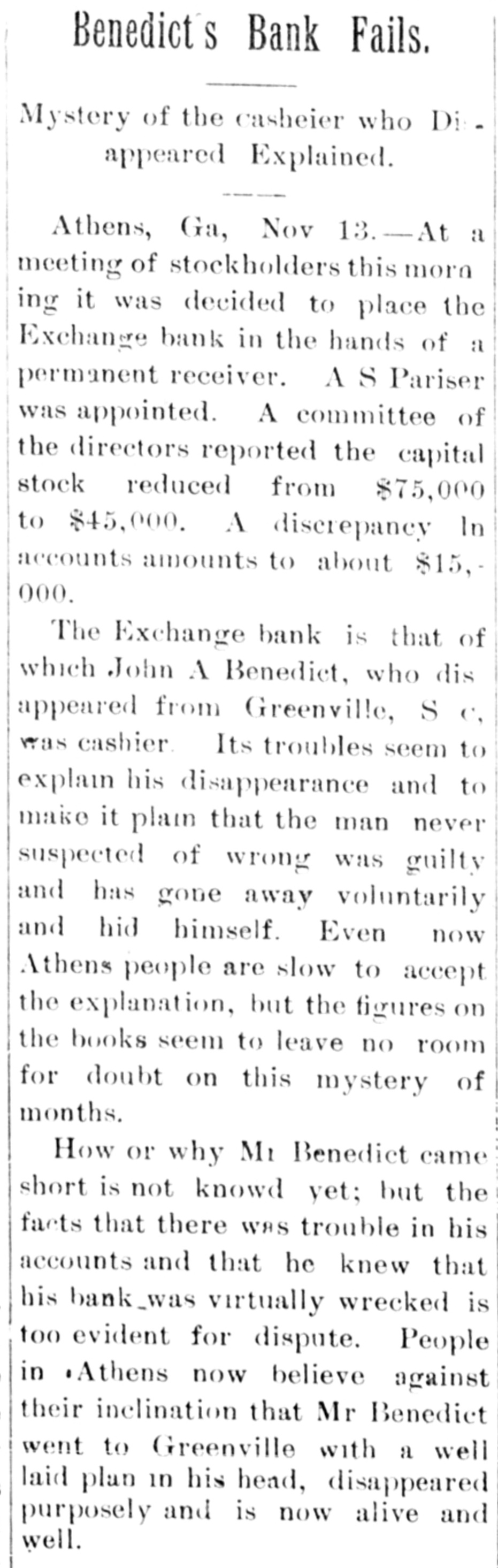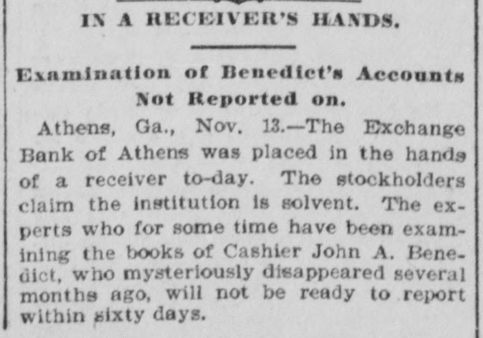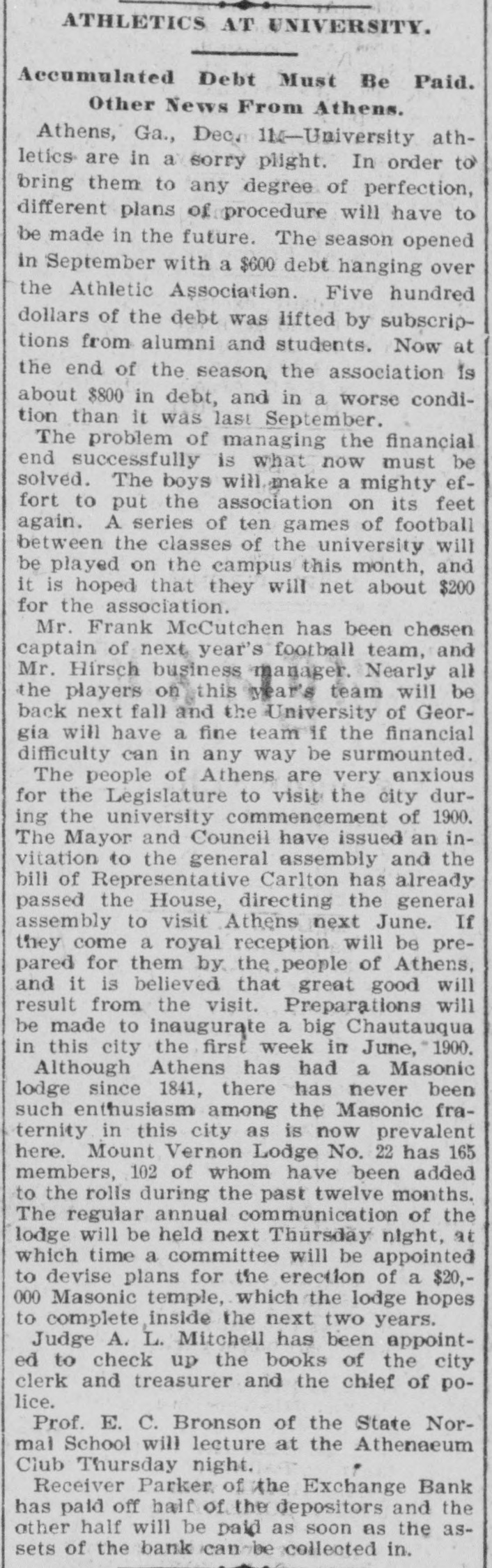 FLORIDA. AND GEORGIA IN ITEMS FROM THE TWO STATES TOLD IN PARAGRAPHS. GEORGIA. Barnesville is said to have had several incendiary fires recently. A ginnery was destroyed and an effort was made to burn two barns and a dwelling. John L. Harris, a well known farmer, living three miles from Winder, has recelved a telegram stating that he has fallen heir to $67,000 and a gold mine, the value of which is not known, located in California. The first business session of the North Georgia Annual Conference of the Methodist Episcopal Church, South, was held in the First Methodist Church of LaGrange Wednesday morning. The members of the conference have been arriving upon all the trains during the past three days. There are present in the city now about 400 clerical and lay members. Bishop E. R. Hendrix of Kansas City, Mo., is presiding with great force and dignity. In Pierce Superior Court, Henry Thomson, the negro charged with the murder of Mr. Vining of Offerman, was found guilty and sentenced to life imprisonment. the jury having recommended him to the mercy of the court. The grand jury while in session passed a resolution requesting the Legislature to pass the prohibition bill and especially requesting Pierce's representative and senator to vote for it. The prohibition sentiment is very strong in that county. Macon News: Deputies White, Thomas and Ware distributed themselves through the bushes of Monroe county last night, about sixteen miles from Macon, and disturbed a party of moonshiners, who were preparing for Thanksgiving. The operators of the still managed to escape the soft-treading representatives of the majesty of the law, but the plant was captured. It was a forty-gallon copper affair. The boys were making the real corn. and were evidently catering to the connoisseur trade. Americus Times-Recorder: Elbert Billings, a negro living near Americus, boasts a head of hair as long and straight as that of any Caucasian. Billings was in town yesterday, and his hirsuite wealth attracted much attention. His hair is quite long and curls naturally like that of any white man, and in answer to an inquiry as to its length stated that It had once grown as long as his arm, but that for convenience he keeps it cut short. Billings is a middie-aged man and black as the ace of spades. The Fourth Georgia Regiment has been re-arranged as to battallons. The Dawson Guards, formerly with the Fort Gaines Guards and Cuthbert Rifles, is now in a battalion with the two Albany companies and under command of Maj. Jerger of Thomasville. The Cuthbert and Fort Gaines companies and the Columbus Guards form a battalion and have been assigned to Maj. Morris of Fort Gaines. The Waycross Rifles, Thomasville Guards and Valdosta Videttes compose another, and are under Maj. O'Brien of Waycross. Haralson county might have had the premium for the largest pig, if it had been exhibited at the State Fair. A. P. Bush living a mile from Waco, has a Poland China porker which best judges estimate would weigh 800 pounds. It is 6 feet, 5 inches long and the same distance around the belt, which shows symmetry as well as size. It is thirteen months old. and at this age he is only entitled, in this part of the world. to be called a pig, since it is customary to butcher at two years or over. Tallapoosa butchers won't undertake to handle Mr. Bush's hog. Washington Chronicle: Sowing wheat has come in for a large share of the attention of the farmers of Wilkes this fall, and men from all.parts of the country inform us that more of this very desirable cereal has been sown this season than they ever knew to be sown in one season before. As a consequence thousands of dollars will be saved to the farmers next year.wThe wheat harvest last spring turned out remarkably well, notwithstanding the fact that oats met with such disaster. Wheat is not so susceptible to the cold of winter and the dry weather of spring, from which oats suffer so greatly. The new Carnegie free library of Atlanta will be built of Georgia marble and granite. The former material, in all probability, will form the decorative work of the interior and exterior, while the granIte will be used to make the solid walls end foundations of the monument to Andrew Carnegie. The Board of Trustees have all practically agreed that Georgia materials shall be used in the construction of the edifice. The architects have been instructed by the Committee on Buildings to submit plans which have these materials in view, and the consensus of opinion of all connected with the library favors nothing else. Athens Banner: The Exchange Bank will in a few days begin paying off its depositors. Receiver Parker has been busy for several days getting the money together, and by Friday he hopes to have enough on hand to pay off all the depositors, except a few who are willing to wait a while longer until further collections warrant the payment of the remaining portion of the deposits, Receiver Parker is at work collecting in all the money due the bank and will, at as early a date as possible, discharge all outstanding obligations of the bank, except those due to the stockholders. It will be some time before the affairs of the bank are completely wound up and liquidated. The postoffice at Hogansville was destroyed by fire Wednesday morning. The building was two-story, and valued at between $300 and $400. The first story was used as postoffice and store room, the stock of goods being owned by I. H. Loftin, postmaster. The second story was used by the negroes as a society hall. Loftin was assisted by C. J. Barnett, a young megro man, who stated that he reached the office about 6 o'clock and noticed a light inside of the building. On opening the door he discovered the smoke and heat SO great that he could not enter. Loftin said when seen that all of the mail and Dostoffice fixtures were burned. When asked