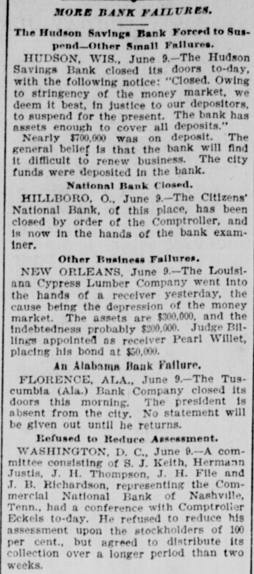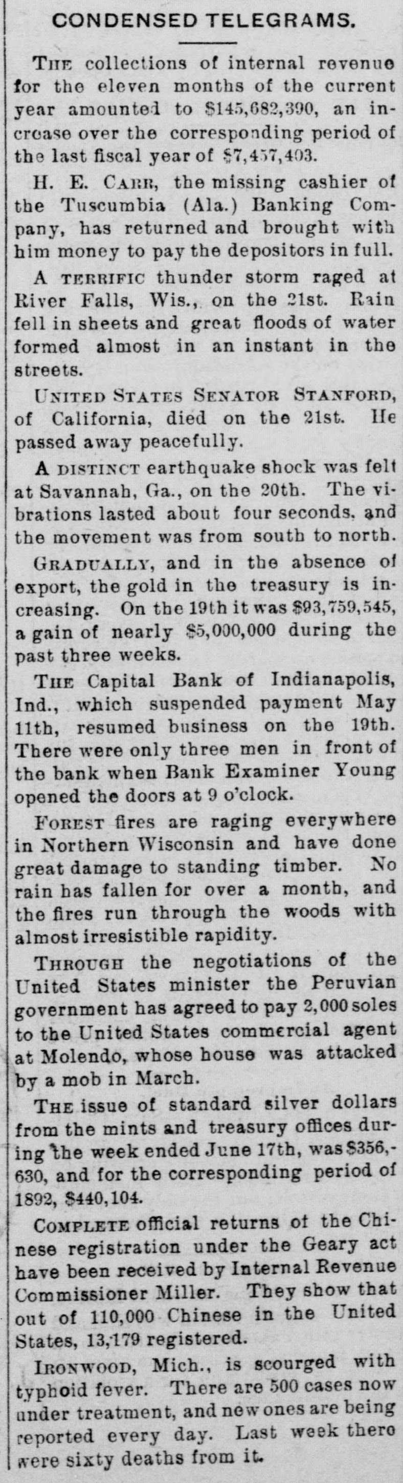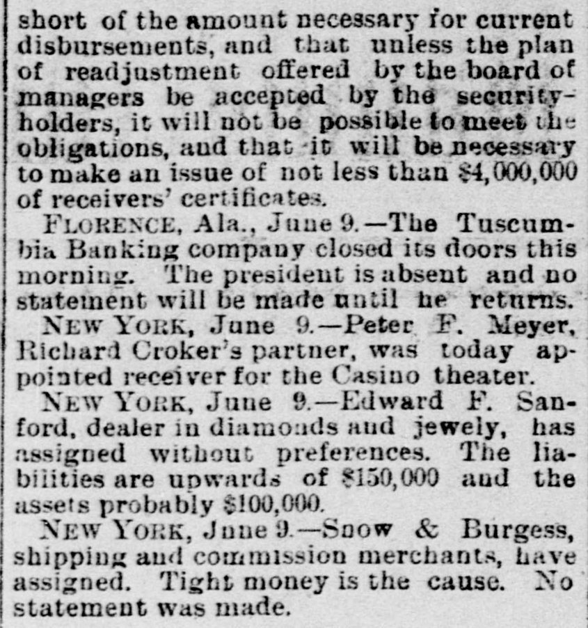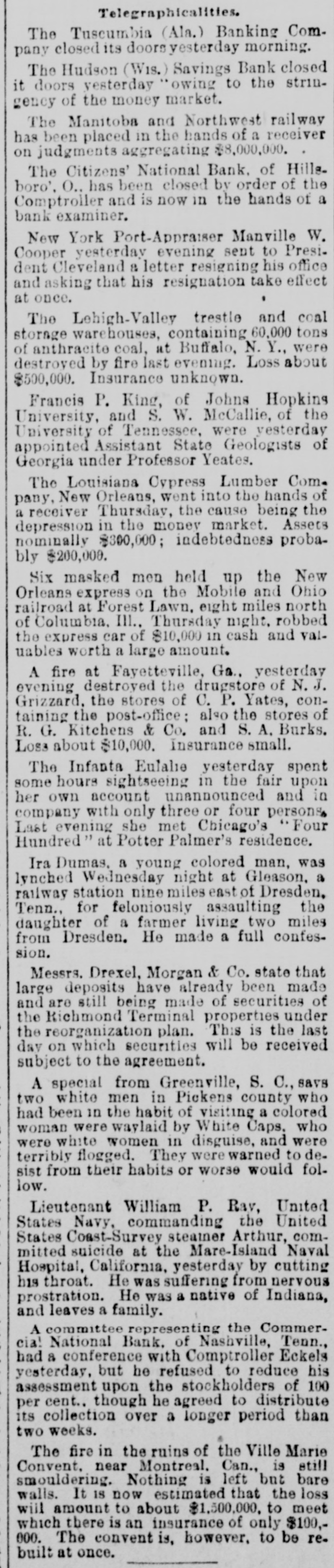 Telegraphicalities. The Tuscumbia (Ala.) Banking Company closed its doorsyesterday morning. The Hudson (Wis.) Savings Bank closed it doors yesterday owing to the stringency of the money market. The Manitoba and Northwest railway has been placed in the hands of a receiver on judgments aggregating $8,000,000. The Citizens' National Bank, of Hills. boro', O., has been closed by order of the Comptroller and is now in the hands of a bank examiner. New York Port-Appraiser Manville W. Cooper yesterday evening sent to Presi. dent Cleveland a letter resigning his office and asking that his resignation take effect at once. The Lehigh-Valley trestle and coal storage warehouses, containing 60,000 tons of anthracite coal, at Buffalo, N. Y., were destroyed by fire last evening. Loss about $500,000. Insurance unknown. Francis P. King, of Johns Hopkins University, and S. W. McCallie, of the University of Tennessee, were yesterday appointed Assistant State Geologists of Georgia under Professor Yeates. The Louisiana Cypress Lumber Com. pany, New Orleans, went into the hands of a receiver Thursday, the cause being the depression in the money market. Assets nominally $300,000; indebtedness probably $200,000. Six masked men held up the New Orleans express on the Mobile and Ohio railroad at Forest Lawn, eight miles north of Columbia, III.. Thursday night. robbed the express car of $10,000 in cash and valuables worth a large amount. A fire at Fayetteville, Ga. yesterday evening destroyed the drugstore of N. Grizzard, the stores of C. P. Yates, containing the post-office: also the stores of R. G. Kitchens & Co. and S. A. Burks. Loss about $10,000. Insurance small. The Infanta Eulalie yesterday spent some hours sightseeing in the fair upon her own account unannounced and in company with only three or four persons Last evening she met Chicago's Four Hundred" at Potter Palmer's residence. Ira Dumas, a young colored man, was lynched Wednesday night at Gleason, a railway station nine miles east of Dresden. Tenn., for feloniously assaulting the daughter of a farmer living two miles from Dresden. He made a full confession. Messrs. Drexel, Morgan & Co. state that large deposits have already been made and are still being made of securities of the Richmond Terminal properties under the reorganization plan. This is the last day on which securities will be received subject to the agreement. A special from Greenville, S. C., savs two white men in Pickens county who had been in the habit of visiting a colored woman were waylaid by White Caps. who were white women in disguise, and were terribly flogged. They were warned to desist from their habits or worse would fol. low. Lieutenant William P. Rav. United States Navy, commanding the United States Coast-Survey steatner Arthur, committed suicide at the Mare-Island Naval Hospital, California, yesterday by cutting throat. He was suffering from nervous prostration. He was a native of Indiana, and leaves a family. A committee representing the Commercia! National Bank. of Nashville, Tenn., had a conference with Comptroller Eckels yesterday, but he refused to reduce his assessment upon the stockholders of 100 per cent.. though he agreed to distribute its collection over a longer period than two weeks. The fire in the ruins of the Ville Marie Convent. near Montreal. Can., is still smouldering. Nothing is left but bare walls. It IS now estimated that the loss will amount to about $1,500,000. to meet which there is an insurance of only $100,000. The convent is, however, to be re. built at once.