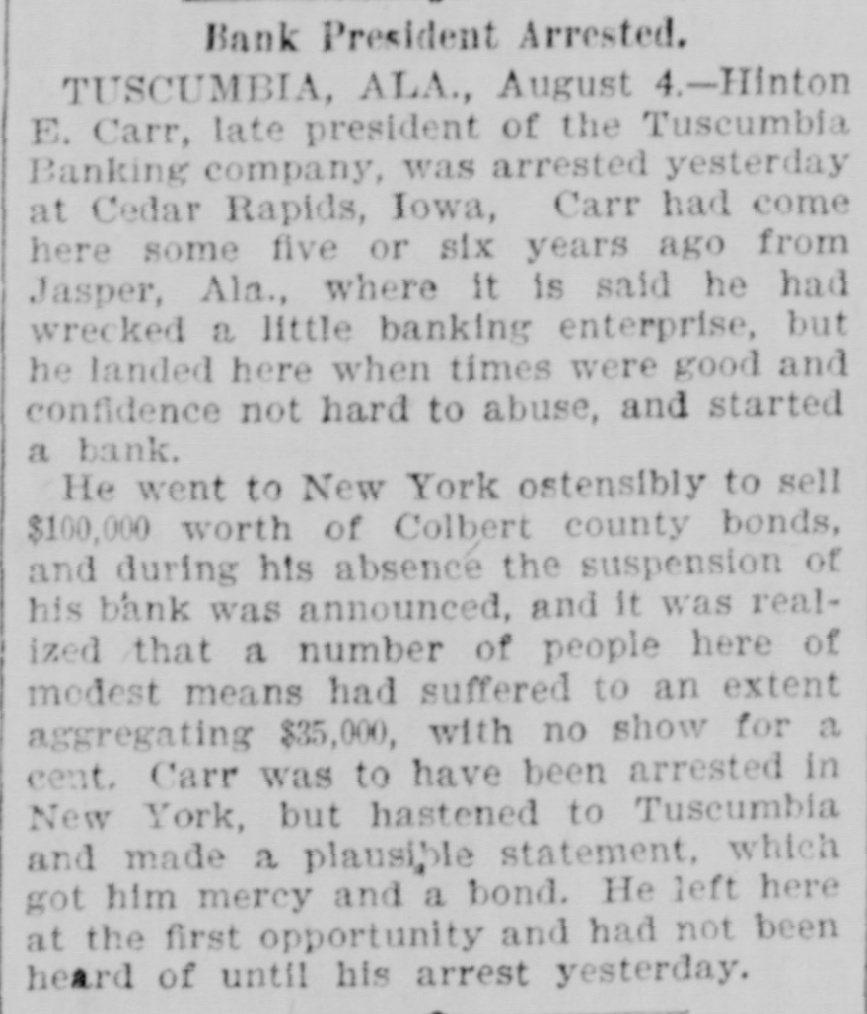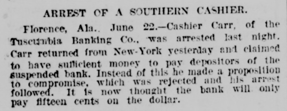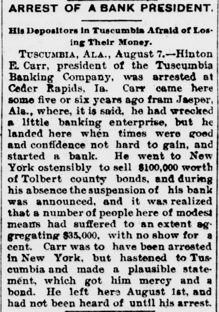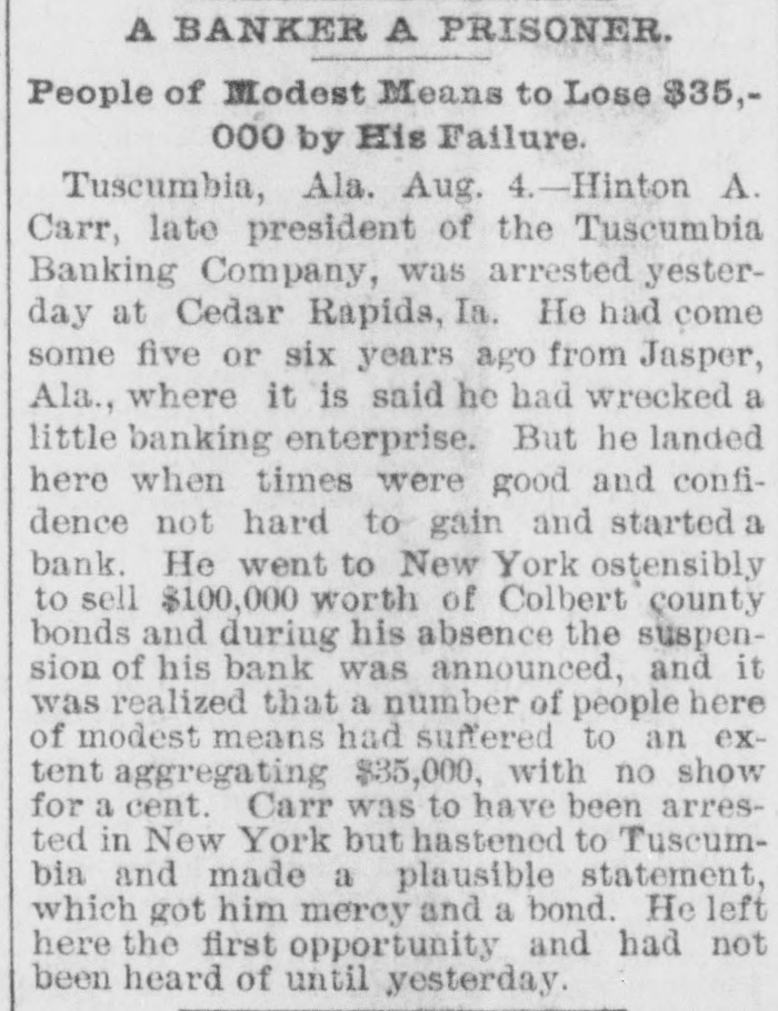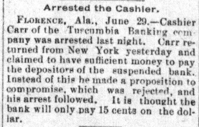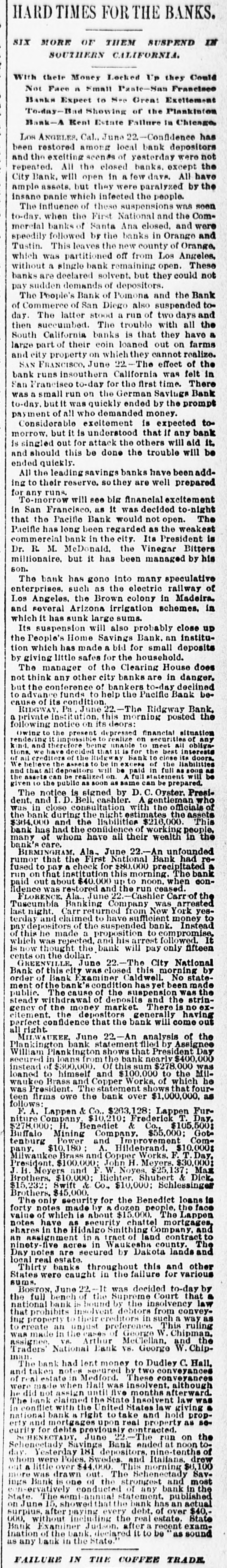 Telegraphicalities. The Tuscumbia (Ala.) Banking Company closed its doorsyesterday morning. The Hudson (Wis.) Savings Bank closed it doors yesterday owing to the stringency of the money market. The Manitoba and Northwest railway has been placed in the hands of a receiver on judgments aggregating $8,000,000. The Citizens' National Bank, of Hills. boro', O., has been closed by order of the Comptroller and is now in the hands of a bank examiner. New York Port-Appraiser Manville W. Cooper yesterday evening sent to Presi. dent Cleveland a letter resigning his office and asking that his resignation take effect at once. The Lehigh-Valley trestle and coal storage warehouses, containing 60,000 tons of anthracite coal, at Buffalo, N. Y., were destroyed by fire last evening. Loss about $500,000. Insurance unknown. Francis P. King, of Johns Hopkins University, and S. W. McCallie, of the University of Tennessee, were yesterday appointed Assistant State Geologists of Georgia under Professor Yeates. The Louisiana Cypress Lumber Com. pany, New Orleans, went into the hands of a receiver Thursday, the cause being the depression in the money market. Assets nominally $300,000; indebtedness probably $200,000. Six masked men held up the New Orleans express on the Mobile and Ohio railroad at Forest Lawn, eight miles north of Columbia, III.. Thursday night. robbed the express car of $10,000 in cash and valuables worth a large amount. A fire at Fayetteville, Ga. yesterday evening destroyed the drugstore of N. Grizzard, the stores of C. P. Yates, containing the post-office: also the stores of R. G. Kitchens & Co. and S. A. Burks. Loss about $10,000. Insurance small. The Infanta Eulalie yesterday spent some hours sightseeing in the fair upon her own account unannounced and in company with only three or four persons Last evening she met Chicago's Four Hundred" at Potter Palmer's residence. Ira Dumas, a young colored man, was lynched Wednesday night at Gleason, a railway station nine miles east of Dresden. Tenn., for feloniously assaulting the daughter of a farmer living two miles from Dresden. He made a full confession. Messrs. Drexel, Morgan & Co. state that large deposits have already been made and are still being made of securities of the Richmond Terminal properties under the reorganization plan. This is the last day on which securities will be received subject to the agreement. A special from Greenville, S. C., savs two white men in Pickens county who had been in the habit of visiting a colored woman were waylaid by White Caps. who were white women in disguise, and were terribly flogged. They were warned to desist from their habits or worse would fol. low. Lieutenant William P. Rav. United States Navy, commanding the United States Coast-Survey steatner Arthur, committed suicide at the Mare-Island Naval Hospital, California, yesterday by cutting throat. He was suffering from nervous prostration. He was a native of Indiana, and leaves a family. A committee representing the Commercia! National Bank. of Nashville, Tenn., had a conference with Comptroller Eckels yesterday, but he refused to reduce his assessment upon the stockholders of 100 per cent.. though he agreed to distribute its collection over a longer period than two weeks. The fire in the ruins of the Ville Marie Convent. near Montreal. Can., is still smouldering. Nothing is left but bare walls. It IS now estimated that the loss will amount to about $1,500,000. to meet which there is an insurance of only $100,000. The convent is, however, to be re. built at once.