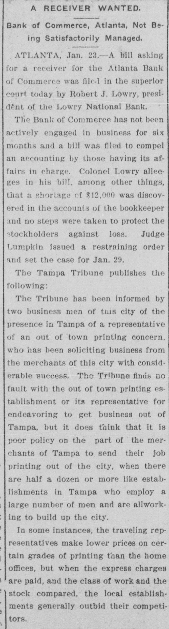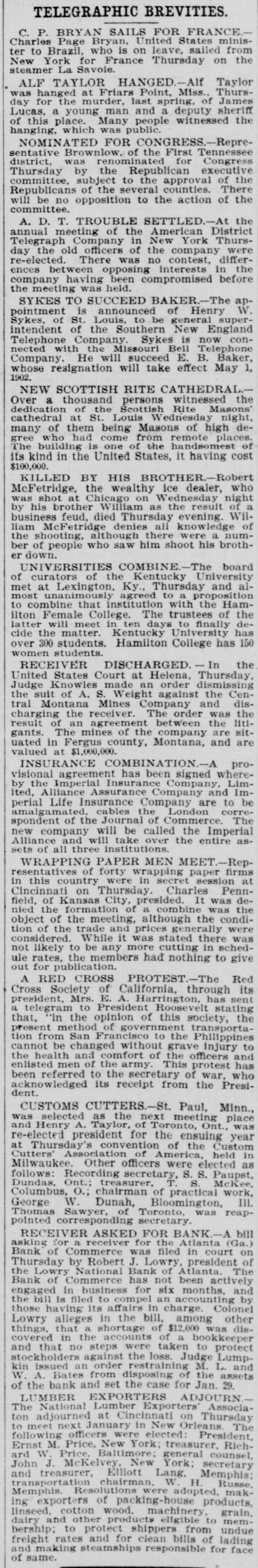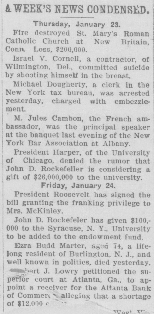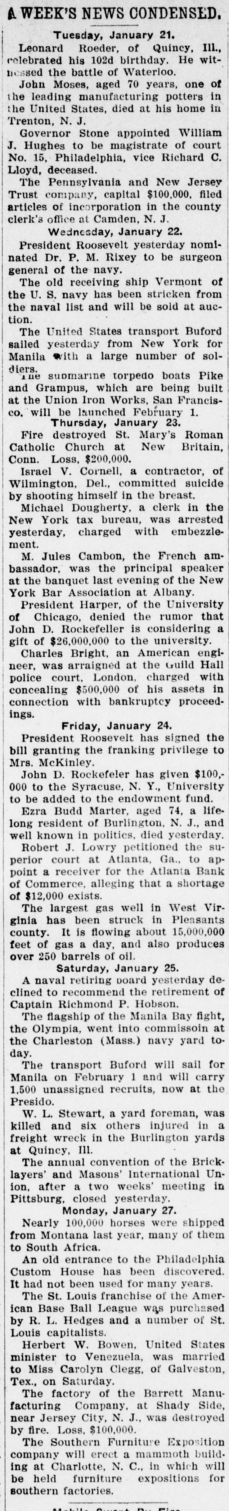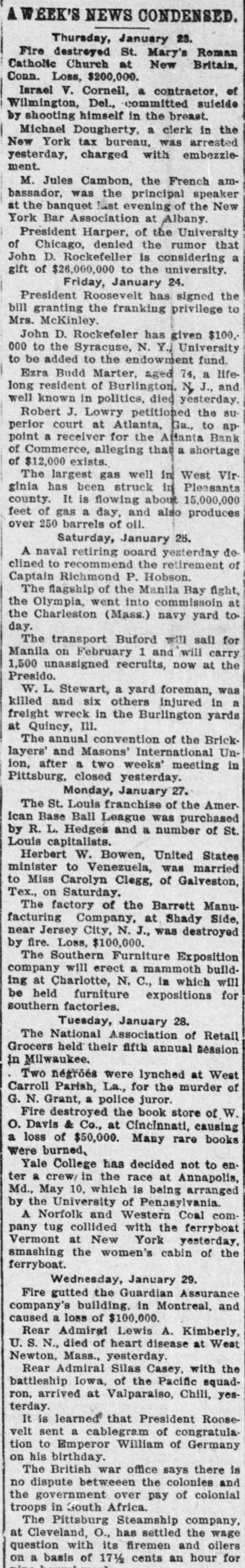 AWEEK'S NEWS CONDENSED. Thursday, January 23. Fire destroyed St. Mary's Roman CathoNe Church at New Britain, Conn. Loss, $200,000. Israel V. Corneil, a contractor, of Wilmington, Del., committed suicide by shooting himself in the breast. Michael Dougherty, a clerk in the New York tax bureau, was arrested yesterday, charged with embezziement. M. Jules Cambon, the French ambassador, was the principal speaker at the banquet last evening of the New York Bar Association at Albany President Harper, of the University of Chicago, denied the rumor that John D. Rockefeller is considering a gift of $26,000,000 to the university. Friday, January 24. President Roosevelt has signed the bill granting the franking privilege to Mrs. McKinley. John D. Rockefeler has given $100. 000 to the Syracuse, N. Y., University to be added to the endowment fund. Ezra Budd Marter, aged 74, a lifelong resident of Burlington, N J., and well known in politics, died yesterday. Robert J. Lowry petitioned the superior court at Atlanta, Ga., to ap point a receiver for the Atlanta Bank of Commerce, alleging that a shortage of $12,000 exists. The largest gas well in West Virginia has been struck in Pleasants county. It is flowing about 15,000,000 feet of gas a day, and also produces over 250 barrels of oil. Saturday, January 25. A naval retiring board yesterday de clined to recommend the retirement of Captain Richmond P. Hobson. The flagship of the Manila Bay fight, the Olympia, went into commission at the Charleston (Mass.) navy yard to day. The transport Buford will sail for Manila on February 1 and will carry 1,500 unassigned recruits, now at the Presido. W. L. Stewart, a yard foreman, was killed and six others injured in a freight wreck in the Burlington yards at Quincy, III. The annual convention of the Bricklayers' and Masons' International Union, after a two weeks' meeting in Pittsburg, closed yesterday. Monday, January 27. The St. Louis franchise of the American Base Ball League was purchased by R. L. Hedges and a number of St. Louis capitalists. Herbert W. Bowen, United States minister to Venezuela, was married to Miss Carolyn Clegg, of Galveston, Tex., on Saturday. The factory of the Barrett Manufacturing Company, at Shady Side, near Jersey City, N. J., was destroyed by fire. Loss, $100,000. The Southern Furniture Exposition will erect a ing N. C., company at Charlotte, mammoth in which build- will be held furniture expositions for southern factories. Tuesday, January 28. The National Association of Retail Grocers held their fifth annual session in Milwaukee. Two négrées were lynched at West Carroll Parish, La., for the murder of G. N. Grant, a police juror. Fire destroyed the book store of W. O. Davis & Co., at Cincinnati, causing a loss of $50,000. Many rare books were burned, Yale College has decided not to enter in the race at Annapolis, Md., which is by the a May crew/ University 10. of Penasylvania. being arranged and company collided with Vermont at New A Norfolk tug Western York the Coal yesterday, ferryboat smashing the women's cabin of the ferryboat. Wednesday, January 29. Fire gutted the Guardian Assurance company's building, in Montreal, and caused a loss of $100,000. Rear Admiral Lewis A. Kimberly, U.S.N., died of heart disease at West Newton, Mass., yesterday. Admiral Silas Casey, with the Iowa, of the battleship Rear Pacific Chili, squadron, arrived at Valparaiso, yesterday. It is learned that President Roosea William velt tion to sent Emperor cablegram of of congratula- Germany on his birthday. war office says is no betweeen the The dispute British colonies of colonial there and the government over pay troops in 3outh Africa. The Pittsburg Steamship company, at O., has wage with its firemen question Cleveland, settled and the hour oilers on a basis of 17 1/2 cents an for