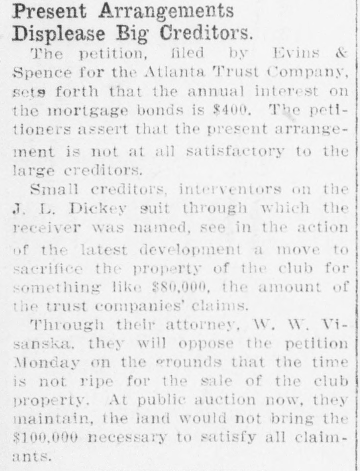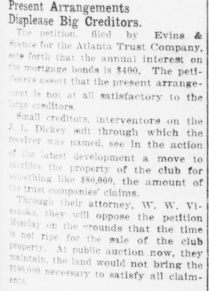 Present Arrangements Displease Big Creditors. The petition, filed by Evins & Spence for the Atlanta Trust Company, sets forth that the annual interest on the mortgage bonds is $400. The petitioners assert that the present arrangement is not at all satisfactory to the large creditors. Small creditors, interventors on the J. L. Dickey suit through which the receiver was named, see in the action of the latest development a move to sacrifice the property of the club for something like $80,000, the amount of the trust companies' claims. Through their attorney. W. W. Visanska. they will oppose the petition Monday on the grounds that the time is not ripe for the sale of the club property. At public auction now, they maintain, the land would not bring the $100,000 necessary to satisfy all claimants.