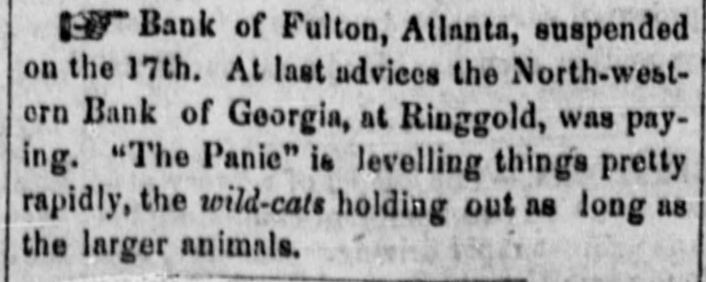 Bank of Fulton, Atlanta, suspended on the 17th. At last advices the North-westorn Bank of Georgia, at Ringgold, was paying. "The Panie" is levelling things pretty rapidly, the wild-cats holding out as long as the larger animals.