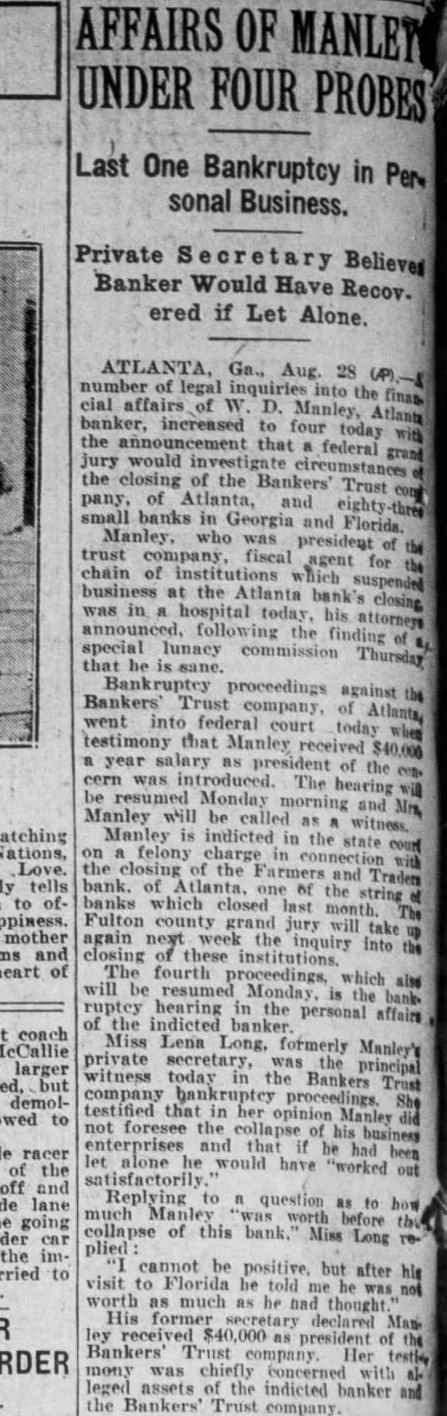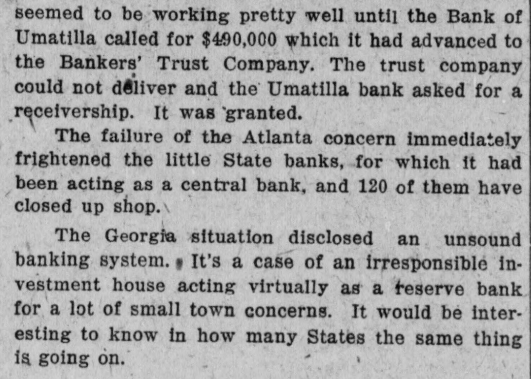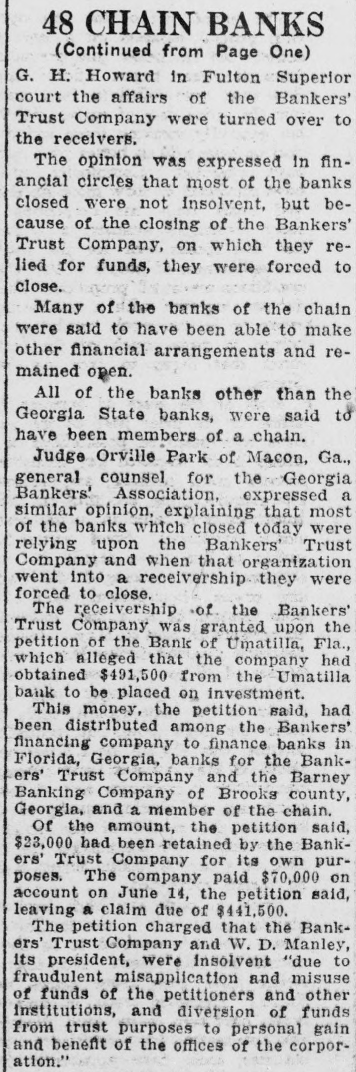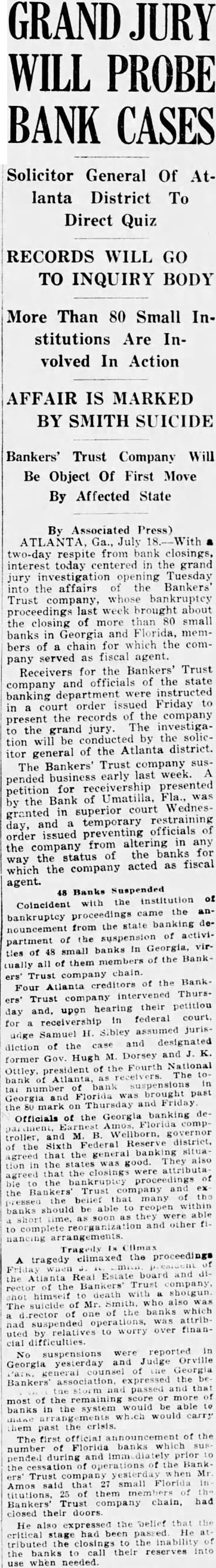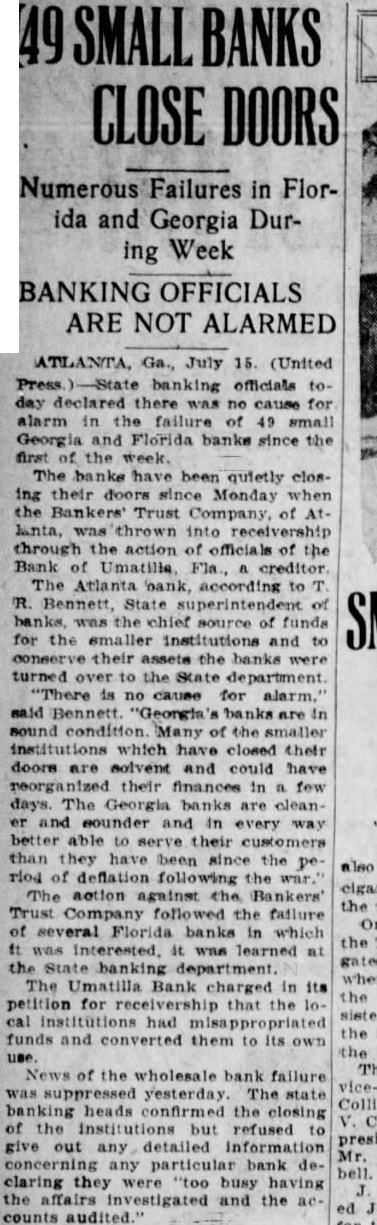 Failures in Florida and Georgia DurWeek BANKING OFFICIALS ARE NOT ALARMED ATLANTA, Ga., July 15. (United officials day declared there no for alarm the failure small Georgia and Florida banks since the the week. The banks have been quietly closing their doors since Monday when the Bankers' Trust Company, of Manta, thrown into receivership through the action officials of the Bank Umatille Fla., creditor The Atlanta bank, according to Bennett, State of banks. the source of funds the smaller institutions and to their assets the banks were turned over to the State department is no cause for alarm. sound condition Many of the institutions which have closed their doors are solvent and could have meorganized their finances in few days. The Georgia banks are clean sounder and better able their customers than they have been since the also riod of deflation following action against the Trust the failure of Florida banks which Interested, was learned the State department. where The Bank charged its petition for receivership that the sisted had funds and converted them to its own The the wholesale bank failure yesterday. banking heads the closing institutions refused detailed information concerning particular bank declaring busy having investigated and the counts audited.'