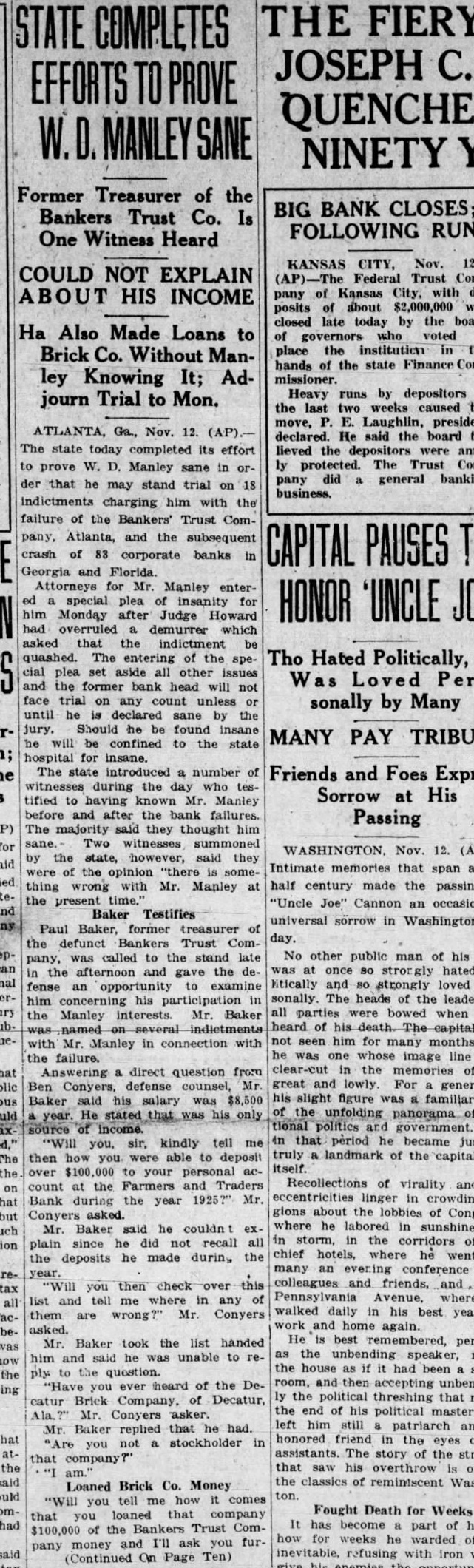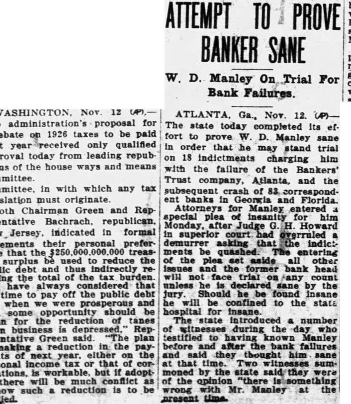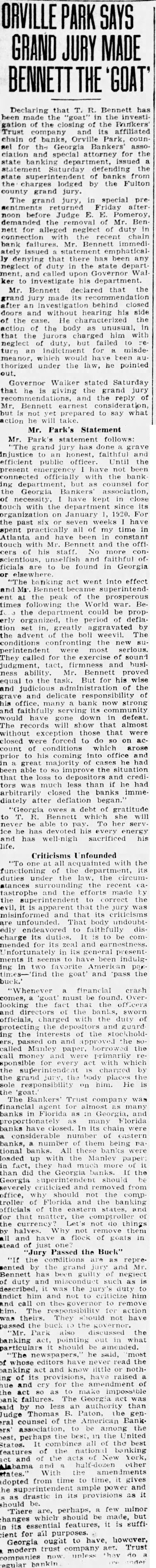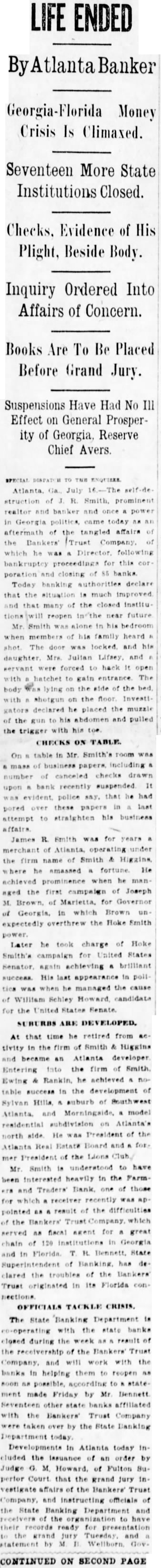 Failures in Florida and Georgia DurWeek BANKING OFFICIALS ARE NOT ALARMED ATLANTA, Ga., July 15. (United officials day declared there no for alarm the failure small Georgia and Florida banks since the the week. The banks have been quietly closing their doors since Monday when the Bankers' Trust Company, of Manta, thrown into receivership through the action officials of the Bank Umatille Fla., creditor The Atlanta bank, according to Bennett, State of banks. the source of funds the smaller institutions and to their assets the banks were turned over to the State department is no cause for alarm. sound condition Many of the institutions which have closed their doors are solvent and could have meorganized their finances in few days. The Georgia banks are clean sounder and better able their customers than they have been since the also riod of deflation following action against the Trust the failure of Florida banks which Interested, was learned the State department. where The Bank charged its petition for receivership that the sisted had funds and converted them to its own The the wholesale bank failure yesterday. banking heads the closing institutions refused detailed information concerning particular bank declaring busy having investigated and the counts audited.'