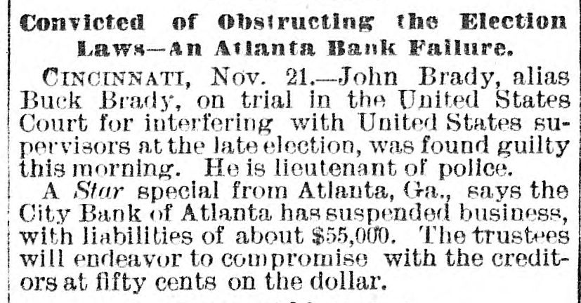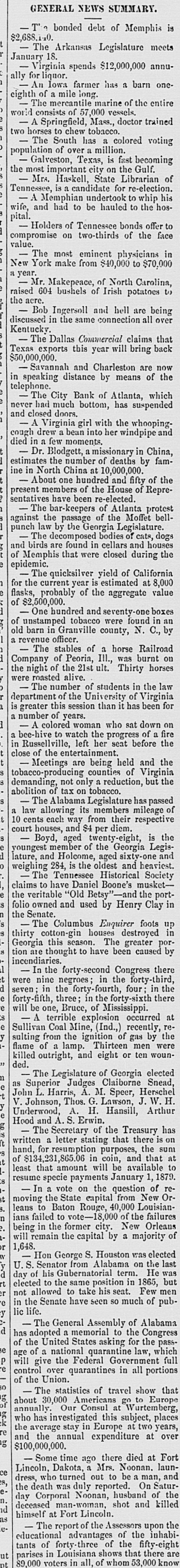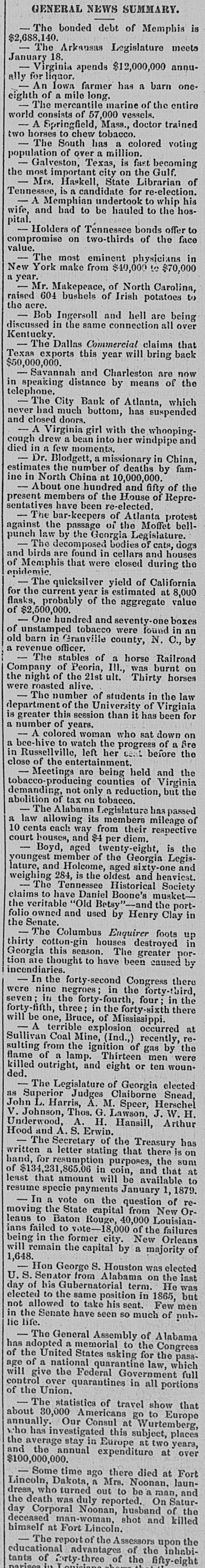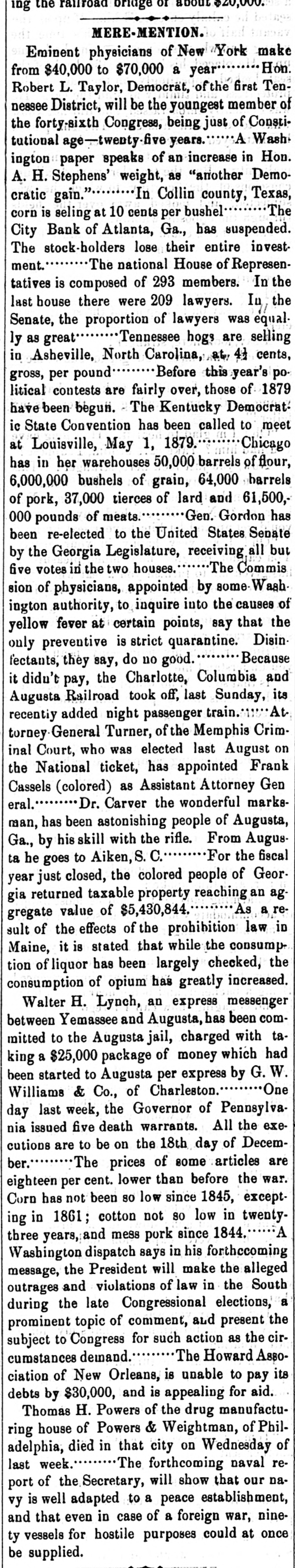 railroad the bridge ing MERE-MENTION. Eminent physicians of New York make Hon. from $40,000 to $70,000 a year Robert L. Taylor, Democrat, of the first Tennessee District, will be the youngest member of the forty-sixth Congress, being just of ConstiWash A tutional age-twenty-five years. ington paper speaks of an increase in Hon. A. H. Stephens' weight, as "another DemoIn Collin county, Texas, cratic gain. The corn is seling at 10 cents per bushel City Bank of Atlanta, Ga., has suspended. The stock-holders lose their entire investment. The national House of Representatives is composed of 293 members. In the last house there were 209 lawyers. In the Senate, the proportion of lawyers was equalTennessee hogs are selling ly as great in Asheville, North Carolina, at, 41 cents, Before this year's pogross, per pound litical contests are fairly over, those of 1879 have been begun. - The Kentucky Democratic State Convention has been called to meet Chicago at Louisville, May 1, 1879. has in her warehouses 50,000 barrels of flour, 6,000,000 bushels of grain, 64,000 barrels of pork, 37,000 tierces of lard and 61,500,Gen. Gordon has 000 pounds of meats. been re-elected to the United States Senate by the Georgia Legislature, receiving all but The Commis five votes in the two houses. sion of physicians, appointed by some- Wash ington authority, to inquire into the causes of yellow fever at certain points, say that the only preventive is strict quarantine. DisinBecause fectants, they say, do no good. it didn't pay, the Charlotte, Columbia and Augusta Railroad took off, last Sunday, its Atrecently added night passenger train torney Turner, of the Memphis Criminal Court, who was elected last August on the National ticket, has appointed Frank Cassels (colored) as Assistant Attorney Gen Dr. Carver the wonderful markseral. man, has been astonishing people of Augusta, Ga., by his skill with the rifle. From AugusFor the fiscal ta he goes to Aiken, S. C. year just closed, the colored people of Georgia returned taxable property reaching an agAs a regregate value of $5,430,844. sult of the effects of the prohibition law in Maine, it is stated that while the consumption of liquor has been largely checked, the consumption of opium has greatly increased. Walter H. Lynch, an express messenger between Yemassee and Augusta, has been committed to the Augusta jail, charged with taking a $25,000 package of money which had been started to Augusta per express by G. W. One Williams & Co., of Charleston. day last week, the Governor of Pennsylvania issued five death warrants. All the executions are to be on the 18th day of December. The prices of some articles are eighteen per cent. lower than before the war. Corn has not been 80 low since 1845, excepting in 1861 cotton not S0 low in twentyA three years, and mess pork since 1844. Washington dispatch says in his forthecoming message, the President will make the alleged outrages and violations of law in the South during the late Congressional elections, a prominent topic of comment, and present the subject to Congress for such action as the cirThe Howard Assocumstances demand ciation of New Orleans, is unable to pay its debts by $30,000, and is appealing for aid. Thomas H. Powers of the drug manufacturing house of Powers & Weightman, of Philadelphia, died in that city on Wednesday of last week. The forthcoming naval report of the Secretary, will show that our navy is well adapted to a peace establishment, and that even in case of a foreign war, ninety vessels for hostile purposes could at once be supplied.