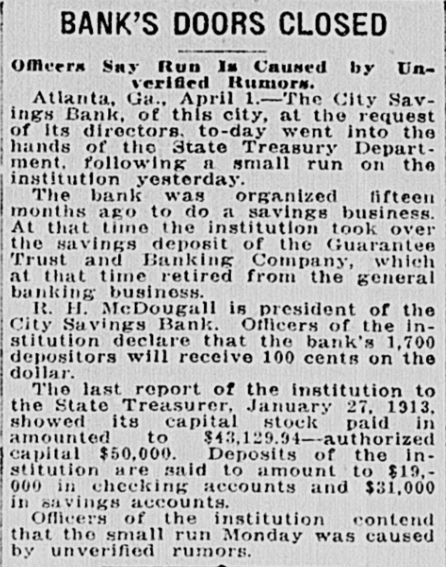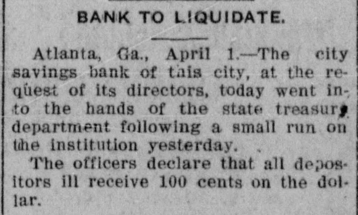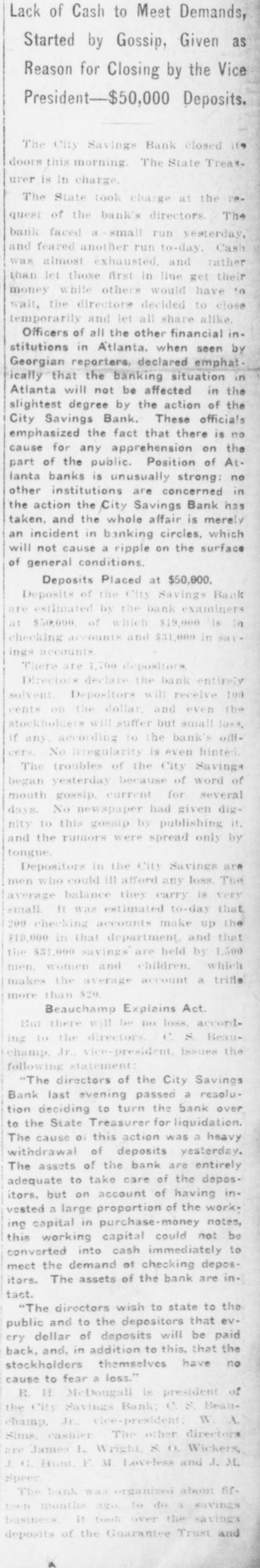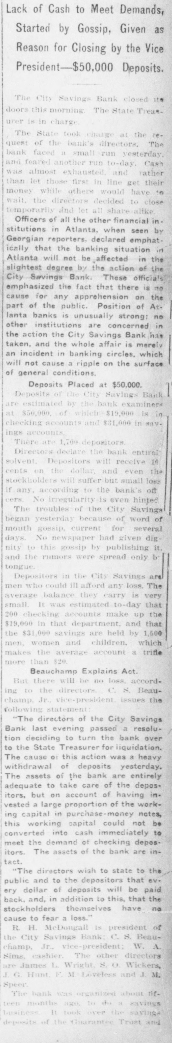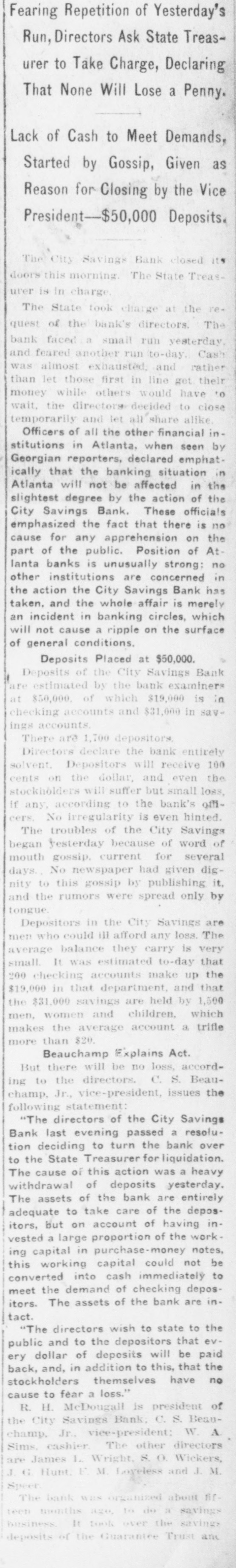 Started by Gossip, Given as Reason for Closing by the Vice President-$50,000 Deposits. The City Savings Bank closed its doors this morning The State Treasurer is in charge The State took charge at the request of the bank's directors. The bank faced a small run yesterday. and feared another run to-day. Cash was almost exhausted. and rather than let those first in line get their money while others would have to wait. the directors decided to close temporarily and let all share alike Officers of all the other financial institutions in Atlanta, when seen by Georgian reporters, declared emphatically that the banking situation in Atlanta will not be affected in the slightest degree by the action of the City Savings Bank. These officials emphasized the fact that there is no cause for any apprehension on the part of the public. Position of At. lanta banks is unusually strong: no other institutions are concerned in the action the City Savings Bank has taken, and the whole affair is merely an incident in banking circles. which will not cause a ripple on the surface of general conditions. Deposits Placed at $50,000. Deposits of the City Savings Bank are estimated by the bank examiners at $50,000. of which $19,000 is in checking accounts and $31,000 in savings accounts, There are 1,700 depositors. Directors declare the bank entirel solvent. Depositors will receive 10 cents on the dollar, and even the stockholders will suffer but small loss if any, according to the bank's off cers. No irregularity is even hinted The troubles of the City Savings began yesterday because of word of mouth gossip, current for several days. No newspaper had given dignity to this gossip by publishing it. and the rumors were spread only b' tongue. Depositors in the City Savings are men who could ill afford any loss. The average balance they carry is very small. It was estimated to-day that 200 checking accounts make up the $19,000 in that department, and that the $31,000 savings are held by 1,500 men, women and children. which makes the average account a trifle more than $20. Beauchamp Explains Act. But there will be no loss, according to the directors. C. S. Beauchamp. Jr., vice-president. issues the following statement "The directors of the City Savings Bank last evening passed a resolution deciding to turn the bank over to the State Treasurer for liquidation. The cause 01 this action was a heavy withdrawal of deposits yesterday. The assets of the bank are entirely adequate to take care of the depositors, but on account of having invested a large proportion of the working capital in purchase-money notes, this working capital could not be converted into cash immediately to meet the demand of checking depositors. The assets of the bank are intact. "The directors wish to state to the public and to the depositors that every dollar of deposits will be paid back, and, in addition to this, that the stockholders themselves have no cause to fear a loss." R. H. McDougall is president of the City Savings Bank; C. S. Beauchamp, Jr., vice-president; W. A. Sims, cashier. The other directors are James L. Wright, S. O. Wickers,