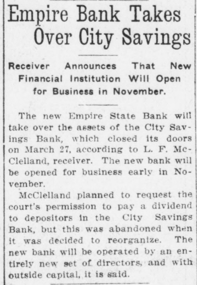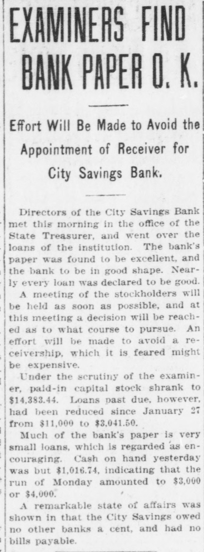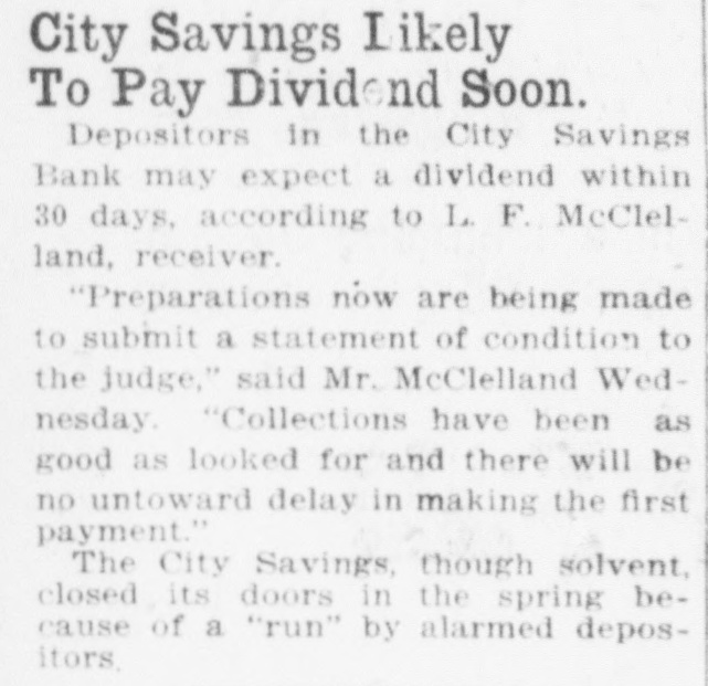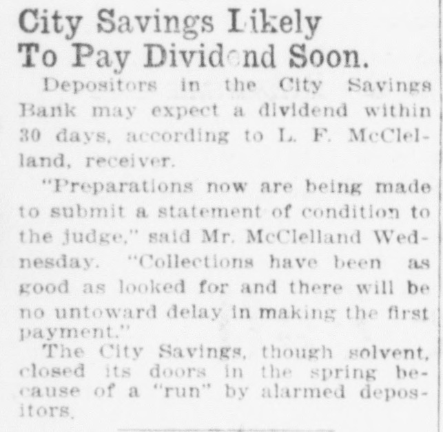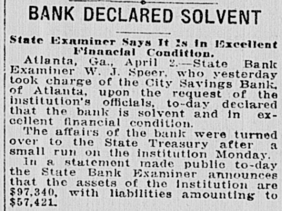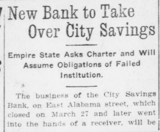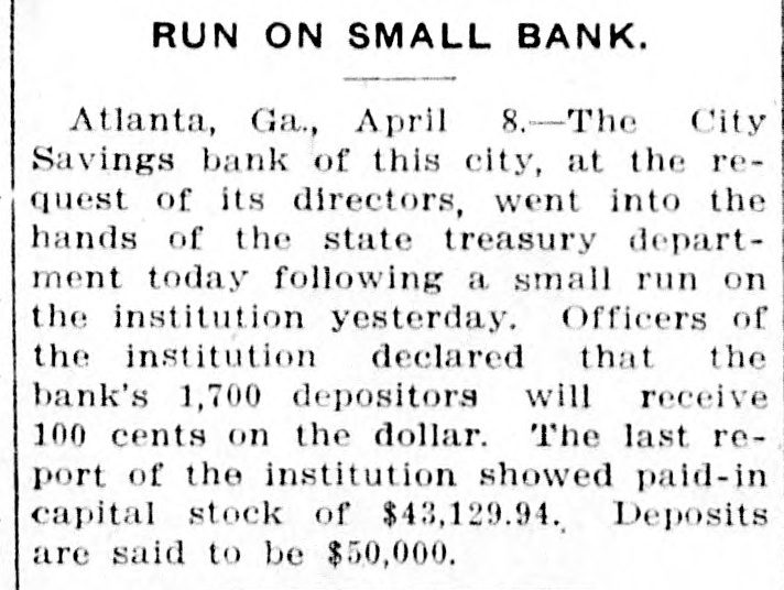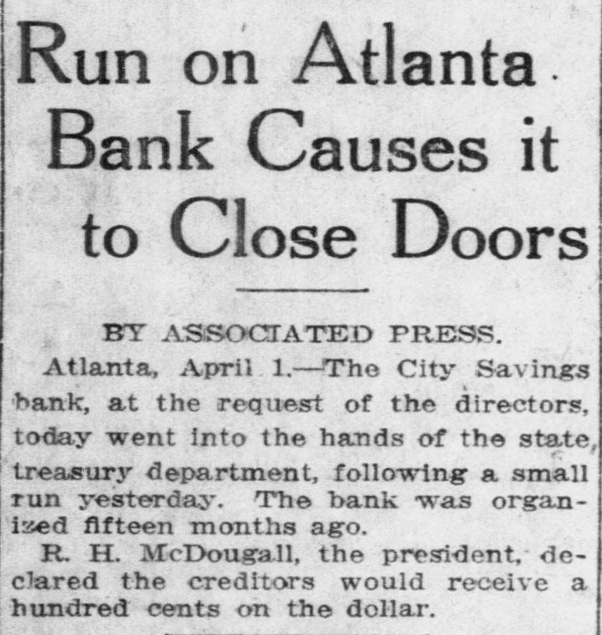 Started by Gossip, Given as Reason for Closing by the Vice President-$50,000 Deposits. The City Savings Bank closed its doors this morning The State Treasurer is in charge The State took charge at the request of the bank's directors. The bank faced a small run yesterday. and feared another run to-day. Cash was almost exhausted. and rather than let those first in line get their money while others would have to wait. the directors decided to close temporarily and let all share alike Officers of all the other financial institutions in Atlanta, when seen by Georgian reporters, declared emphatically that the banking situation in Atlanta will not be affected in the slightest degree by the action of the City Savings Bank. These officials emphasized the fact that there is no cause for any apprehension on the part of the public. Position of At. lanta banks is unusually strong: no other institutions are concerned in the action the City Savings Bank has taken, and the whole affair is merely an incident in banking circles. which will not cause a ripple on the surface of general conditions. Deposits Placed at $50,000. Deposits of the City Savings Bank are estimated by the bank examiners at $50,000. of which $19,000 is in checking accounts and $31,000 in savings accounts, There are 1,700 depositors. Directors declare the bank entirel solvent. Depositors will receive 10 cents on the dollar, and even the stockholders will suffer but small loss if any, according to the bank's off cers. No irregularity is even hinted The troubles of the City Savings began yesterday because of word of mouth gossip, current for several days. No newspaper had given dignity to this gossip by publishing it. and the rumors were spread only b' tongue. Depositors in the City Savings are men who could ill afford any loss. The average balance they carry is very small. It was estimated to-day that 200 checking accounts make up the $19,000 in that department, and that the $31,000 savings are held by 1,500 men, women and children. which makes the average account a trifle more than $20. Beauchamp Explains Act. But there will be no loss, according to the directors. C. S. Beauchamp. Jr., vice-president. issues the following statement "The directors of the City Savings Bank last evening passed a resolution deciding to turn the bank over to the State Treasurer for liquidation. The cause 01 this action was a heavy withdrawal of deposits yesterday. The assets of the bank are entirely adequate to take care of the depositors, but on account of having invested a large proportion of the working capital in purchase-money notes, this working capital could not be converted into cash immediately to meet the demand of checking depositors. The assets of the bank are intact. "The directors wish to state to the public and to the depositors that every dollar of deposits will be paid back, and, in addition to this, that the stockholders themselves have no cause to fear a loss." R. H. McDougall is president of the City Savings Bank; C. S. Beauchamp, Jr., vice-president; W. A. Sims, cashier. The other directors are James L. Wright, S. O. Wickers,
