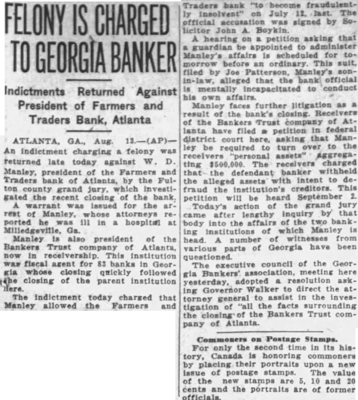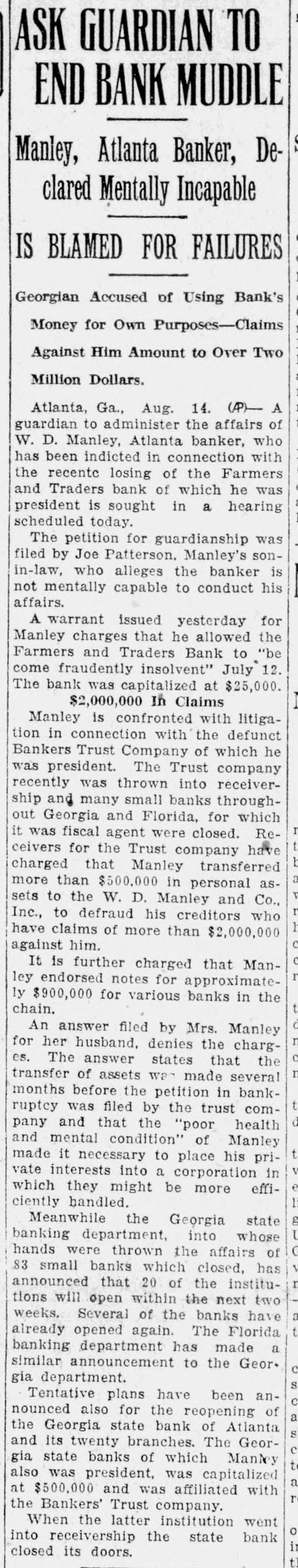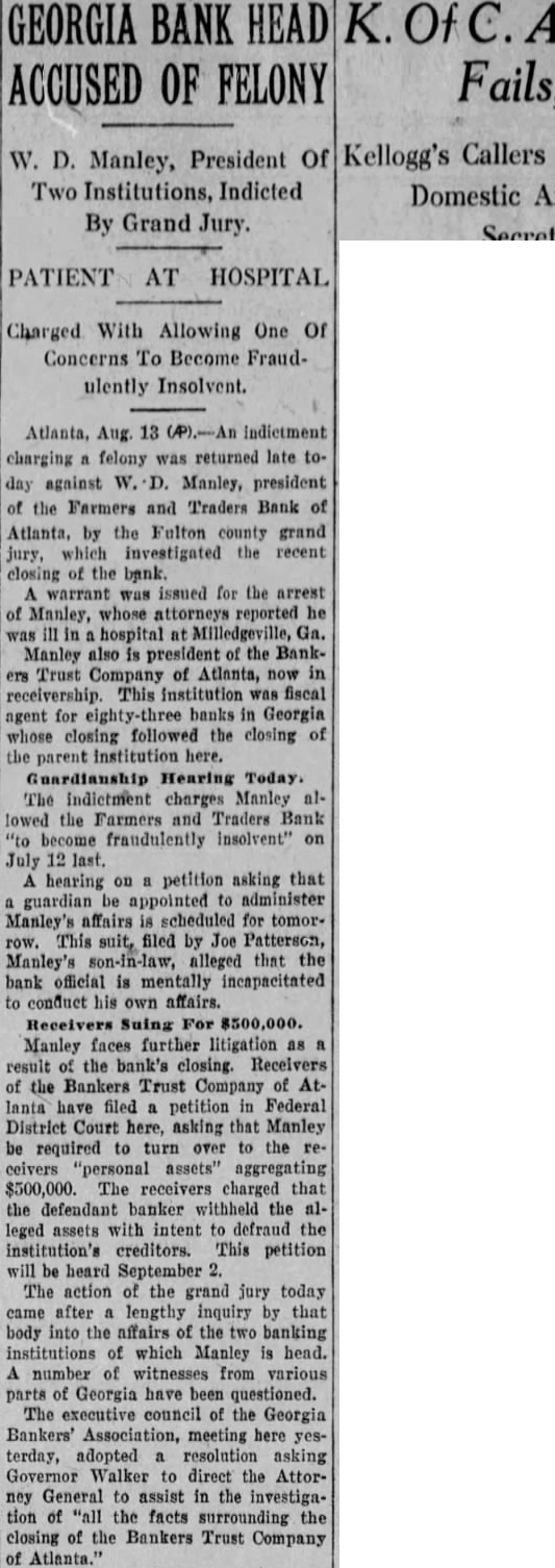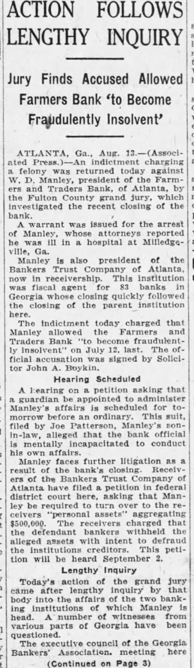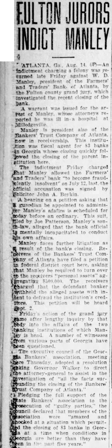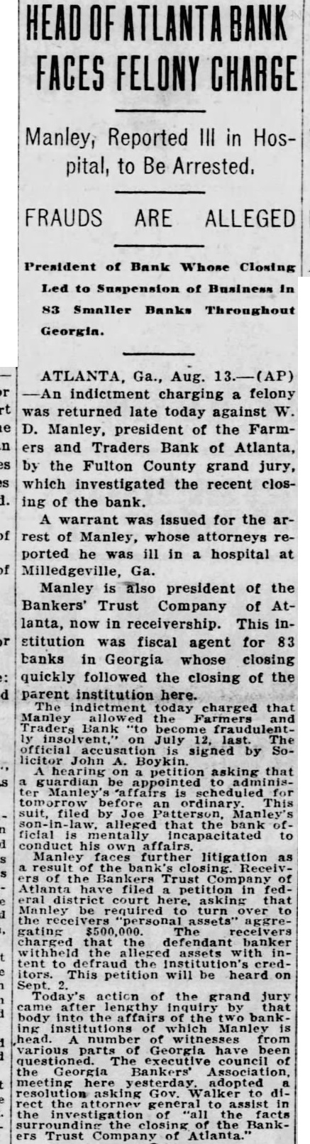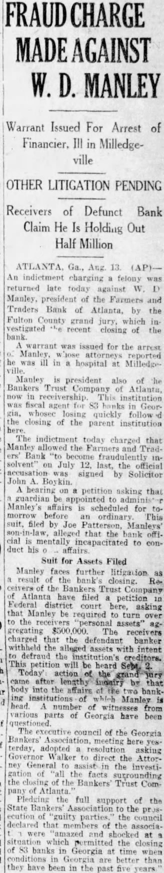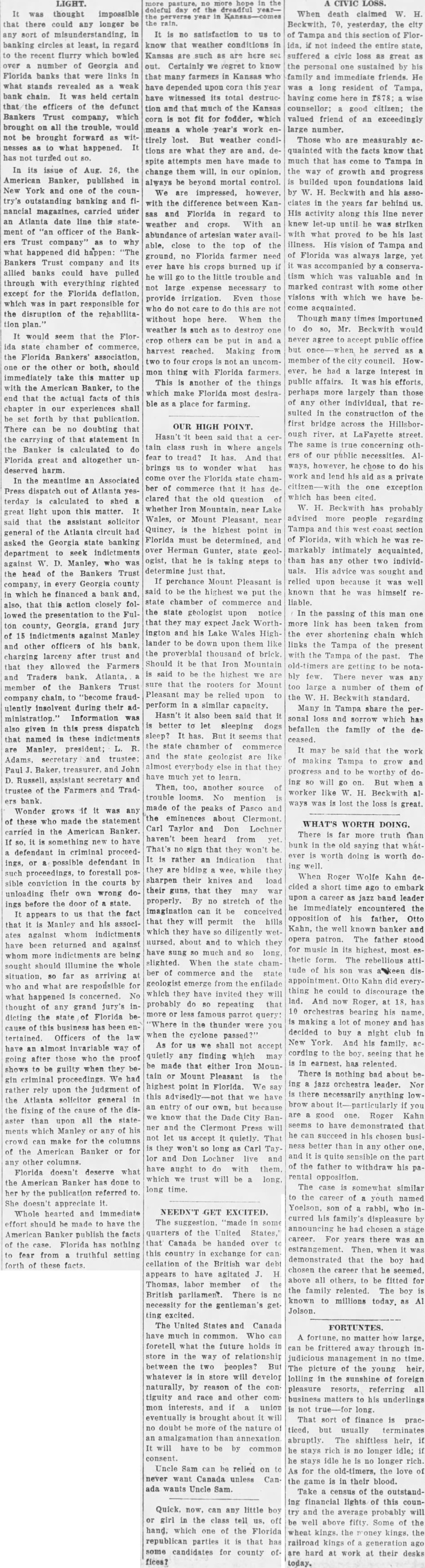 LIGHT. thought impossible that there could any longer of at least, in regard to the recent flurry which bowled over number Georgia and Florida banks that were links what stands revealed weak bank chain. held certain officers the defunct Bankers Trust company, which brought all the trouble, would not brought forward nesses what happened. has turned out In its issue of Aug. 26, the Banker, published New York and of the counoutstanding banking and nancial magazines, carried under an Atlanta date line this of officer of the BankTrust company" to why what happened did happen: Bankers Trust company and allied could have pulled through everything righted except Florida which was part responsible for the disruption of the rehabilita- would seem that the ida state chamber of commerce, the Florida Bankers' association, the other or both, should immediately take matter up the American Banker, to the end that the actual facts of this chapter our experiences shall set by that publication. There no doubting that the carrying that statement in the Banker calculated to do Florida great and altogether deserved harm. In meantime an Associated Press Atlanta terday calculated to shed great light upon this matter. said that the assistant solicitor general Atlanta circuit had asked the Georgia state banking department indictments against Manley, the head of the Bankers Trust company, in every Georgia county which he financed bank and, also, that this action closely followed the presentation to the Fulton county, Georgia, grand jury indictments against Manley and other officers of his bank. charging larceny after trust and that they allowed the Farmers and Traders Atlanta, member of the Bankers Trust chain, fraudulently insolvent during their ministration." Information also given this press dispatch named in these indictments are Manley, Adams, trustee: Paul Baker, and John Russell, assistant secretary and trustee the Farmers and Tradbank. Wonder grows if any these who the statement carried in the American Banker. something have defendant in criminal proceedings, possible defendant such proceedings, to forestall conviction in the courts by unloading their wrong before door of state. that the fact appears that Manley and his associates against whom indictments have been returned and against more indictments are being sought should illumine the whole far as arriving and what are responsible happened concerned. No thought any grand jury's dicting the state Florida business tertained. Officers the an almost invariable way going after those who the proof shows to guilty they criminal proceedings We rather upon the judgment the Atlanta solicitor general fixing the cause of the aster than upon all the statements which Manley any crowd make the columns the American Banker or for other columns. Florida doesn't deserve what the American Banker has done her by the publication referred She appreciate Whole and immediate should made have the American Banker the facts the Florida nothing fear from truthful setting forth these facts. no satisfaction to know that weather conditions in Kansas such are here out. Certainly regret to know that many farmers in Kansas who have depended upon this year have witnessed its total destruction and that much the Kansas not fit for fodder, which means whole year's work tirely lost. But weather conditions are what they are and, spite attempts men have made change them our opinion, always be beyond mortal control. impressed, however, the difference sas and Florida in regard weather crops. With abundance artesian water able, close the top of the ground, no Florida farmer need have his crops burned he the little trouble and not large expense necessary provide irrigation. Even those do to do without hope here. the such others can be in and harvest reached. Making from not an uncomthing with Florida farmers. This another of the things which make Florida most desiraplace for farming.