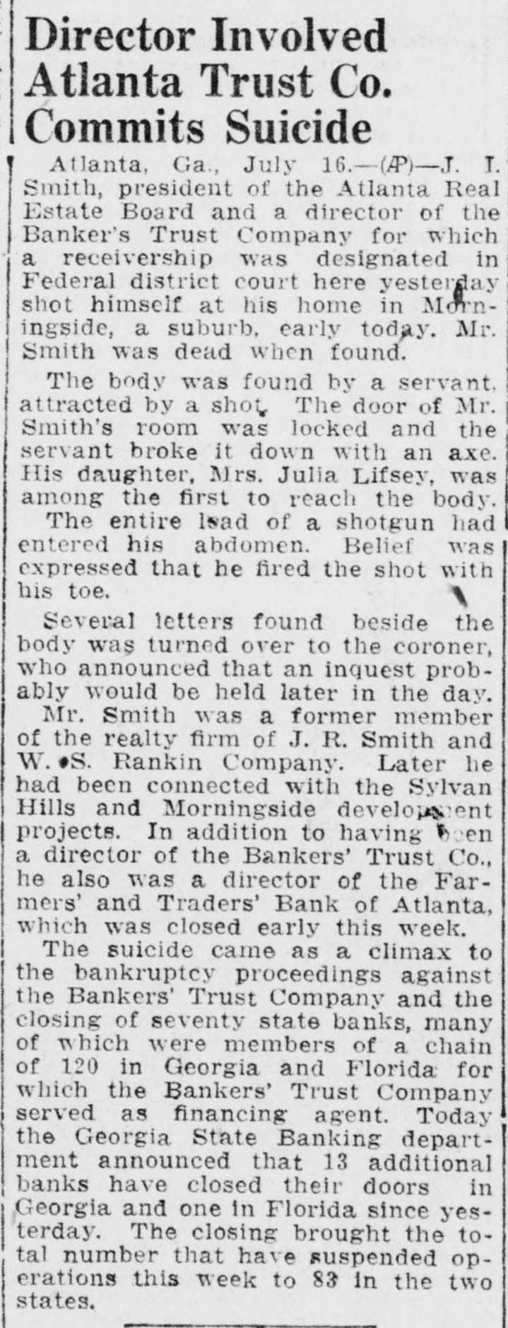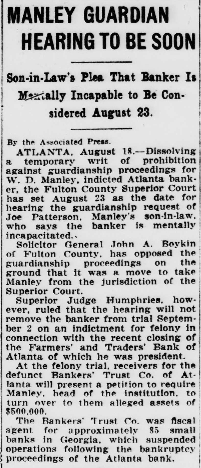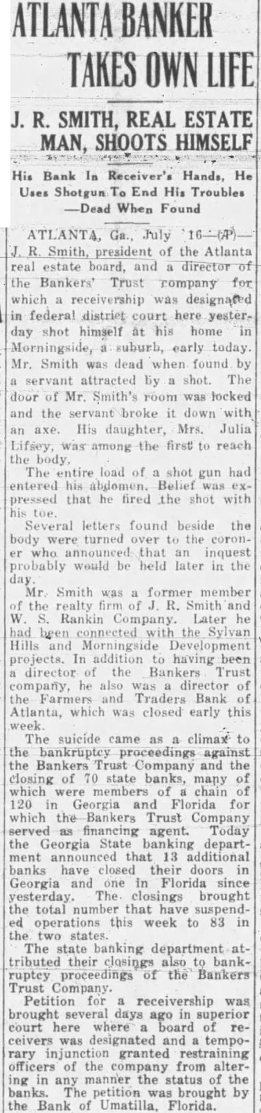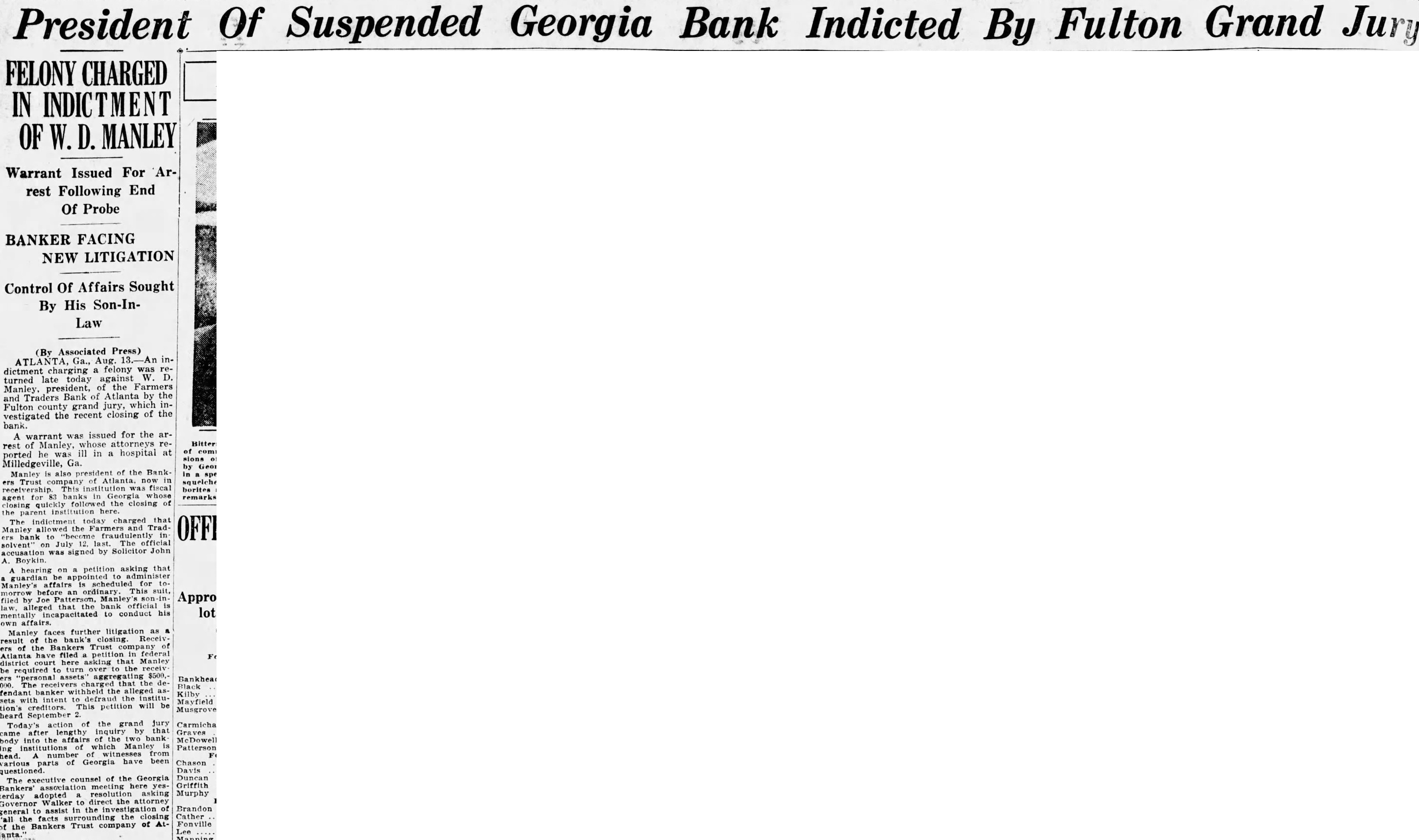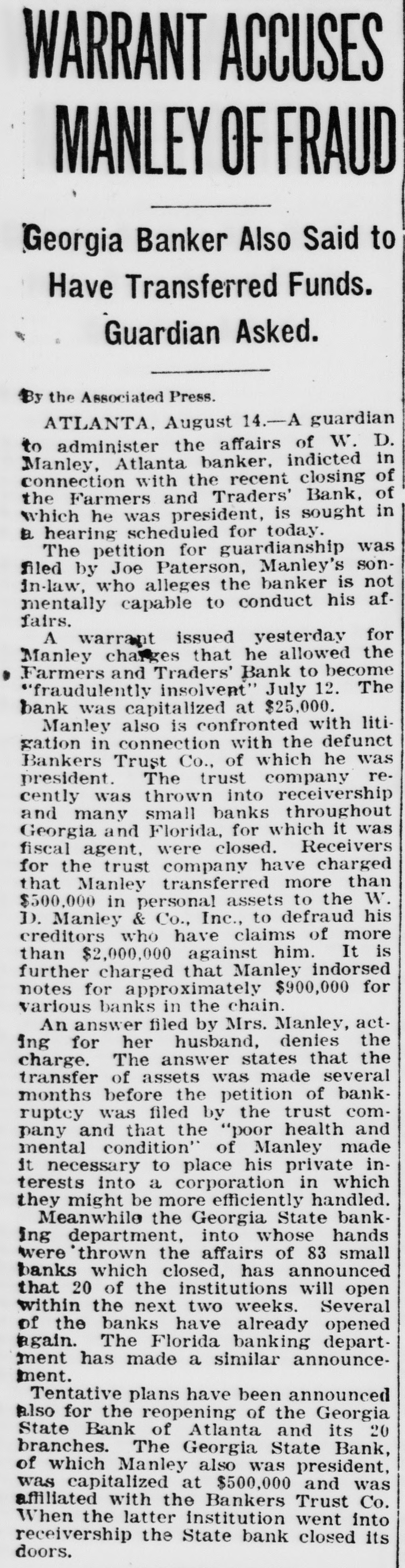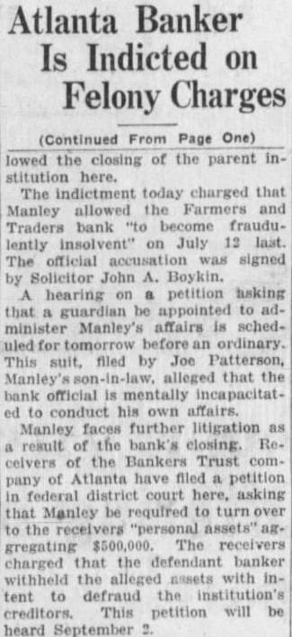 LIGHT. thought impossible that there could any longer of at least, in regard to the recent flurry which bowled over number Georgia and Florida banks that were links what stands revealed weak bank chain. held certain officers the defunct Bankers Trust company, which brought all the trouble, would not brought forward nesses what happened. has turned out In its issue of Aug. 26, the Banker, published New York and of the counoutstanding banking and nancial magazines, carried under an Atlanta date line this of officer of the BankTrust company" to why what happened did happen: Bankers Trust company and allied could have pulled through everything righted except Florida which was part responsible for the disruption of the rehabilita- would seem that the ida state chamber of commerce, the Florida Bankers' association, the other or both, should immediately take matter up the American Banker, to the end that the actual facts of this chapter our experiences shall set by that publication. There no doubting that the carrying that statement in the Banker calculated to do Florida great and altogether deserved harm. In meantime an Associated Press Atlanta terday calculated to shed great light upon this matter. said that the assistant solicitor general Atlanta circuit had asked the Georgia state banking department indictments against Manley, the head of the Bankers Trust company, in every Georgia county which he financed bank and, also, that this action closely followed the presentation to the Fulton county, Georgia, grand jury indictments against Manley and other officers of his bank. charging larceny after trust and that they allowed the Farmers and Traders Atlanta, member of the Bankers Trust chain, fraudulently insolvent during their ministration." Information also given this press dispatch named in these indictments are Manley, Adams, trustee: Paul Baker, and John Russell, assistant secretary and trustee the Farmers and Tradbank. Wonder grows if any these who the statement carried in the American Banker. something have defendant in criminal proceedings, possible defendant such proceedings, to forestall conviction in the courts by unloading their wrong before door of state. that the fact appears that Manley and his associates against whom indictments have been returned and against more indictments are being sought should illumine the whole far as arriving and what are responsible happened concerned. No thought any grand jury's dicting the state Florida business tertained. Officers the an almost invariable way going after those who the proof shows to guilty they criminal proceedings We rather upon the judgment the Atlanta solicitor general fixing the cause of the aster than upon all the statements which Manley any crowd make the columns the American Banker or for other columns. Florida doesn't deserve what the American Banker has done her by the publication referred She appreciate Whole and immediate should made have the American Banker the facts the Florida nothing fear from truthful setting forth these facts. no satisfaction to know that weather conditions in Kansas such are here out. Certainly regret to know that many farmers in Kansas who have depended upon this year have witnessed its total destruction and that much the Kansas not fit for fodder, which means whole year's work tirely lost. But weather conditions are what they are and, spite attempts men have made change them our opinion, always be beyond mortal control. impressed, however, the difference sas and Florida in regard weather crops. With abundance artesian water able, close the top of the ground, no Florida farmer need have his crops burned he the little trouble and not large expense necessary provide irrigation. Even those do to do without hope here. the such others can be in and harvest reached. Making from not an uncomthing with Florida farmers. This another of the things which make Florida most desiraplace for farming.