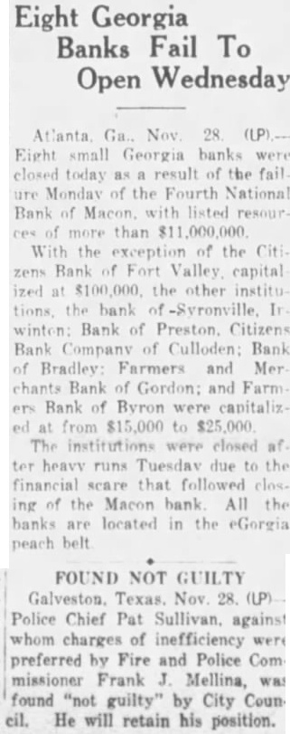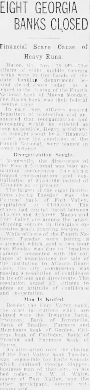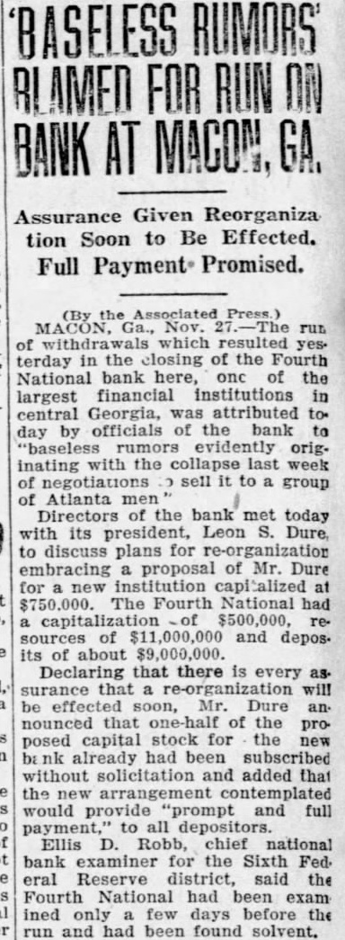 AT Assurance Given Reorganiza tion Soon to Be Effected. Full Payment® Promised. Press.) Nov. run which terday the closing of the Fourth National bank here, of the largest financial institutions in central Georgia, attributed to. day by officials of the bank to evidently orig. inating with the week sell it to group Atlanta Directors the bank met today with its Leon S. Dure, to discuss plans for embracing proposal of Mr. Dure for new institution The Fourth National had of and depos. its of about $9,000,000. Declaring that there is every as. that will be Dure announced that of the proposed capital stock for already had subscribed without solicitation and added that the arrangement contemplated would "prompt full payment," all depositors. Ellis D. Robb, chief national bank examiner for the Sixth Fed. eral Reserve district, said the Fourth National had been exam ined few days before the run and had been found solvent.
