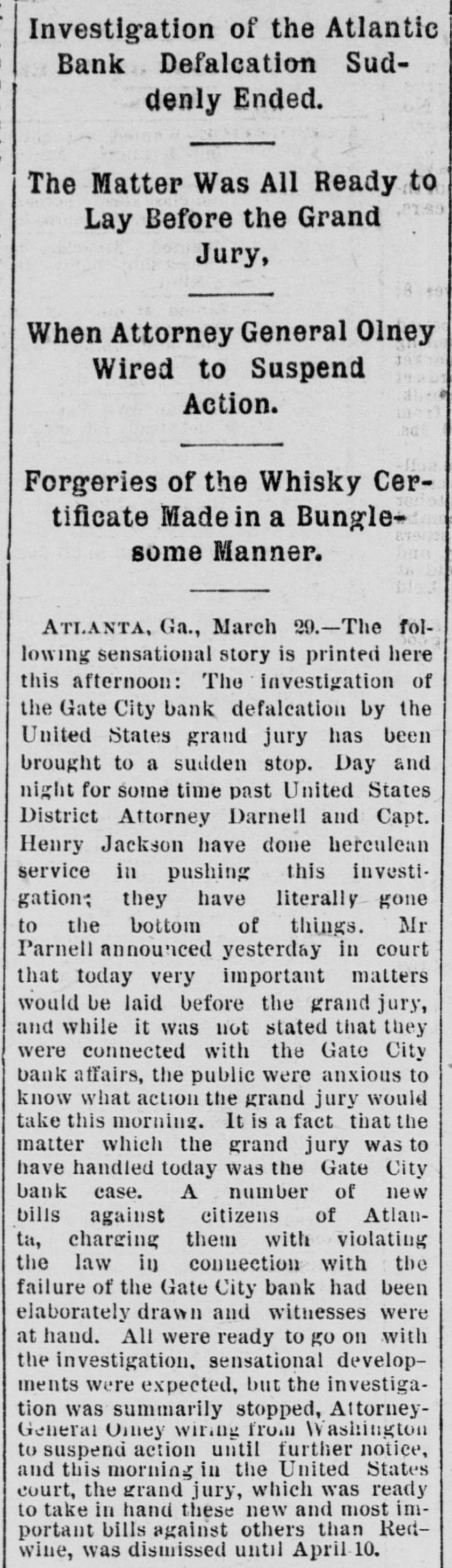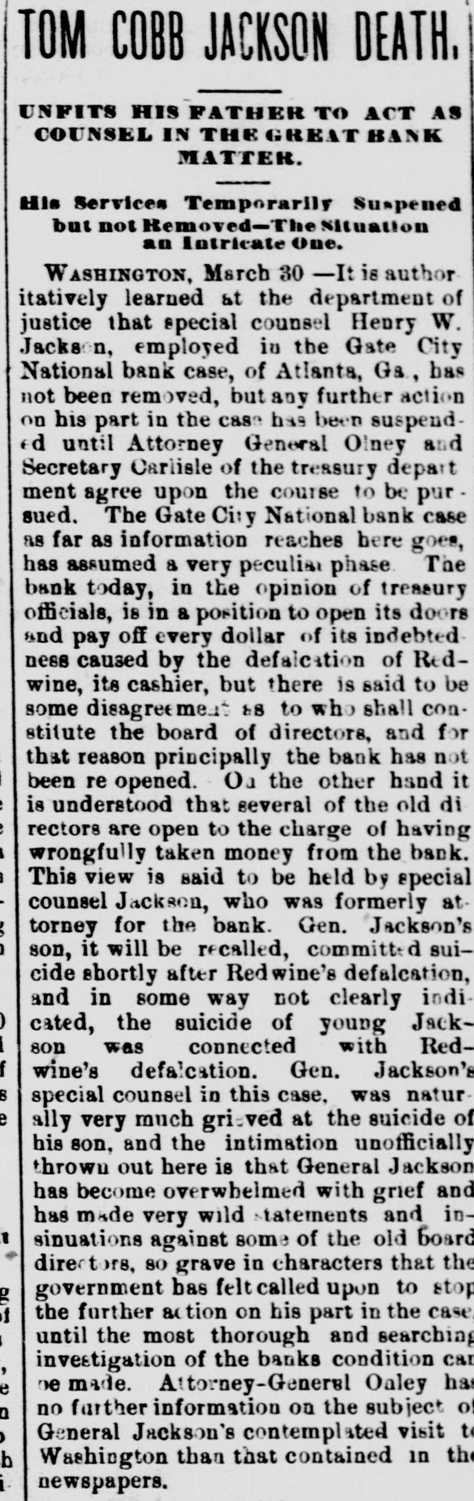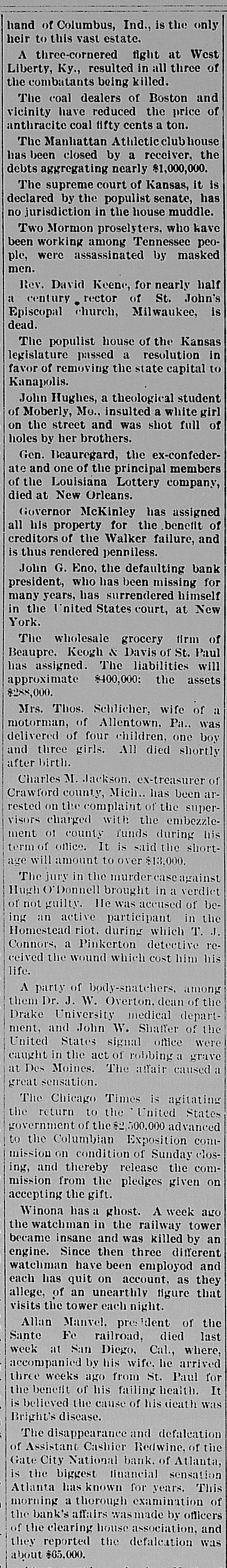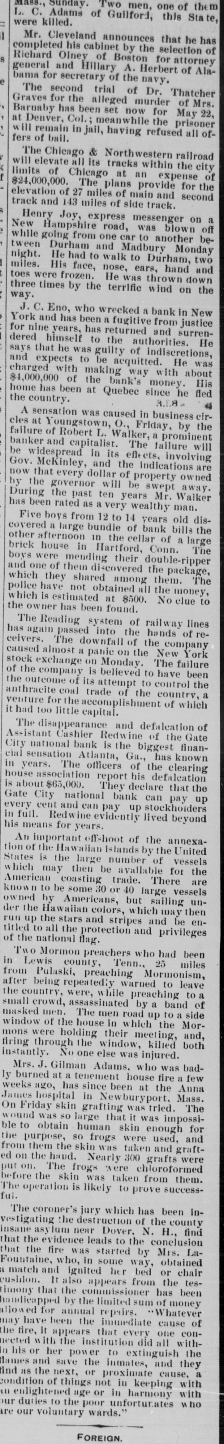 Mr. Cleveland announces that he has completed his cabinet by the selection of Richard Olney of Boston for attorney general and Hillary A. Herbert of Alabama for secretary of the navy. The second trial of Dr. Thatcher Graves for the alleged murder of Mrs. Barnaby has been set now for May 22, at Denver, Col.: meanwhile the prisoner will remain in jail, having refused all offers of bail. The Chicago & Northwestern railroad will elevate all its tracks within the city limits of Chicago at an expense of $24,000,000. The plans provide for the elevation of 27 miles of main and second track and 143 miles of side track. Henry Joy, express messenger on a New Hampshire road, was blown off while going from one car to another between Durham and Madbury Monday night. He had to walk to Durham, two miles. His face, nose, ears, hand and toes were frozen. He was thrown down three times by the terrific wind on the way. J.C. Eno, who wrecked a bank in New York and has been a fugitive from justice for nine years, has returned and surrendered himself to the authorities. He says that he was guilty of indiscretions, and expects to be acquitted. He was charged with making way with about $4,000,000 of the bank's money. His home has been at Quebec since he fled the country. A.L.8. 46 A sensation was caused in business eircles at Youngstown, O., Friday, by the failure of Robert L. Walker, a prominent banker and capitalist. The failure will be widespread in its effects, involving Gov. McKinley, and the indications are now that every dollar of property owned by the governor will be swept away. During the past ten years Mr. Walker has been rated as a very wealthy man. Five boys from 12 to 14 years old discovered a large bundle of bank bills the other afternoon in the cellar of a large brick house in Hartford, Conn. The boys were mending their double-ripper and one of their discovered the package, which they shared among them. The police have not obtained all the money, which is estimated at $500. No clue to the owner has been found. The Reading system of railway lines has again passed into the hands of receivers. The downfall of the company caused almost a panic on the New York stock exchange on Monday. The failure of the company is believed to have been the outcome of its attempt to control the anthracite coal trade of the country, a venture for the accomplishment of which it had too little capital. The disappearance and defalcation of Assistant Cashier Redwine of the Gate City national bank is the biggest financial sensation Atlanta, Ga., has known in years. The officers of the clearing house association report his defalcation is about $65,000. They declare that the Gate City national bank can pay up every cent and can pay up stockholders in full. Redwine evidently lived beyond his means for years. An important offshoot of the annexaion of the Hawaiian islands by the United States is the large number of vessels which may then be available for the American coasting trade. There are known to be some 30 or 40 large vessels owned by Americans, but sailing unler the Hawaiian colors, which may then un up the stars and stripes and be entitled all the protection and privileges of the national flag. Two Mormon preachers who had miles been Lewis county, Tenn., 25 from in Pulaski, preaching Mormonism, after being repeatedly warned to leave a he country, were, while preaching to crowd, assassinated by a band of masked men. The men road up to a side vindow of the house in which the Morwere holding their meeting, both and, nons iring through the window, killed instantly. No one else was injured. Mrs. J. Gilman Adams. who was badburned at a tenement house fire a Anna few weeks y ago, has since been at the Mass. James hospital in Newburyport. The Friday skin grafting was tried. On yound was so large that it was impossi- for le to obtain human skin enough and purpose, so frogs were used, from he them the skin was taken and graftthe hand. Nearly 300 grafts were d on The frogs were chloroformed them. before ut on. the skin was taken from 'he operation is likely to prove successui. The coroner's jury which has been inrestigating the destruction of the county find asylum near Dover. N. H., usane the evidence leads to the conclusion Lahat fire was started by Mrs. who, in soure way, and ignited her tesIt also appears Countaine, hat match the from bed or obtained the chair been ushion. that the commissioner has of andicapped mony by the limited sum Whatever money for annual repairs. been the lay it appears that every one withHowed tire, have immediate all cause con- of with the institution did the be eeted his extinguish and or her power to they I and save the inmates, cause, ames the next, or proximate with a nd as of things not in age or in un 11 duties to the poor condition enlightened unfortunates harmony keeping with who re our voluntary wards. FOREIGN