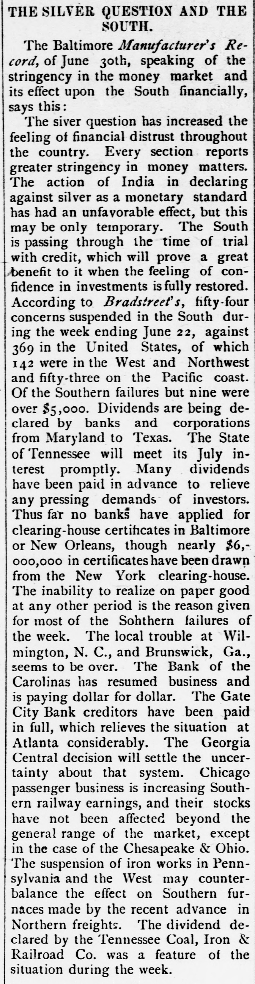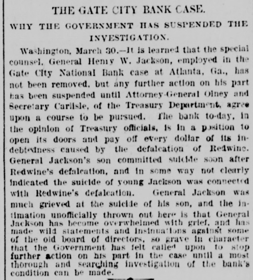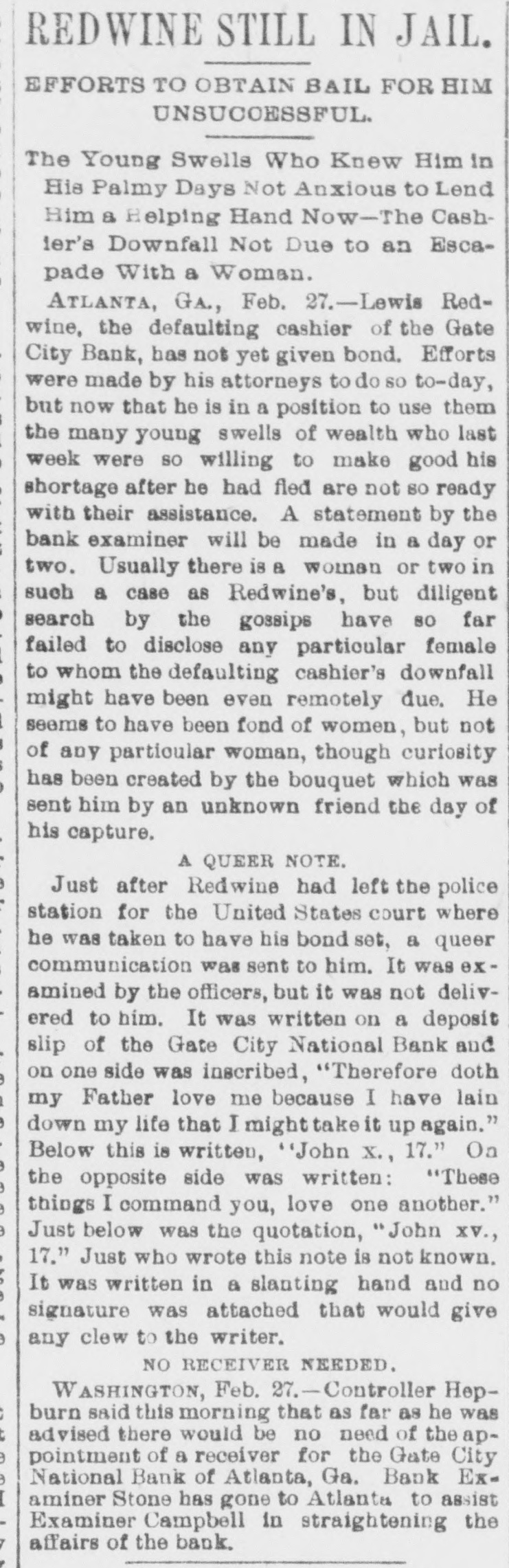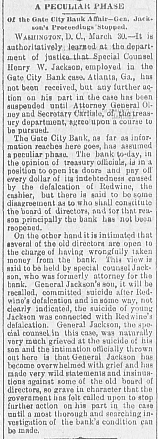 Mr. Cleveland announces that he has completed his cabinet by the selection of Richard Olney of Boston for attorney general and Hillary A. Herbert of Alabama for secretary of the navy. The second trial of Dr. Thatcher Graves for the alleged murder of Mrs. Barnaby has been set now for May 22, at Denver, Col.: meanwhile the prisoner will remain in jail, having refused all offers of bail. The Chicago & Northwestern railroad will elevate all its tracks within the city limits of Chicago at an expense of $24,000,000. The plans provide for the elevation of 27 miles of main and second track and 143 miles of side track. Henry Joy, express messenger on a New Hampshire road, was blown off while going from one car to another between Durham and Madbury Monday night. He had to walk to Durham, two miles. His face, nose, ears, hand and toes were frozen. He was thrown down three times by the terrific wind on the way. J.C. Eno, who wrecked a bank in New York and has been a fugitive from justice for nine years, has returned and surrendered himself to the authorities. He says that he was guilty of indiscretions, and expects to be acquitted. He was charged with making way with about $4,000,000 of the bank's money. His home has been at Quebec since he fled the country. A.L.8. 46 A sensation was caused in business eircles at Youngstown, O., Friday, by the failure of Robert L. Walker, a prominent banker and capitalist. The failure will be widespread in its effects, involving Gov. McKinley, and the indications are now that every dollar of property owned by the governor will be swept away. During the past ten years Mr. Walker has been rated as a very wealthy man. Five boys from 12 to 14 years old discovered a large bundle of bank bills the other afternoon in the cellar of a large brick house in Hartford, Conn. The boys were mending their double-ripper and one of their discovered the package, which they shared among them. The police have not obtained all the money, which is estimated at $500. No clue to the owner has been found. The Reading system of railway lines has again passed into the hands of receivers. The downfall of the company caused almost a panic on the New York stock exchange on Monday. The failure of the company is believed to have been the outcome of its attempt to control the anthracite coal trade of the country, a venture for the accomplishment of which it had too little capital. The disappearance and defalcation of Assistant Cashier Redwine of the Gate City national bank is the biggest financial sensation Atlanta, Ga., has known in years. The officers of the clearing house association report his defalcation is about $65,000. They declare that the Gate City national bank can pay up every cent and can pay up stockholders in full. Redwine evidently lived beyond his means for years. An important offshoot of the annexaion of the Hawaiian islands by the United States is the large number of vessels which may then be available for the American coasting trade. There are known to be some 30 or 40 large vessels owned by Americans, but sailing unler the Hawaiian colors, which may then un up the stars and stripes and be entitled all the protection and privileges of the national flag. Two Mormon preachers who had miles been Lewis county, Tenn., 25 from in Pulaski, preaching Mormonism, after being repeatedly warned to leave a he country, were, while preaching to crowd, assassinated by a band of masked men. The men road up to a side vindow of the house in which the Morwere holding their meeting, both and, nons iring through the window, killed instantly. No one else was injured. Mrs. J. Gilman Adams. who was badburned at a tenement house fire a Anna few weeks y ago, has since been at the Mass. James hospital in Newburyport. The Friday skin grafting was tried. On yound was so large that it was impossi- for le to obtain human skin enough and purpose, so frogs were used, from he them the skin was taken and graftthe hand. Nearly 300 grafts were d on The frogs were chloroformed them. before ut on. the skin was taken from 'he operation is likely to prove successui. The coroner's jury which has been inrestigating the destruction of the county find asylum near Dover. N. H., usane the evidence leads to the conclusion Lahat fire was started by Mrs. who, in soure way, and ignited her tesIt also appears Countaine, hat match the from bed or obtained the chair been ushion. that the commissioner has of andicapped mony by the limited sum Whatever money for annual repairs. been the lay it appears that every one withHowed tire, have immediate all cause con- of with the institution did the be eeted his extinguish and or her power to they I and save the inmates, cause, ames the next, or proximate with a nd as of things not in age or in un 11 duties to the poor condition enlightened unfortunates harmony keeping with who re our voluntary wards. FOREIGN