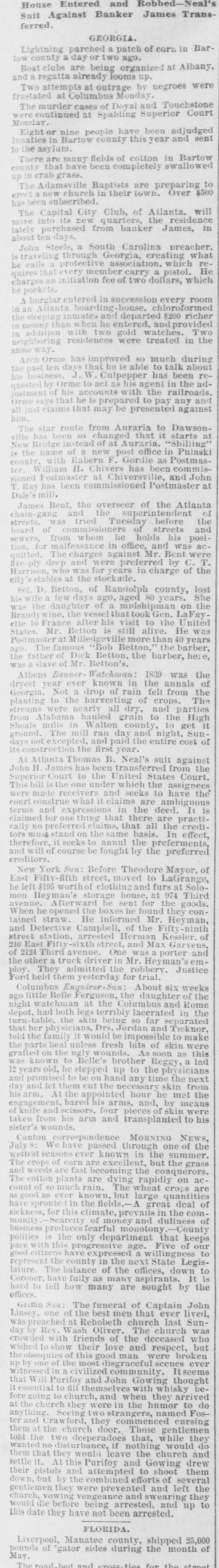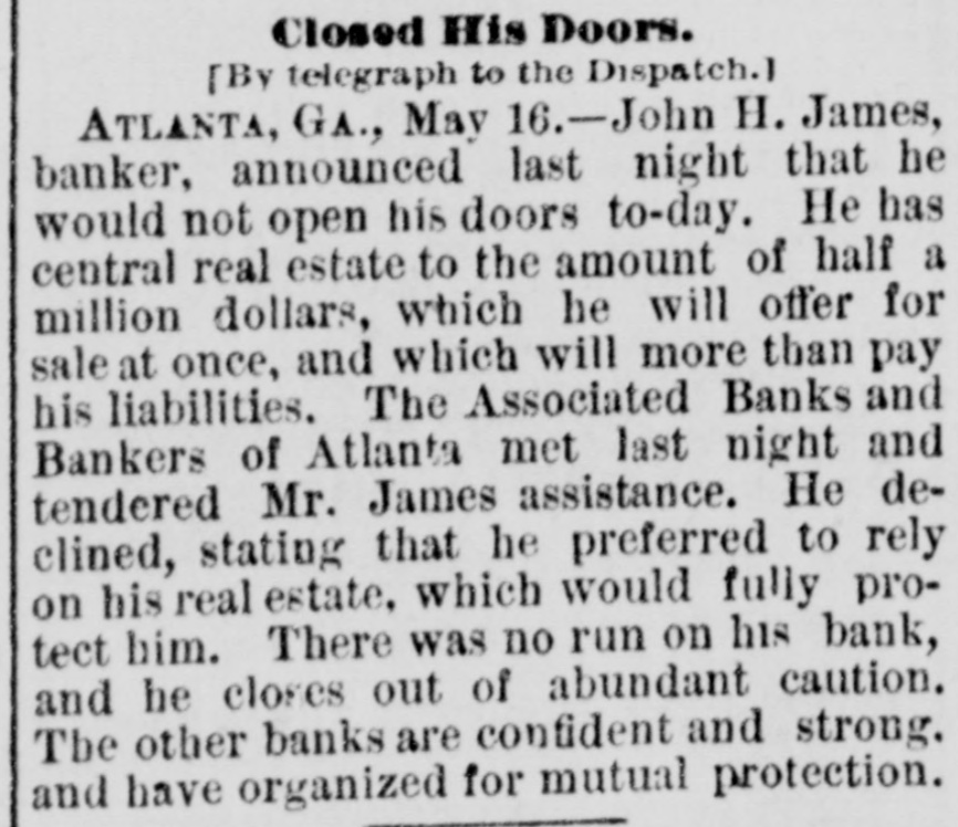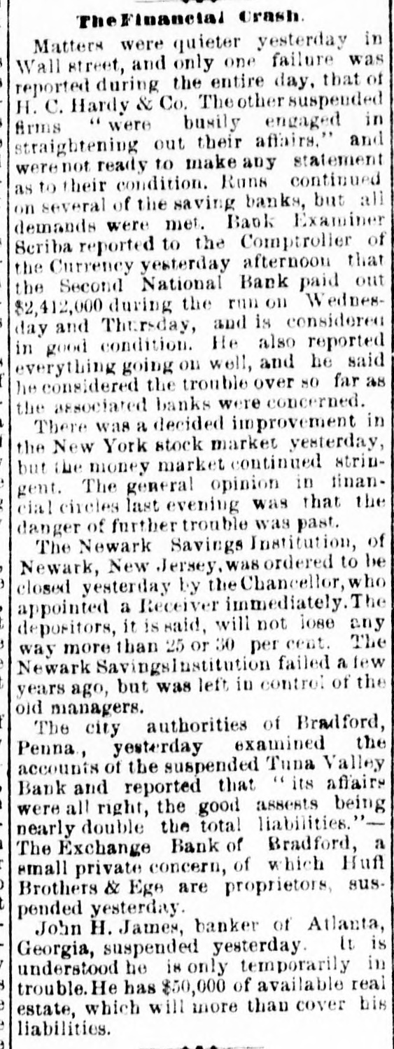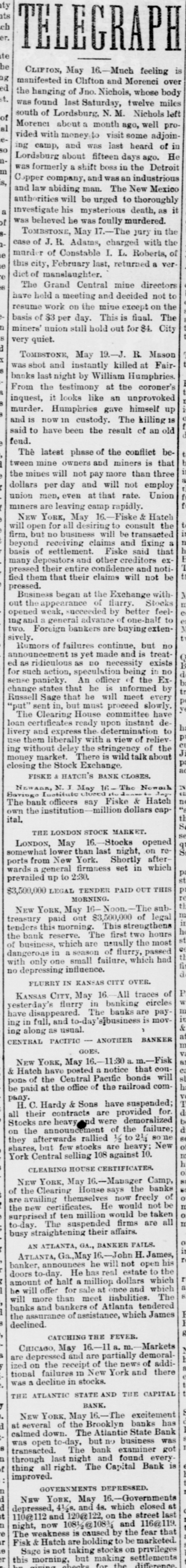 The Clouds Slowly Dispersing. Affairs More Hopeful-The Worst Over. NEW YORK, May 16. WALL STREET-The market shows rally of to 21 per cent. for some shares, but few stocks are heave New York Central selling at 108 against 110 this morning, while Lake Shore is back to 83. The first two hours of business, which are usually the most dangerous in the season of flurry, have passed with only one small failure which has had no great significance. Sub Treasurer Acton says there was brisk demand for legal tenders at his office yesterUp day, causing withdrawal of $3.500,000. to this bour today, one million legal tenders have been paid out and nearly another million of silver certificates. the latter being for payment to savings banks. The Produce Exchange Gloomy. Business matters at the produce exchange have rather a gloomy look. although no failures or rumors of failures are current. Trade is not disposed to operate to any material extent. Shippers' operations are materially checked by the extreme difficulty in selling Sterling exchange prices are all lower and tending downward Leading members are qaite hopeful that there will be no panici the produce exchange, but some members are discouraged at the outlook of financial affairs in Wall street At the Petroleum Exchange. At the petroleum exchange prices broke 84 or from 734 at the close of yesterday down to 65. There was some excitement, but prices afterward recovered about four cents standing at 12.13 P. M. at 69. No failures are reported. Savings Banks Run Nearly Closed. The run on the Emigrant Industrial Savings Bank has abated today, and business was being done as usual. About 8160,000 was paid out yesterday, but it was said that depositors were returning their money today It was thought that there would not be another rush here unless the Wall street pauic broke out afresh. There was no run today on the Manhattan savings institution. The Greenwich Savings Bank run ended today There a steady run on the German Savings Bank today. A large crowd composed mostly of women stood around it. The teller was passing nothing but gold to them. Washington advices state that the sub treasurer at New York reports only $100,000 of bonds were offered for redemption there. under Secretary Folger's call. The clearing house banks have agreed to advance $20,000,000 on government bonds necessary, to protect the market. Up to this hour it is said that $25,000,000 have been loaned in this collateral. Money is loaning at and 1 per cent. premium per diem. No quotation for money, prime mercantile paper nominal: exchange heavy and depressed at 82 84 long and 84 a 854 short governments weak and lower, state bonds merely nominal railroad bonds very regular Stocks have been better since 11.30 A M Lake Shore is up to 84. St. Paul to 68A. Missouri Pacific to 664. Union Pacific to 423 and Western Union to 521. At the subtreasury $3,500,000 in legal tenders have been paid out this morning This will strengthen the bank reserves, Brokers report more willingness on the part of bankers to make loans and a large amount of money has come from Canada and heavy transfers have been from the other side Walter A Trumbull of Newark. N. J. tel egraphed to the Associated Press from Chi cago follows **The statements published that had fled after making unwise endorsements are maliciogs falsehoods. I am on my way east to demand a retraction. After midday, stocks were strong and higher again. Buying for European accounts was large at the Erie office. The transfers of stock for this account is very heavy Lake Shore was the special feature of the market and rallied from 87 per cent. to 884 The action of the clearing house banks this morning has caused an improvement. The market for governments is much im proved. No New Failures Reported. 2.20 P. M -The hour of settling has been passed safely and no additional failures have been reported Consideraele Excitement in London, LONDON, Mav 16 The opening prices on the stock exchange were somew lower than last night's clos ing. It is stated that the relapse was caused by vices of yesterday from New York in regard to the financial situation, and especially by the news of Fisk Hatch's failure but shortiv after the opening a general firm. ness began to appear and has prevailed up to the time of this dispatch. 2.30 P M. This was brought about by the bears seeking to cover their short sales and by the purchasing of small investors. Since half past four strong downward ten dency in American stocks especially in Lake Shore. has prevailed. The street is crowded and there is much excitement. London Sending Gold to New York. At 5.30 P. M. prices of American securities on the streets were fluctuating. The closing prices, however, were better. There have been large remittances of government coupons to pay for stocks sold here. Large shipment of gold to New York are being arranged. Suspension in Atlanta ATLANTA. Ga. May 16 John H. James, banker. did not open his doors today He has real estate to the amount of half million dollars which will more than meet his liabilities. The other banks are confident and strong. and have organized for mutual protection. Another Bank Closed Its Doors. NEWARK. N. J. May 16 The Newark Savings Institution, which failed six years ago and has since been conducted under the direction of a chancellor by the old managers, again closed its doors, on account of the failure of Fisk & Hatch. The Fisk & Hatch bank officers say that they owe the institution $1,000,000. It said that the firm has a right. as far as the bank officers could give it to them, to borrow and use their securities substituting for them different bonds of equal value. and now at the end comes considerable loss, yet it is believed that in little while the securities now in the possession of the bank received by them from the firm will turn out equal to saving depositors from any lose. The chancellor saye that the closing of the doors was ordered by him to protect