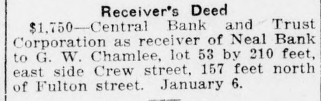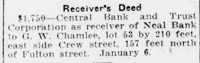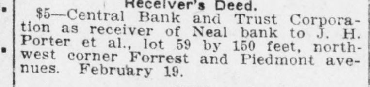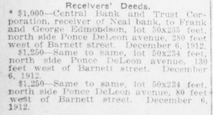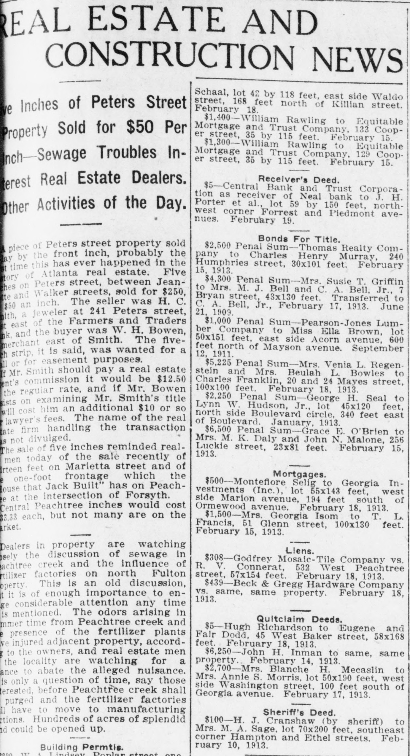REAL ESTATE AND CONSTRUCTION NEWS Schaal, lot 42 by 118 feet, east side Waldo street, 168 feet north of Killian street. February 18. ve Inches of Peters Street $1,400-William Rawling to Equitable Mortgage and Trust Company, 133 CoopProperty Sold for $50 Per er street, 35 by 115 feet. February 15. $1,300-William Rawling to Equitable Mortgage and Trust Company, 129 Coopnch-Sewage Troubles Iner street, 35 by 115 feet. February 15. Receiver's Deed. erest Real Estate Dealers. $5-Central Bank and Trust Corporation as receiver of Neal bank to J. H. Porter et al., lot 59 by 150 feet, northOther Activities of the Day. west corner Forrest and Piedmont avenues. February 19. Bonds For Title. $2,500 Penal Sum-Thomas Realty Compiece of Peters street property sold pany to Charles Henry Murray, 240 ay by the front inch, probably the Humphries street, 30x101 feet. February time this has ever happened in the 15, 1913. tory of Atlanta real estate. Five $4,300 Penal Sum-Mrs. Susie T. Griffin hes on Peters street, between Jeanto Mrs. M. J. Bell and C. A. Bell, Jr., 7 te and Walker streets, sold for $250, Bryan street, 43x130 feet. Transferred to $50 an inch. The seller was H. C. C. A. Bell, Jr., February 17, 1913. June 21, 1909. ith, a jeweler at 241 Peters street, $1,000 Penal Sum-Pearson-Jones Lumeast of the Farmers and Traders ber Company to Miss Ella Brown, lot ak, and the buyer was W. H. Bowen, 50x151 feet, east side Acorn avenue, 600 merchant east of Smith. The fivefeet north of Mayson avenue. September 12, 1911. h strip, it is said, was wanted for a or for easement purposes. $5,225 Penal Sum-Mrs. Venia L. RegenMr. Smith should pay a real estate stein and Mrs. Beulah L. Bowles to Charles Franklin, 20 and 24 Mayes street, ent's commission it would be $12.50 100x100 feet. February 18, 1913. the regular rate, and if Mr. Bowen $2,250 Penal Sum-George H. Seal to sists on examining Mr. Smith's title Lynn W. Hudson, Jr., lot 45x120 feet, will cost him an additional $10 or so north side Boulevard circle, 340 feet east lawyer's fees. The name of the real of Boulevard. January, 1913. tate firm handling the transaction $6,500 Penal Sum-Grace E. O'Brien to Mrs. M. K. Daly and John N. Malone, 256 as not divulged. The sale of five inches reminded realLuckie 1913. street, 23x81 feet. February 15, men today of the sale recently of Irteen feet on Marietta street and of Mortgages. one-foot frontage which the $500-Montefiore Selig to Georgia Inlouse that Jack Built" has on Peachvestments (Inc.), lot 55x143 feet, west at the intersection of Forsyth. side Marion avenue, 194 feet south of Central Peachtree inches would cost Ormewood avenue. February 18, 1913. $1,500-Mrs. Georgia Isom to T. L. 33.33 each, but not many are on the Francis, 51 Glenn street, 100x130 feet. arket. February 15, 1913. Dealers in property are watching Liens. sely the discussion of sewage in $308-Godfrey Mosaic-Tile Company vs. achtree creek and the influence of R. V. Connerat, 532 West Peachtree rtilizer factories on north Fulton street, 57x154 feet. February 18, 1913. $439-Beck & Gregg Hardware Company operty. This is an old discussion, it is of enough importance to en1913. vs. same, same property. February 18, considerable attention any time is mentioned. The odors arising in Quitclaim Deeds. mmer time from Peachtree creek and $5-Hugh Richardson to Eugene and presence of the fertilizer plants Fair Dodd, 45 West Baker street, 58x168 ve injured adjacent property, accordfeet. February 18, 1913. to the owners, and real estate men $6,250-John H. Inman to same, same property. February 14, 1913. the locality are watching for a $2,700-Mrs. Blanche H. Mecaslin to ance to abate the alleged nuisance. Mrs. Annie S. Morris, lot 50x190 feet, west only a question of time, say those side Washington street. 100 feet south of terested, before Peachtree creek shall Georgia avenue. February 17, 1913. purged and the fertilizer factories have to move to manufacturing Sheriff's Deed. ctions. Hundreds of acres of splendid $100-H. J. Cranshaw (by sheriff) to nd could be opened up. Mrs. M. A. Sage, lot 70x200 feet, southeast corner Hampton and Ethel streets. February 10, 1913. Building Permtis. W Lindsey Ponlar street one