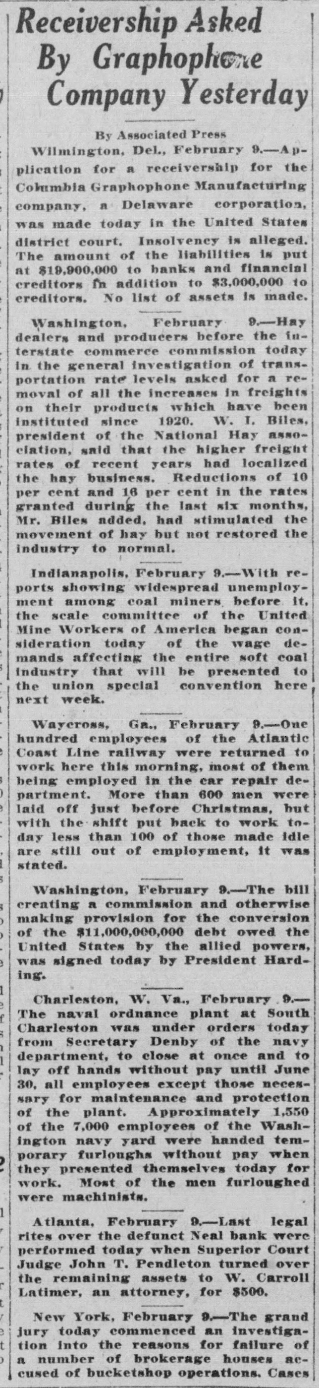 Receivership Asked By Graphophere Company Yesterday By Associated Press Wilmington, Del., February 9.-Application for a receivership for the Columbia Graphophone Manufacturing company, a Delaware corporation, was made today in the United States district court. Insolvency is alleged. The amount of the liabilities is put at $19,900,000 to banks and financial creditors in addition to $3,000,000 to creditors. No list of assets is made. Washington, February 9.-Hay dealers and producers before the interstate commerce commission today in the general investigation of transportation rate levels asked for a removal of all the increases in freights on their products which have been instituted since 1920. W. I. Biles, president of the National Hay assoclation, said that the higher freight rates of recent years had localized the hay business. Reductions of 10 per cent and 16 per cent in the rates granted during the last six months, Mr. Biles added. had stimulated the movement of hay but not restored the industry to normal. Indianapolis, February 9.-With reports showing widespread unemployment among coal miners before it, the scale committee of the United Mine Workers of America began consideration today of the wage demands affecting the entire soft coal Industry that will be presented to the union special convention here next week. Waycross, Ga., February 9.-One hundred employees of the Atlantic Coast Line railway were returned to work here this morning, most of them being employed in the car repair department. More than 600 men were laid off just before Christmas, but with the shift put back to work today less than 100 of those made Idle are still out of employment, it was stated. Washington, February 9.-The bill creating a commission and otherwise making provision for the conversion of the $11,000,000,000 debt owed the United States by the allied powers, was signed today by President Harding. Charleston, W. Va., February 9.The naval ordnance plant at South Charleston was under orders today from Secretary Denby of the navy department, to close at once and to lay off hands without pay until June 30, all employees except those necessary for maintenance and protection of the plant. Approximately 1,550 of the 7.000 employees of the Washington navy yard were handed tem, porary furloughs without pay when they presented themselves today for work. Most of the men furloughed were machinists. 1 Atlanta, February 9.-Last legal rites over the defunct Neal bank were performed today when Superior Court Judge John T. Pendleton turned over the remaining assets to W. Carroll Latimer, an attorney, for $500. t New York, February 9.-The grand e jury today commenced an investigat tion into the reasons for failure of ) a number of brokerage houses accused of bucketshop operations. Cases