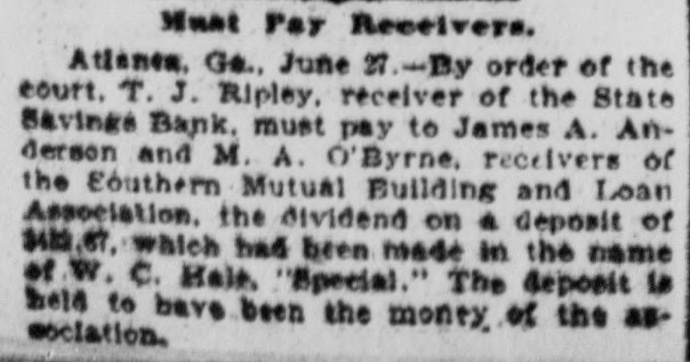 Must Par Receivers. Atlanen, Ge., June N.-By order of the court. T. J. Ripley, receiver of the State Savings Bank. must pay to James A. Anderson and M. A. O'Byrne, receivers of the Eòuthern Mutual Building and Loan Association. the dividend on a deposit of $422 67, which had been made in the name of w. c. Hele. "Special." The deposit is held sociation. to have been the monty. of the as-