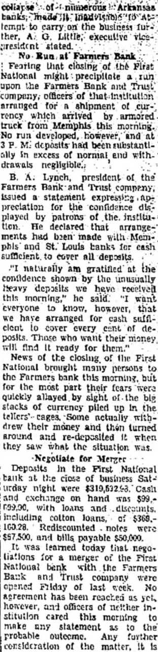 tempt to carry the business ther, Little; executive vicepresident Run at Farmers Bank Fearing that closing of the First National might precipitate upon the Farmers Bank and Trust company, officers of arranged for shipment of rency which arrived by armored truck from Memphis this morning. No run developed, however, and deposits had ally in excess of normal and withdrawals Lynch, president of the Farmers Bank and Trust company, issued statement expressing preciation for the confidence dis. played by patrons of the institution. declared that arrangements had been made with Memphis and St. Louis banks for cash sufficient to cover all deposits. naturally am gratified at the confidence shown by the unusually Iteavy deposits we have received this morning," he sald want everyone know, however, that have arranged for cash sufficlent cover every cent of posits. Those who want their money. will find ready for them." News of the closing the First National brought many persons the Farmers bank this morning, but for the most part their fears were quickly allayed by sight the blg stacks of currency piled up in the cages. Some actually withdrew their money and then turned around and re-deposited when they what the situation was. Negotiate for Merger Deposits in the First National tank at the ciose of business Saturday night were $319,532.43. Cash and on hand was $99.00 with loans and discounts. including cotton loans, of $369.100.28. Rediscounted notes were and bills payable $50,000. was learned today that negoliations for merger of the First National benk with the Farmers Bank and Trust company opened Friday of last week. No agreement has been reached however, and officers of neither institution cared this morning to make any statement as the probable outecme. Any further consideration of the matter,