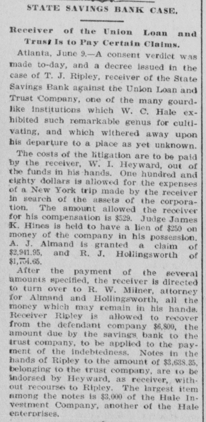 STATE SAVINGS BANK CASE. Receiver of the Union Loan and Trust Is to Pay Certain Claims. Atlanta, June 9.-A consent verdict was made to-day, and a decree issued in the case of T. J. Ripley, receiver of the State Savings Bank against the Union Loan and Trust Company, one of the many gourdlike institutions which W. C. Hale exhibited such remarkable genus for cultivating, and which withered away upon his departure to a place as yet unknown. The costs of the litigation are to be paid by the receiver, W. I. Heyward, out of the funds in his hands. One hundred and eighty dollars is allowed for the expenses of a New York trip made by the receiver in search of the assets of the corporation. The amount allowed the receiver for his compensation is $529. Judge James K. Hines is held to have a lien of $250 on money of the company in his possession. A. J. Almand is granted a claim of $2,941.95, and R. J. Hollingsworth of $1,704.65. After the payment of the several amounts specified, the receiver is directed to turn over to R. W. Milner, attorney for Almand and Hollingsworth, all the money which may remain in his hands. Receiver Ripley is allowed to recover from the defendant company $6,800, the amount due by the savings bank to the trust company, to be applied to the payment of the indebtedness. Notes in the hands of Ripley to the amount of $3,638.35, belonging to the trust company, are to be indorsed by Heyward, as receiver, with. out recourse to Ripley. The largest item among the notes is $3,000 of the Hale Investment Company, another of the Hale enterprises.