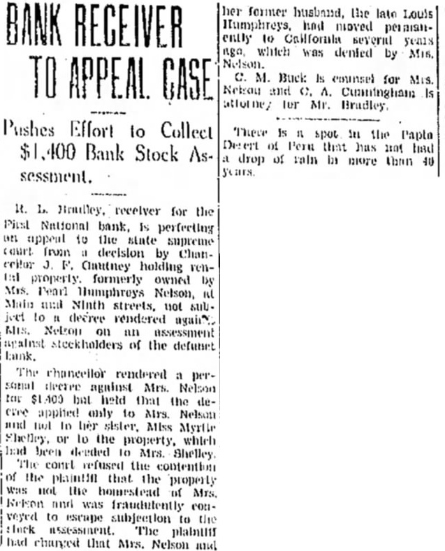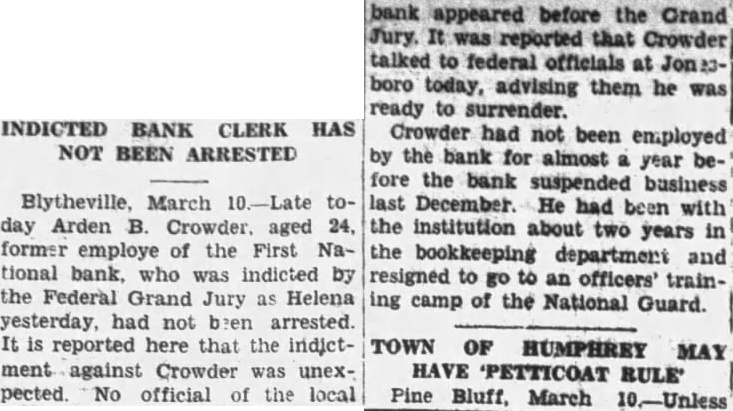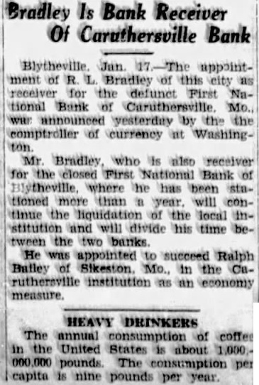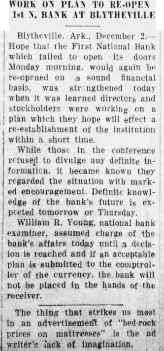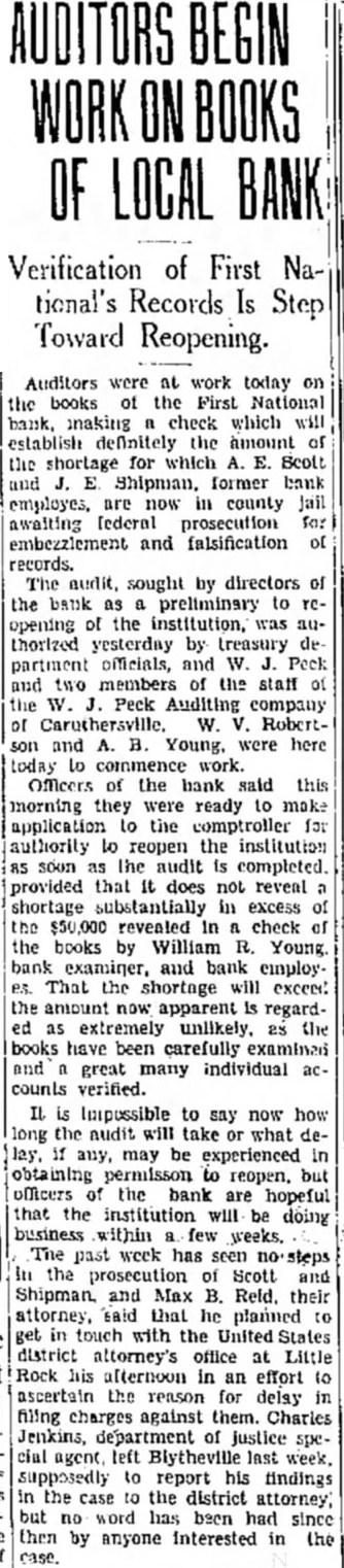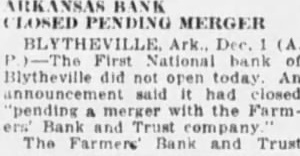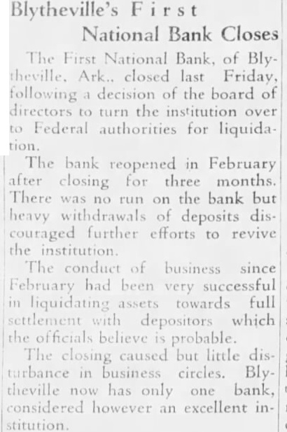 tempt to carry the business ther, Little; executive vicepresident Run at Farmers Bank Fearing that closing of the First National might precipitate upon the Farmers Bank and Trust company, officers of arranged for shipment of rency which arrived by armored truck from Memphis this morning. No run developed, however, and deposits had ally in excess of normal and withdrawals Lynch, president of the Farmers Bank and Trust company, issued statement expressing preciation for the confidence dis. played by patrons of the institution. declared that arrangements had been made with Memphis and St. Louis banks for cash sufficient to cover all deposits. naturally am gratified at the confidence shown by the unusually Iteavy deposits we have received this morning," he sald want everyone know, however, that have arranged for cash sufficlent cover every cent of posits. Those who want their money. will find ready for them." News of the closing the First National brought many persons the Farmers bank this morning, but for the most part their fears were quickly allayed by sight the blg stacks of currency piled up in the cages. Some actually withdrew their money and then turned around and re-deposited when they what the situation was. Negotiate for Merger Deposits in the First National tank at the ciose of business Saturday night were $319,532.43. Cash and on hand was $99.00 with loans and discounts. including cotton loans, of $369.100.28. Rediscounted notes were and bills payable $50,000. was learned today that negoliations for merger of the First National benk with the Farmers Bank and Trust company opened Friday of last week. No agreement has been reached however, and officers of neither institution cared this morning to make any statement as the probable outecme. Any further consideration of the matter,