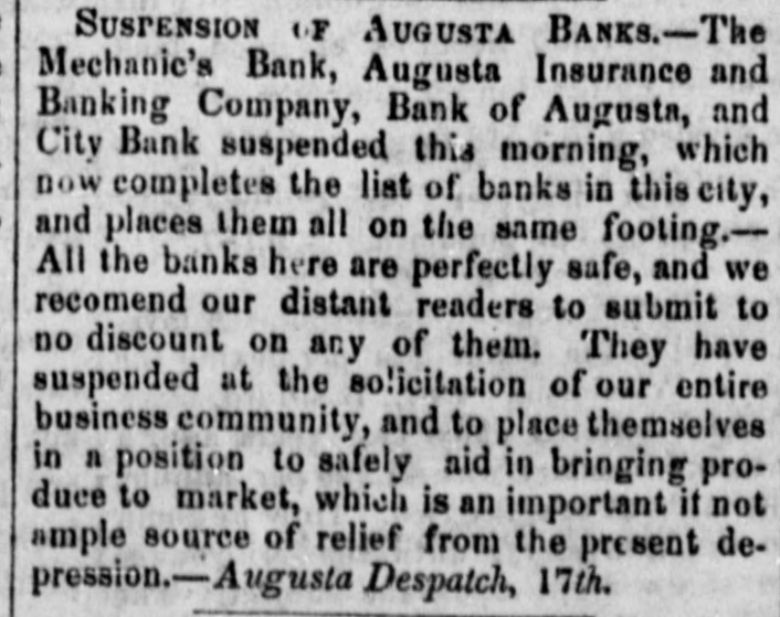 The Mechanic's Bank, Augusta Insurance and Banking Company, Bank of Augusta, and City Bank suspended this morning... They have suspended at the solicitation of our entire business community, and to place themselves in a position to safely aid in bringing produce to market, which is an important if not ample source of relief from the present depression.