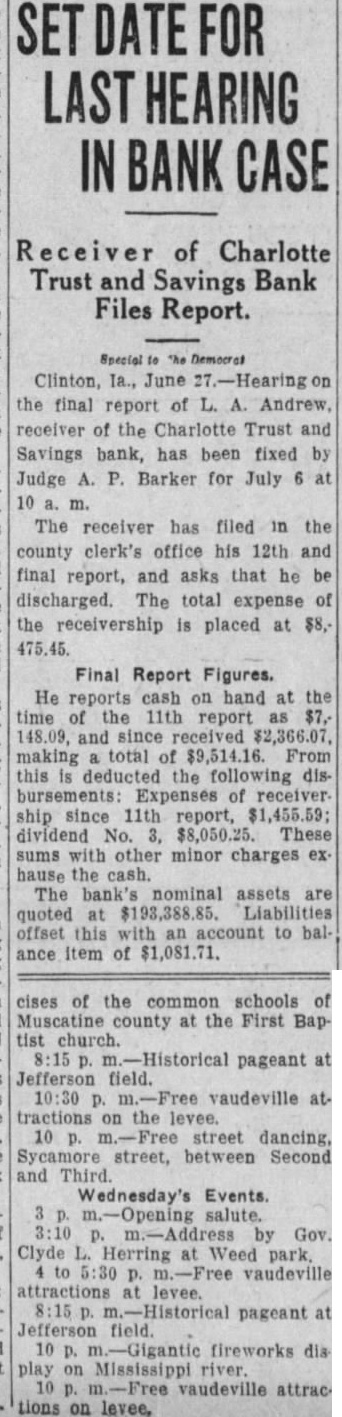 LAST HEARING BANK Receiver of Charlotte Trust and Savings Bank Files Report. Clinton, the final report of Andrew, receiver of the Charlotte Trust and Savings bank, has been fixed by Judge Barker for July The receiver has filed in the county clerk's office his 12th and final report, and asks that he be discharged. The total expense of the receivership is placed at $8,475.45. Final Report Figures. He reports cash on hand at the time the 11th report 148.09, and since received $2,366.07. making total of $9,514.16. From this deducted the following disbursements: Expenses of receiver ship since 11th report, $1,455.59; dividend No. $8,050.25. These sums with other minor charges ex hause the cash. The bank's nominal assets are quoted at $193,388.85. Liabilities offset with an account to ance item of $1,081.71. cises of the common schools of Muscatine county at the First Baptist pageant at Jefferson field. vaudeville attractions on the 10 street dancing, Sycamore street, between Second and Third Wednesday's Events salute. by Gov. Clyde Herring at Weed park. to vaudeville pageant Jefferson field. 10 p. m.-Gigantic fireworks dia play on Mississippi river. vaudeville attractions levee,