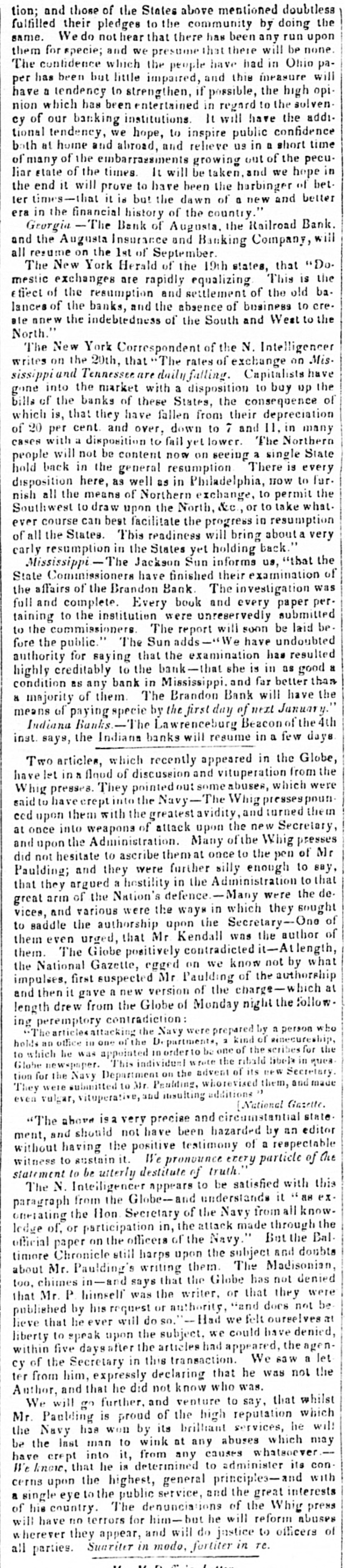 tion; and those of the States above mentioned doubtless fulfilled their pledges to the community by doing the same. We do not hear that there has been any run upon them for specie; and we presume that there will be none. The confidence which the people have had in Ohio paper has been but little impaired, and this measure will have a tendency to strengthen, if possible, the high opinion which has been entertained in regard to the solvency of our banking institutions. It will have the additional tendency, we hope, to inspire public confidence both at home and abroad, and relieve us in a short time of many of the embarrassments growing out of the peculiar state of the times. It will be taken, and we hope in the end it will prove to have been the harbinger of better times that it is but the dawn of a new and better era in the financial history of the country." Georgia-The Bank of Augusta, the Railroad Bank. and the Augusta Insurance and Banking Company, will all resume on the 1st of September. The New York Herald of the 19th states, that "Domestic exchanges are rapidly equalizing. This is the effect of the resumption and settlement of the old balances of the banks, and the absence of business to create anew the indebtedness of the South and West to the North." The New York Correspondent of the N. Intelligencer writes on the 20th, that "The rates of exchange on Mississippi and Tennessee are daily falling. Capitalists have gone into the market with a disposition to buy up the bills of the banks of these States, the consequence of which is, that they have fallen from their depreciation of 20 per cent. and over, down to 7 and 11, in many cases with a disposition to fail yet lower. The Northern people will not be content now on seeing a single State hold back in the general resumption. There is every disposition here, as well as in Philadelphia, now to furnish all the means of Northern exchange, to permit the Southwest to draw upon the North, &c., or to take what-ever course can best facilitate the progress in resumption of all the States. This readiness will bring about a very early resumption in the States yet holding back." Mississippi -The Jackson Sun informs us, "that the State Commissioners have finished their examination of the affairs of the Brandon Bank. The investigation was full and complete. Every book and every paper pertaining to the institution were unreservedly submitted to the commissioners. The report will soon be laid before the public." The Sun adds-"We have undoubted authority for saying that the examination has resulted highly creditably to the bank-that she is in as good a condition as any bank in Mississippi, and far better than a majority of them. The Brandon Bank will have the means of paying specie by the first day of next January." Indiana Banks-The Lawrenceburg Beacon of the 4th inst. says, the Indiana banks will resume in a few days. Two articles, which recently appeared in the Globe, have let in a flood of discussion and vituperation from the Whig presses. They pointed out some abuses, which were said to have crept into the Navy-The Whig presses pounced upon them with the greatest avidity, and turned them at once into weapons of attack upon the new Secretary, and upon the Administration. Many of the Whig presses did not hesitate to ascribe them at once to the pen of Mr Paulding; and they were further silly enough to say, that they argued a hostility in the Administration to that great arm of the Nation's defence. Many were the devices, and various were the ways in which they sought to saddle the authorship upon the Secretary-One of them even urged, that Mr. Kendall was the author of them. The Globe positively contradicted it-At length, the National Gazette, egged on we know not by what impulses, first suspected Mr. Paulding of the authorship and then it gave a new version of the charge-which at length drew from the Globe of Monday night the follow-ing peremptory contradiction: "The articles attacking the Navy were prepared by a person who holds an office in one of the Departments, a kind of sinecureship, to which he was appointed in order to be one of the scribes for the Globe newspaper. This individual wrote the ribald libels in question for the Navy Department on the advent of its new Secretary. They were submitted to Mr. Paulding, who revised them, and made even vulgar, vituperative, and insulting additions" [National Gazette. "The above is a very precise and circumstantial state-ment, and should not have been hazarded by an editor without having the positive testimony of a respectable witness to sustain it. We pronounce every particle of the statement to be utterly destitute of truth."" The N. Intelligencer appears to be satisfied with this paragraph from the Globe-and understands it "as exonerating the Hon. Secretary of the Navy from all knowledge of, or participation in, the attack made through the official paper on the officers of the Navy." But the Baltimore Chronicle still harps upon the subject and doubts about Mr. Paulding's writing them. The Madisonian, too, chimes in-and says that the Globe has not denied that Mr. P. himself was the writer, or that they were published by his request or authority, "and does not believe that he ever will do so." Had we felt ourselves at liberty to speak upon the subject, we could have denied, within five days after the articles had appeared, the agency of the Secretary in this transaction. We saw a letter from him, expressly declaring that he was not the Author, and that he did not know who was. We will go further, and venture to say, that whilst Mr. Paulding is proud of the high reputation which the Navy has won by its brilliant services, he will be the last man to wink at any abuses which may have crept into it, from any causes whatsoever.--We know, that he is determined to administer its concerns upon the highest, general principles and with a single eye to the public service, and the great interests of his country. Th