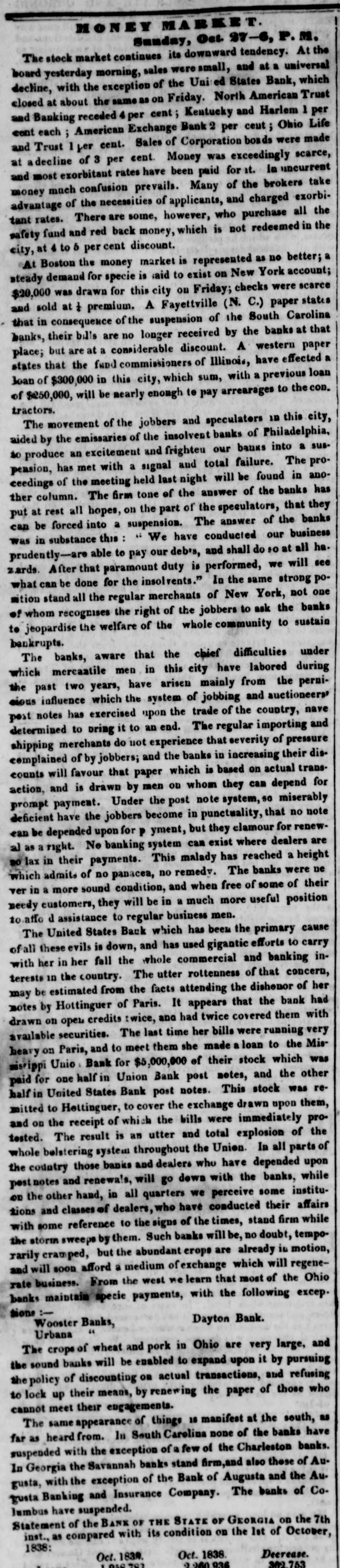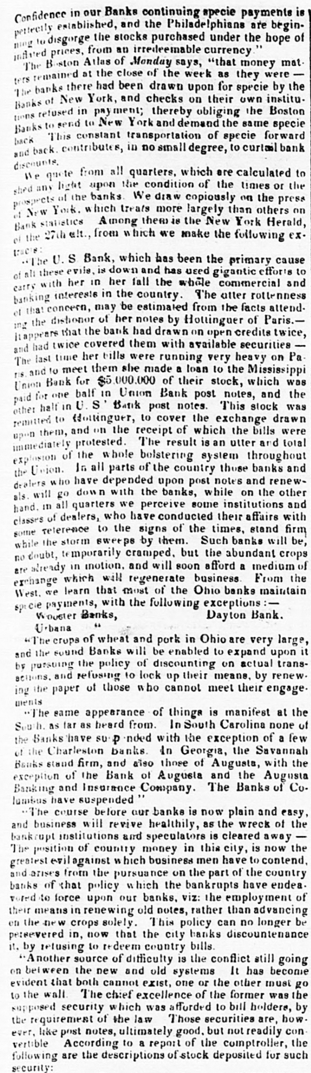 Confidence in our Banks continuing specie payments is perfectly established, and the Philadelphians are beginning to disgorge the stocks purchased under the hope of inflated prices, from an irredeemable currency." The Boston Atlas of Monday says, "that money matters remained at the close of the week as they were — The banks there had been drawn upon for specie by the Banks of New York, and checks on their own institutions refused in payment; thereby obliging the Boston Banks to send to New York and demand the same specie back This constant transportation of specie forward and back, contributes, in no small degree, to curtail bank discounts. We quote from all quarters, which are calculated to shed any light upon the condition of the times or the prospects of the banks. We draw copiously on the press of New York, which treats more largely than others on Bank statistics Among them is the New York Herald, of the 27th alt., from which we make the following extracts: "The U. S. Bank, which has been the primary cause of all these evils, is down and has used gigantic efforts to carry with her in her fall the whole commercial and banking interests in the country. The utter rottenness of that concern, may be estimated from the facts attending the dishonor of her notes by Hottinguer of Paris. It appears that the bank had drawn on open credits twice, and had twice covered them with available securities. The last time her bills were running very heavy on Paris, and to meet them she made a loan to the Mississippi Union Bank for $5.000.000 of their stock, which was paid for one half in Union Bank post notes, and the other half in U. S' Bank post notes. This stock was remitted to Hottinguer, to cover the exchange drawn upon them, and on the receipt of which the bills were immediately protested. The result is an utter and total explosion of the whole bolstering system throughout the Union. In all parts of the country those banks and dealers who have depended upon post notes and renewals, will go down with the banks, while on the other hand, in all quarters we perceive some institutions and classes of dealers, who have conducted their affairs with some reference to the signs of the times, stand firm while the storm sweeps by them. Such banks will be, no doubt, temporarily cramped, but the abundant crops are already in motion, and will soon afford a medium of exchange which will regenerate business. From the West, we learn that most of the Ohio banks maintain specie payments, with the following exceptions:- Dayton Bank. Wooster Banks, Urbana "The crops of wheat and pork in Ohio are very large, and the sound Banks will be enabled to expand upon it by pursuing the policy of discounting on actual transactions, and refusing to lock up their means, by renewing the paper of those who cannot meet their engagements "The same appearance of things is manifest at the South. as far as heard from. In South Carolina none of the Banks have suspended with the exception of a few of the Charleston banks. In Georgia, the Savannah Banks stand firm, and also those of Augusta, with the exception of the Bank of Augusta and the Augusta Banking and Insurance Company. The Banks of Columbus have suspended" "The course before our banks is now plain and easy, and business will revive healthily, as the wreck of the bankrupt institutions and speculators is cleared away — The position of country money in this city, is now the greatest evil against which business men have to contend, and arises from the pursuance on the part of the country banks of that policy which the bankrupts have endeavored to force upon our banks, viz: the employment of their means in renewing old notes, rather than advancing on the new crops solely. This policy can no longer be persevered in, now that the city banks discountenance it, by refusing to redeem country bills. "Another source of difficulty is the conflict still going on between the new and old systems It has become evident that both cannot exist, one or the other must go to the wall. The chief excellence of the former was the supposed security which was afforded to bill holders, by the requirement of the law Those securities are, however, like post notes, ultimately good, but not readily convertible According to a report of the comptroller, the following are the descriptions of stock deposited for such security: