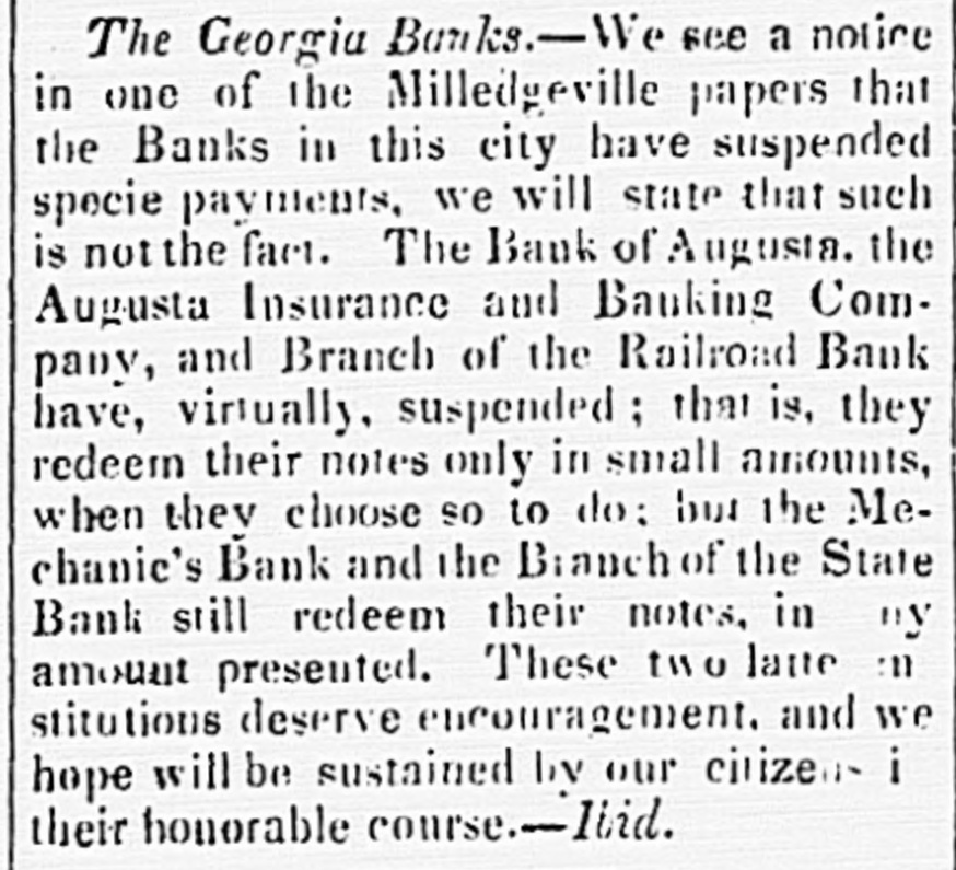Reported statewide banking stoppage and specie scarcity; Bank of Augusta listed among suspended banks that hoped to resume soon.