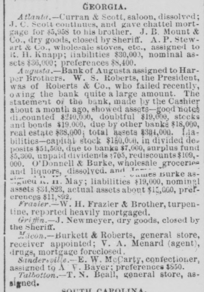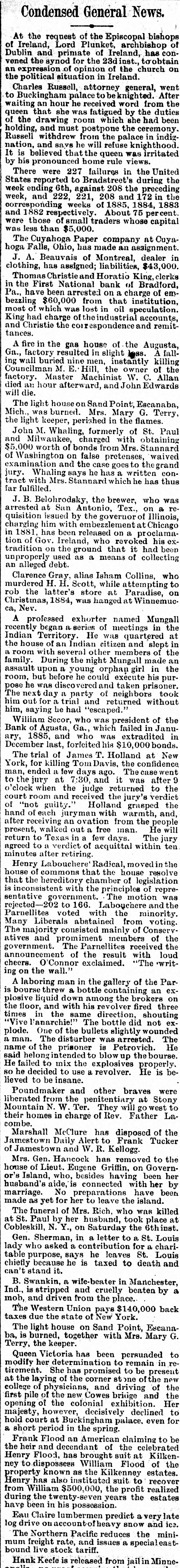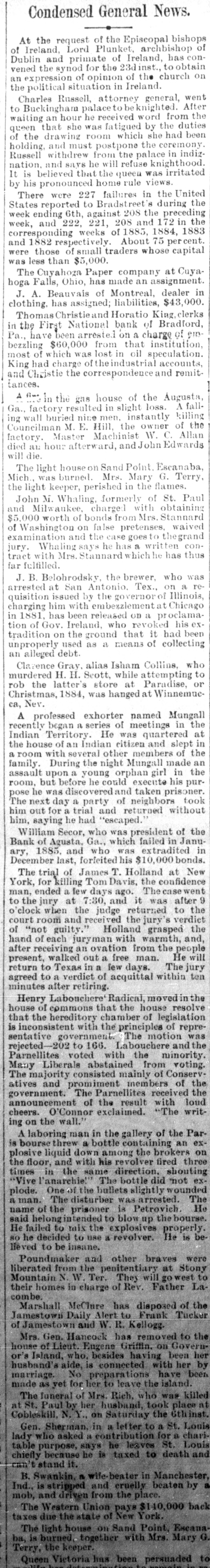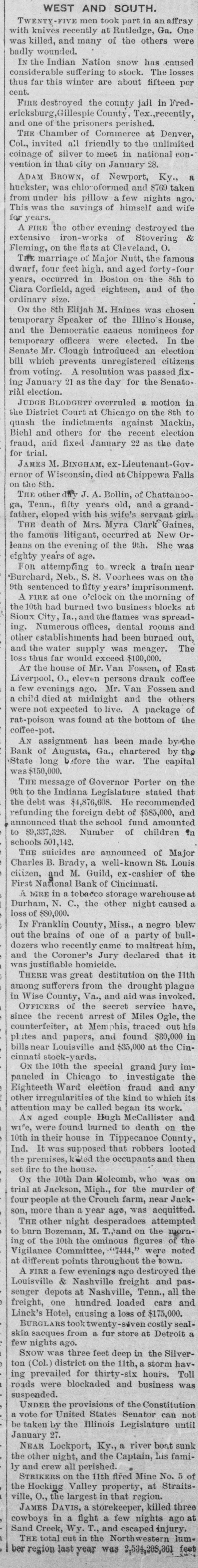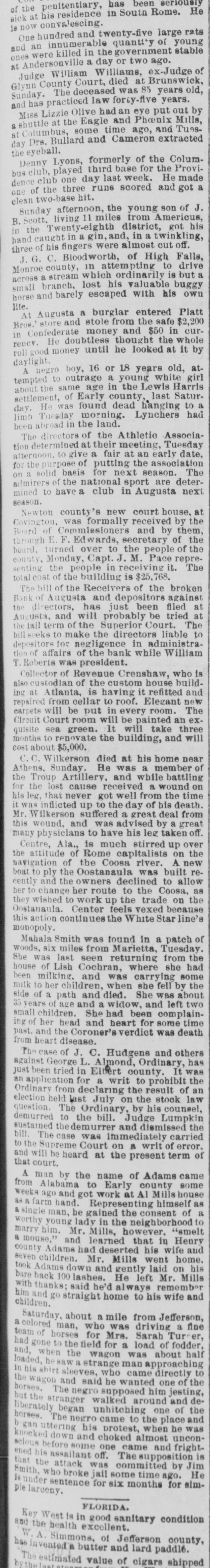 SOUTHERN NEWS GLEANINGS. GREAT suffering and loss.of stock, on the north and south sides of Red River, was caused by floods from recent rains. The Calcasier was three feet higher than ever known. Little River was three feet higher than in 1884. At least five thousand head of stock was lost. JOHN WARWICK DANIEL, of Virginia, has been invited to deliver the address in the hall of the House of Representatives on the day of the dedication of the Washington monument. THE county jail of Gillespie County,Tex. was burned the other morning and a prisoner named Allison burned to death. QUITE a number of families have recently settled in the country surrounding Fort White, Fla. They come principally from South Carolina, and are pleased with the country in which they propose to reside. THE Bank of Augusta, Augusta, Ga., assigned for the benefit of creditors. FEARS are entertained that the World's Cotton Centennial Exposition, at New Orleans, will prove a financial failure. WM. VERNER was arrested at Grafton, W. Va., charged with attempting to murder his wife. Later, he escaped from jail. A FIRE at Raleigh, N. C. destroyed several tobacco warehouses, the Blackwell's Durham Co. losing 400,000 pounds of leaf tobacco. Total loss to all firms $75,000. THE report that Mrs. Burke was the train wrecker at the Grafton, W. V.a., disaster, turns out to be the fiction of a reporter's brain. A NEW phosphate company has commenced. the erection of large phosphate works near Beaufort, S. C. H. L. FREEMAN, Palmersville, N. C., is establishing a shutte block and bobbin factory. A COMPANY has been incorporated at Greenwood, S. C., as the Greenwood Cotton Seed Oil Co. THREE prisoners escaped from the county jail at Pruntytown, Taylor County, W. Va., are was a hours Varner, the who other night. put in only They few William before delivery to await the result of gunshot wound supposed to have been inflicted by him upon his wife, and Arthur Evans arrested some in and weeks Geo. Hartman, ago for two complicity boys the a car. some means a saw came possession robbery By of the of prisoners, Baltimore with and Ohio which into freight they made an opening in a door and effected their escape. Ex-SENATOR BRUCE, chief of the department of colored exhibits at New Orleans, states that the Colored Commissioners' Educational Conference is postponed to February 12. H. H. PEALE, recently elected Secretary of the Merchant's Exchange of Dallas, Tex., several is days has been past. mysteriously Much anxiety missing experienced for by his friends and the members of the exchange as to his whereabouts and safety. THE Baltimore Manufacturers' Record, in a publishes its annual list review of all of Southern the manufacturing industries, and mining enterprises organized in the Southern States in 1884. The list shows 1,865 new enterprises, with an aggregate capital reaching the enormous sum of $105,969,000, divided among fourteen Southern States as follows: Alabama, 187 new establishments, capital $16,925,000; Arkan(as, forty-six with a capital of $2,040,000; Florida, ninety-five, with a capital of $2,323,000; Georgia, 196, with a capital of -5,455,000; Kentucky, 137, with a capital of $2,176,200; Louisiana, 53, with a capital of $5,534,000; Maryland, 105, with a capital of $7,121,500; Mississippi, 40, with a capital of $1,295,000; North Carolina, 226, with a capital of ,110,000; South Carolina, 53, with a capital of $2,154,000; Tennessee, 250, with a capital of $7,910,000; Texas, 212, with a capital of $10,778,000; Virginia, 188, with a capital of $13,450,000; West Virginia, 77, with a capital of $4,392,000. In Kentucky, Alabama and Virginia are extensive mining and iron companies, with large capital organized, which runs up the total investments in those States, though they also added many of the smaller industries. The list shows almost every branch of general manufactures represented. The noticeable feature is the amount of Northern and Western capital going into the South, though the Southern people are themselves showing a remarkable energy in developt ing their resources. COLONEL WILLIAM H. HOGEMAN died the other night after a brief illness, at Charles1 town, W. Va. He was the leading member of the Charlestown bar, and at the time of e his death was Vice-President of the Charlestown National Bank and assistant counsel of the C. and O. Railroad Company.