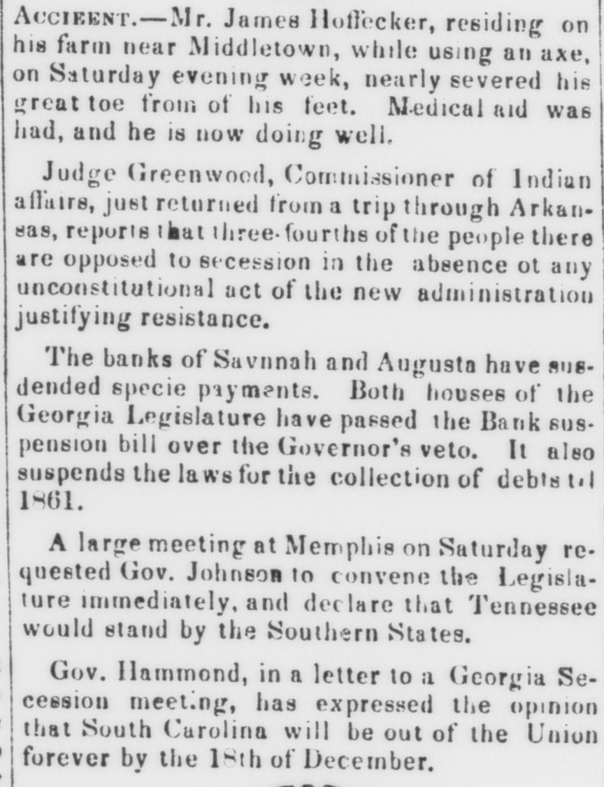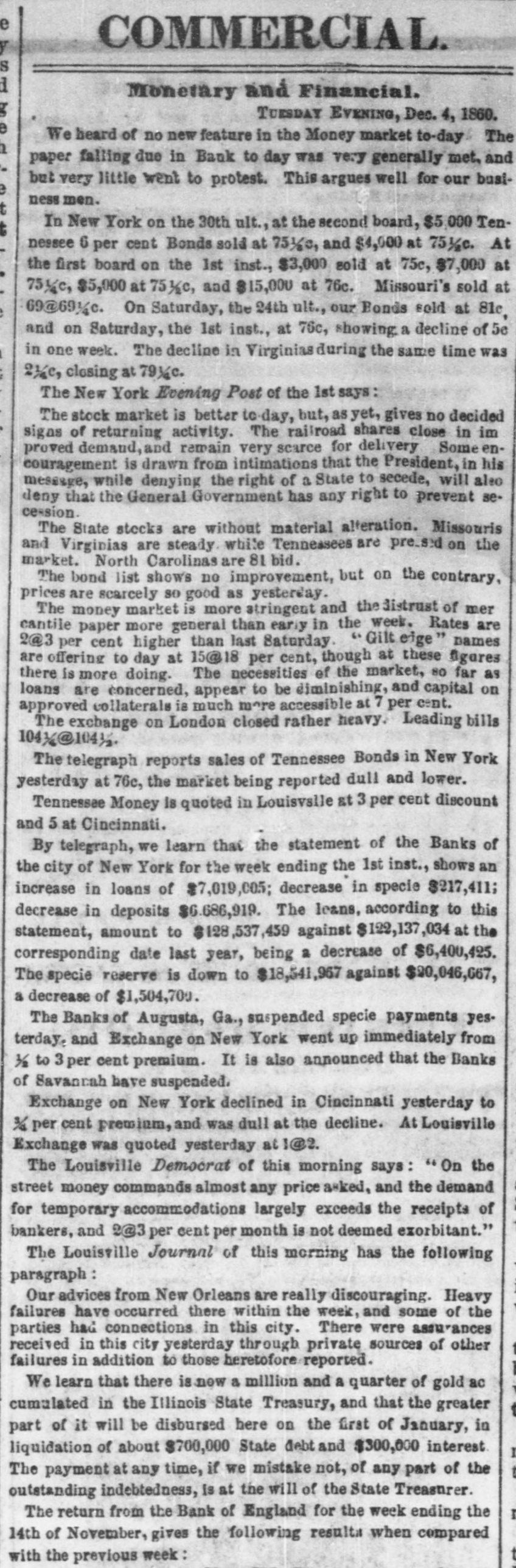 Monetary and Financial. MONDAY EVENING, Dec. 3, 1860. We hear of no change in Money matters to-day. Although the old Banks have been discounting quite liberally since their suspension, there is still a heavy demand for Money, and these who go upon the streets for accommodation have to pay 1@2 per cent. per month, and in some cases higher even than the outside figure. Exchange is growing more scaree, but the old Banks still continue to furnish their regular customers at % per cent, but it is only those who have claims upon the Banks that can get accommodation to any extent. The other Banks and Bankers charge 2@5 per cent, and we are informed, are able to furnish only a limited amount. A Banker informed us to day that upon learning the other day that Exchange on New York had de lined in New Orleans to 1@1% per cent discount, he telegraphed to his correspondent at Memphis to ascertain whether he could purchase Exchange there at what rate, received for an answer tha but a small amount could bepurchased at I per cent premium. So fluctuating is the market for Exchange thatwe omit all quotations for Eastern. We print elsewhere a statement from the President of the City Bank, showing the condition of that institution on the 1st inst, from which it will be seen that the note-holders have no cause for alarm-that the assets are ample to meet all the liabilities of the Bank, and that it was only a question of time and notinability to pay, that caused its suspension. A largenumber ofour merchants and busines men continue to take the issues of the City Bank at par in ordinary transactions, and this should satisfy the noteholders out of Nashville that the strongest confidence is felt here that the Bank is fully able to pay its liabilities. The only change in uncurrent Money we have to report is a re duction in the discount on Louisiana, Kentucky, Ohio,,and,Indi ana. Louisiana is now quoted at 1 per cent discount, Kentucky 1, Ohio 2, and Indiana 3@5. In New York on the 30th ult., at the first board, $9,000 Tennessee 6 per cent Bonds sold at 76½c and $2,000 at 76c. The New York Bvening Post of the 30th says: Stagnation has taken complete possession of the Stock Exchange. The business to day was even smailer than on W ednes. day, and many of the leading stocks, when called, elicited scaree ly a bid or offering. The usual hour for closing the official transactions of the board is o'clock, but such was the inactivity this morning that business was concluded at 11.45, & feature of the market not noticed at any previous time of the current year. The State stocks are rather steady to day. Tennessees are an exception, dropping to 76. Missouris close at 68%@69; Virginias 79K@79K North Carolinas are 80% bid. Louisianas are offered at 93; Californias at 88. Government bonds are weak. The Fives of 1874 sold at-96% The Fives of 1865 are quoted at92%@95. For the new loan 93 is asked; for the Sixes of 1868, 103. In railroad bonds there were few changes. The tendency is downward, and most descriptions are held above the views of buyers Money is becoming sluggish on temporary loan, and within a few days past the offerings at 7 per cent among the stock houses have been in excess of the demand. The note brokers are not in favor at present, and to this may be attributed much of the pres. sure of paper in the open market. There is little or no disposition among capitalists to invest in mercantile paper, and "gilt edge" names, including some of our leading exchange drawers, have been done at 12 per cent with'more offering at the same rate The old buyers of paper stand aloof, and we notice, if anything, a hardening tendency in rates. The foreign exchange market is dull at the advanced rates. Bankers' sterling ranges from 103 principally at 104½ no @104%. Francs are quoted at545@535. The telegraph reports sales of Tennessee Bonds in New York en at the second board on the 1st inst. at 76c, Virginias at 80½c, to Missouris at 700, North Carolinas at 82c, and California 7's at 89c: I The act authorising a suspension by the Georgia Banks was vetoed by Gov. BROWN, and has since been passed by a large majority in both houses. The restriction having thus been removed, I the Georgia Banks will most probably suspend immediately, and I will likely be followed by the Alabama Banks. The Union Bank of South Carolina, at Charleston, publishes a statement of its condition on the 29th ult from which we learn h that it is due depositors and nete holders $378,485.42, to meet which it has the following assets: e Local Notes $141.360.11 3 Bonds 46,726.84 19,430.35 Sterling Exchange 8 362,342.13 Northern Exchange I 233.963.96 Southern Exchange Coin 181,774.25 c 42,512.70 Balance Due by City Banks tl $1,328,119 3 The Fayetteville (N.O.) Observer reports the sale by auction E in that place of eight shares of the stock of the Bank of Cape in Fear at $118 share This fact indicates that the Bank is in a u very solvent and prosperous condition. The Columbus (Ga) Sun reports the sale by auction in that u place on the 30th ult, of ten shares of the Bank of Columbus at m par, and adds: "This sale indicates well for this institution and fil its management, especially when in the midst of a financial pres sureso hard as our people are now passing through." q We mentioned the other day the suspension of the Manufactua1 rers' Bank, at Macon Ga., and the probability that it would T be wound up The Macon Journal and Messenger of the 28th 81 ult. says: m This Bank closed business on Monday morning, by suspension of settlements with other Banks, and specie payments, except to bill holders of small amounts. They continue to redeem their bills in those of other current banks, gold, or silver, as the hold ers may wish, with laborers and all people of small means. From A the most reliable information we can obtain, the Bank has ample means to meet all its liabilities within a reasonable time given to 2, make its collections. From the pecultar pressure of the times, 