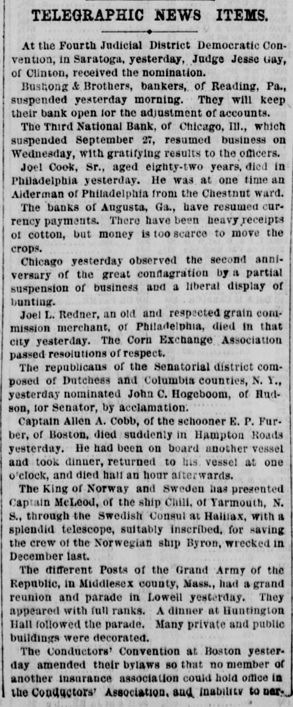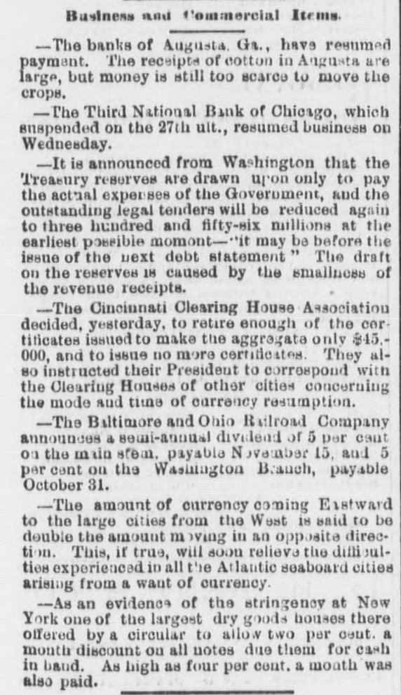 FINANCIAL. Banks Resume Greenback PaymentsHeavy Grain Receipts, etc. NEW YORK, Oct. 9.-The down town banks virtually resumed the payment of greenbacks yesterday. The step was mainly taken in consequence of the fiattering exhibit of legal ten ders made at the clearing house yesterday morning. Mr. Camp, manager of the clearing house, said that since the issue of the loan cer titicates there has not been so many greenbacks as were seen in the morning when clearances were made. All grains received from the west during the week, aggregating over a million bushels, more than any week in the history of the country, have been paid for in legal tenders. It is onderstood that measures have been taken by the managers of the Unlon Trust Company, whereby loans which were made to delinguent customers will be taken up and the company be enabled to resume business be fore the 15th. NEW YORK, Oct. 9. - Mr. Camp, manager of the clearing house, says he cannot give his opinion as to when there will be a resumption of currency payments by the banks, because he is not prepared to admit that the banks have suspended currency payments. They have, he says, only refused to pay out legal tenders for checks. Legal tenders are rapidly increasing in the banks of this city and the banks are now paying all regular and legitimate demands upon them. AUGUSTA, Ga., Oct 9. -The banks here have resumed currency payments. There have been heavy receipts of cotton, but money is too scarce to save the crops. About $500 hve been forwarded for the relief of Shreveport and Memphis. There has been a light frost throughout this section. CINCINNATI, Oct. 9. - -The Clearing House Association to day decided to issue no additional clearing house certificates, and also returned 50,000 already issued, thus reducing the aggregate to 450,000. President Cook was instructed to correspond with cities in the West and South relative to the mode and time of currency resumption. CHICAGO, Oct. 9.-The Third National Bank, which suspended September 7th, resumed business yesterday. with gratifying results to the officers. ST. LOUIS, Oct. 9.-The directors of the Union National Bank of this city have decided to go into liquidation. The assets are said to be largely in excess of the liabilities and nobody will lose anything. The cause assigned for the action of the directors is the scarcity of currency.