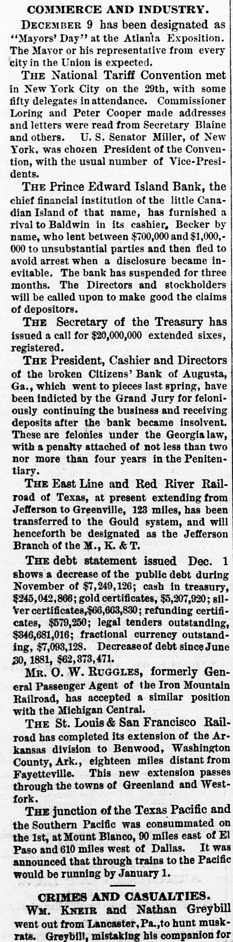 PERSONAL AND GENERAL. THE Dockyard Church at Sheerness burned the other night and nine the England, persons are reported to have perished in flames. the county-seat of Wood- by Ark., was almost the fire on the night of the 28th. ruff AUGUSTA, County, Nearly destroyed like tinder. all buildings were wood and burned The Post-office, flour and cotton mills, three hotels, the Vidette printing-office and kinds a of business buildings of various score were swept away like chaff. Only three left buildings out of as many hundreds are instanding. A number of persons were it is jured by falling rafters and walls, and The feared that many were fatally burned. total loss is between $250,000 and $300,000, with but very small insurance. r THE ninth annual session of the d American Public Health Association began at Savannah, Ga., on the 29th, with good attendance. National Tariff Convention met 0 New York City on the 29th, in attendance. in fifty THE delegates Commissioner with some addresses, 1 Loring and Peter Cooper made and letters were read from Secretary Blaine g and others. U. S. Senator Miller, of New York, was chosen President of the Conven8 tion, with the usual number of Vice-Presig dents. MRS. MILLER, living four miles northe - west of Cedar Falls, Iowa, while in a condition of temporary insanity, killed two of her children and tried to kill third. She was e crazed by the death of her husband, which occurred recently. ry LEFROY, the murderer of Gold, in an e English railway carriage, was hanged on ly d the 29th. He was silent on his way from the cell to the scaffold, but his expression was C- ghastly. The drop was nine feet, and death d was instantaneous. THE Wise County Court-house, at es ed Decatur, Texas, burned on the 27th,with all its records and other contents. Loss on building $15,000, with no insurance. The of fire was incendiary in its origin, and as the is question of building a new court-house has 8, been agitated considerably of late, it is bees lieved to have been the work of interested iff parties. III THE business portion of Kosciusko, VMiss., has been destroyed by fire. Aggreto gate losses estimated at $60,000, partially inve sured. bTHE Prince Edward Island Bank, the chief financial institution on the little Canain dian Island of that name, has furnished ed rival to Baldwin in its cashier, Becker by S. name, who lent between $700,000 and $1,000,to 000 to unsubstantial parties and then fled res avoid arrest when a disclosure became inrs evitable. The bank has suspended for three months. The Directors and stockholders ta. er will called upon to make good the claims ise or depositors. 'eIN the recent furious storm on the on Australian coast the steamer Boisbone was to wrecked on a reef, the steamer Balelutha is foundered between Melbourne and Sydney, on and the schooner Schoolboy, with all board, was lost near Jewes Bay. in DR. JOHN BACON, Professor of Chemonly istry at Harvard College, is dead. the THE Irish National Convention asot. sembled at Chicago on the 30th, with a large le, attendance. Hon. Wm. J. Hynes, of Chior cago, was chosen President. ers, A DISPATCH from Odessa says: ed Jew-baiting mob stoned Sarah Bernhardt' in carriage as she was driving home from the eld, theater, on the ground that she was of Jew uly ish descent. They also stoned her hotel an stopped the performance at the theater. in THE President, Cashier and Directors rei of the broken Citizens' Bank of Augusta Ga., which went to pieces last spring, have debeen indicted by the Grand Jury for feloni ved ously continuing the business and receivin dedeposits after the bank became insolvent enThese are felonies under the Georgia law act. with penalty attached of not less than two im nor more than four years in the Penitentiary ght PAPERS have been filed with the and Clerk of the House of Representatives in ntal following Congressional election contests ion Alabama-First, Second, Fourth and Eight reDistricts; Florida-Second District; Iowalane Sixth District; Louisiana-Sixth District mer Maine-First District; Mississippi-Secon the and Sixth Districts; Missouri-Third D Ho trict; South Carolina-First, Second, Thir tten and Fifth Districts; Virginia-Fifth an stly Eighth Districts. in LOUIS BURKE and John Booker, ne ntly groes, were in jail at Oxford, N. C., charge lain with robbing and murdering Charles Lynch the a jeweler. The other night an armed bod by of fifty or sixty men visited the jail an ose. forced the jailer to deliver up the two mur otly, derers. They made full confession of th apcrime, after which they were carried to th reeoutskirts of the village and hanged to contree. his THE East Line and Red River Rai his road of Texas, at present extending from hen Jefferson to Greenville, 123 miles, has bee one transferred to the Gould system, and wi airty henceforth be designated as the Jefferso eral Branch of the M. K. &T. was WitBy the bursting of a boiler in Mann failOil Works, Yazoo City, Miss., six colore employees were injured, some at least ago, tally. elseeatTHE infant son of George Harfrance his at Akron, O., fell into a tub of hot wat off while his mother was scrubbing the floor arwas scalded to death. oth. ROBERT J. DUNLAP & Co., of Jerse tion City, N. J., alleged agents of the Royal H Paul, vana Lottery, have been operating large God through the West by means of circulars, oard are said to have reaped rich harvest. The the are unmitigated swindlers. lnesLATE Irish news: One thousand te on, I ants of Roscommon refuse to pay rent. Th the declare they will not apply to the Lar keit Court. Opposition to rent-paying is esp had cially marked in County Limerick. abted Sheriff holds 300 writs of eviction again that tenants for rent due. The Coroner's ju ask refound a verdict of murder against Inspect Strich, in charge of the police during an way. fray at Bellmullet, Ireland, when wom save named McDonough was killed A numb