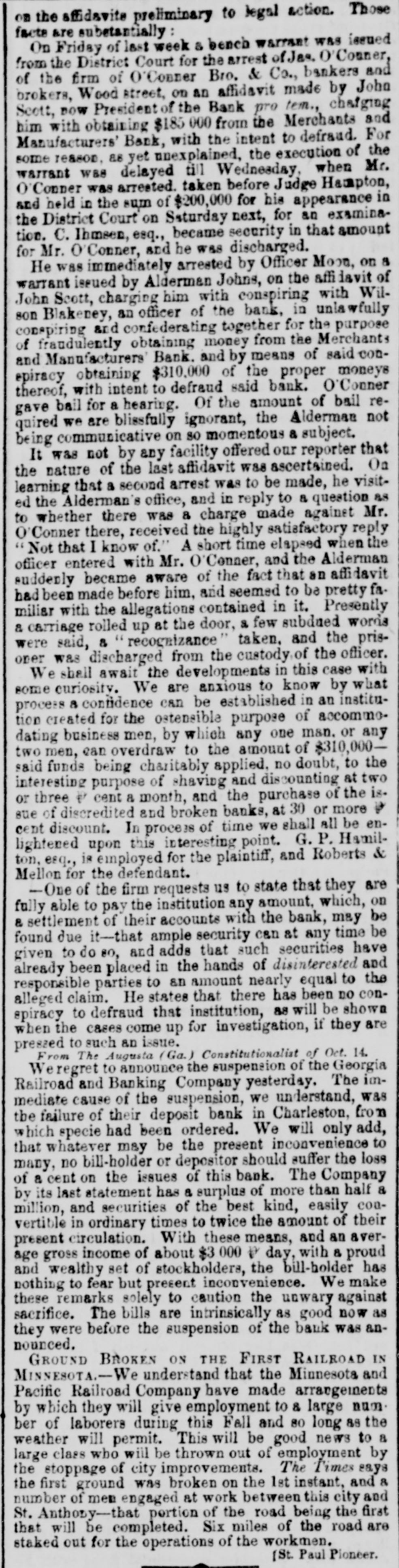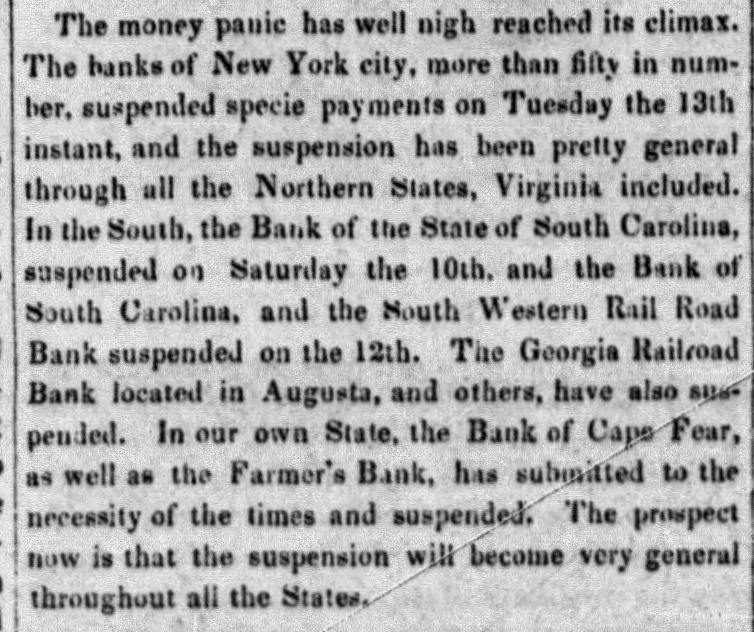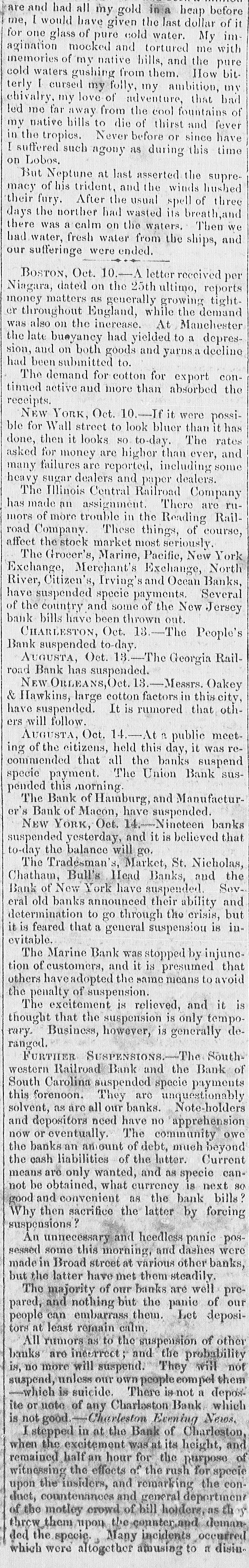 action to that end. A committee of eight was accordingly anpointed; which proceeded to Albany this evening. The meeting of the officers of the several Savings Banks of New York York and Brooklyn which was held this afternoon, resolved to pay depositors only in the notes of city banks. Several of the banks which closed their doors yesterday resumed business to-day. The Supreme Court judges to-day held a meeting and decided to issue no process against the form. banks excepting upon notice given in the usual The action of the merchants' meeting fails to give satisfaction. Richard Schell, Esq., was present with resolutions censuring the banks for demanding specie of each other, when they withheld it from their customers, but he was induced to withhold them. A strong movement is progressing among the republican leaders against the proposed extra session of the Legislature or any other recognition of the suspension. while a large majority of the democrats and a few Americans and republicans banks. are uniting in support of the relief of the P. M-The bank suspension has had a beneficial effect, and stocks largely advanced. The feeling generally is improved and the excitement subsided. The banks paid out five millions of specie yesterday. They continue business as usual, except paying specie. The Chemical and Bank of America pay everything. specie included. The other banks are indignant at such a course. Gold commands a premium of four to five per cent., and city bank bills sell at five per cent. discount. At a meeting of bank officers this afternoon, it was resolved to suspend the specie clause in the clearing house, substituting therefor an agreement balances. by which the debtor banks pay interest on The banks which have already gone into the hands of receivers will immediately enter upon the business of winding up, unless they can retrace their steps and resume their places in the ranks of the clearing house. The American Exchange and the Metropolitan Banks have resolved to receive State money at par, but the other banks are yet undecided. Several of the city savings banks refuse further payments of coin at present. The Chemical Bank announced its determination to continue specie payments. This bank was the only one that went through the crash of 1837 unharmed. pended. Every one of the Williamsburg banks have susA meeting of the merchants was held this afternoon, and voted that they had full confidence in the banks, notwithstanding their unfortunate suspension. They also resolved to use every effort to restore the prosperity of the city. BOSTON, Oct. 14.-All of the Fall River banks have suspended. Since the bank meeting this morning everything is quiet. Stocks are unsettled, with symptoms favora ble to a rise. The Massachusetts Insurance Com any has declared a dividend of 20 per cent. The Massachusetts Bank paid specie up to the closing to-day. Its circulation is one hundred and thirty-six thousand dollars, and its specie three hundred and seventy thousand dollars. P. M -The suspension of our banks has caused but littieexcitement. They have resolved to continue the exchange house and to resume specie payment as soon as possible. The banks of New Bedford. Worcester, Fair Haven. and other principal places havesuspended. The Nantu and Lowell banks paid specie throughout to-day, but the suspension will be general in New England. ALBANY, October 14.-The banks here have resolved to receive on deposit and in payment of debts, the notes of all State banks redeemable in New York: NEWARK, N. J., Oct. 13.-There was a great run on the Newark Savings bank here to-day, but it is thought they will fully sustain themselves. BOSTON, Oct. 14.-Every bank here voted to suspend specie payment. The Banks throughout the State will follow suit. PETERSBURG, October 14.-The branch of the Farmers' Bank of Virginia at this place has suspended. The branches of the Virginia and Exchange banks are still paying specie. AUGUSTA, Oct 14.-The Georgia Railroad Bank has suspended. DETROIT, Oct. 14.-The Michigan Insurance Co. has suspended specie payment. SECOND DISPATCH. RICHMOND, Oct. 15.-The Farmers' and Exchange Banks here suspended this morning. The Bank 0. Virginia still holds out. AUGUSTA, Oct. 15-A public meeting of the citizens here recommended all the banks to suspend. The Union Bank suspended this morning. Philadrlphia, Oct. 15-The banks here today manifest a disposition to not accept the provisions of the relief bill, and there is an additional gloom in business circles. Sata Fe Traders at St. Louis. ST. LOUIS, Oct. 13.-A number of Santa Fe merchants have arrived to-night, with upwards $100,000 in gold, for the purpose of settling up their old accounts and purchrsing new goods. Marine Disaster. NORFOLK, Oct. 14.-Arrived to-day bark Lucerne, from the coast of Africa, bound to New York, in a leaking condition, spars damaged and crew sick.