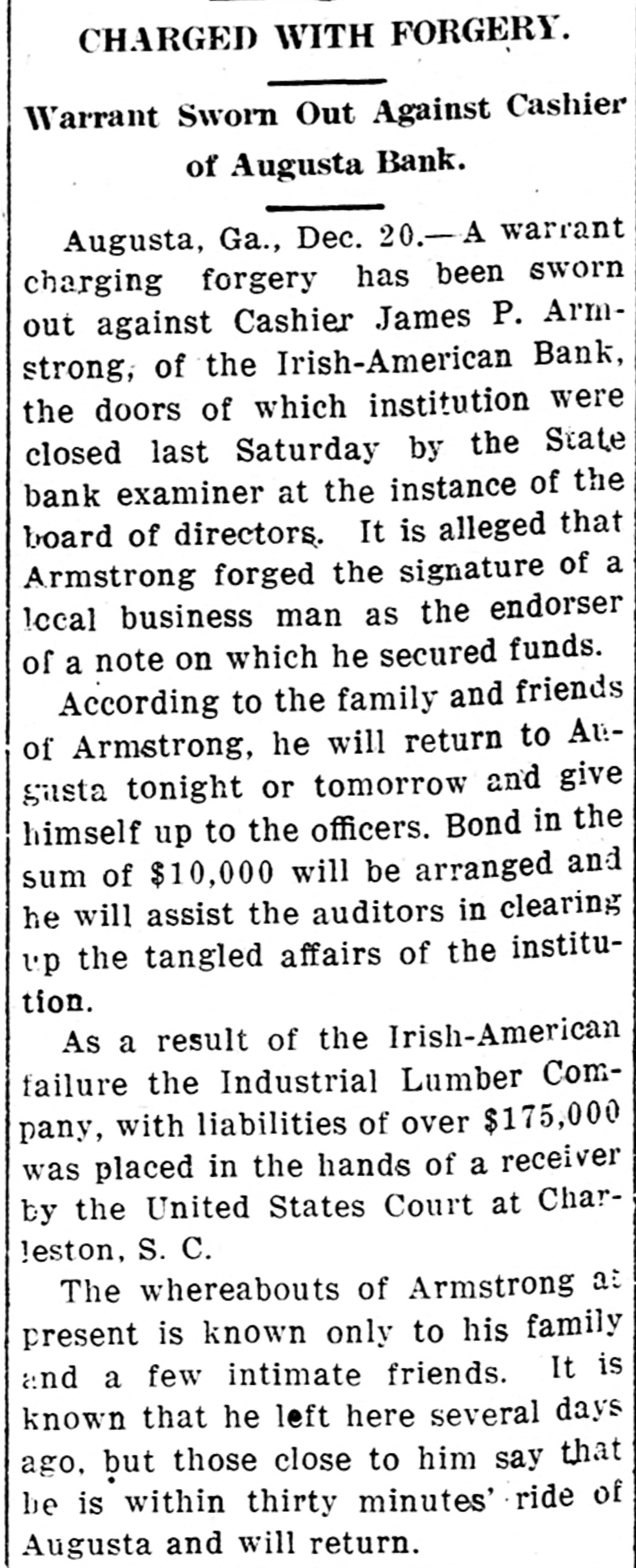 CHARGED WITH FORGERY. Warrant Sworn Out Against Cashier of Augusta Bank. Augusta, Ga., Dec. 20.-A warrant charging forgery has been sworn out against Cashier James P. Armstrong, of the Irish-American Bank, the doors of which institution were closed last Saturday by the State bank examiner at the instance of the board of directors. It is alleged that Armstrong forged the signature of a local business man as the endorser of a note on which he secured funds. According to the family and friends of Armstrong, he will return to Augusta tonight or tomorrow and give himself up to the officers. Bond in the sum of $10,000 will be arranged and he will assist the auditors in clearing up the tangled affairs of the institution. As a result of the Irish-American failure the Industrial Lumber Company, with liabilities of over $175,000 was placed in the hands of a receiver by the United States Court at Char!eston, S. C. The whereabouts of Armstrong at present is known only to his family and a few intimate friends. It is known that he left here several days ago, but those close to him say that be is within thirty minutes' ride of Augusta and will return.