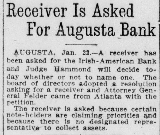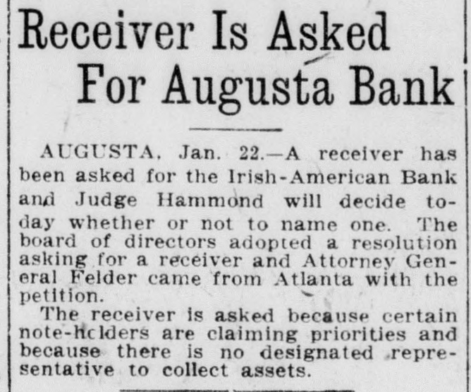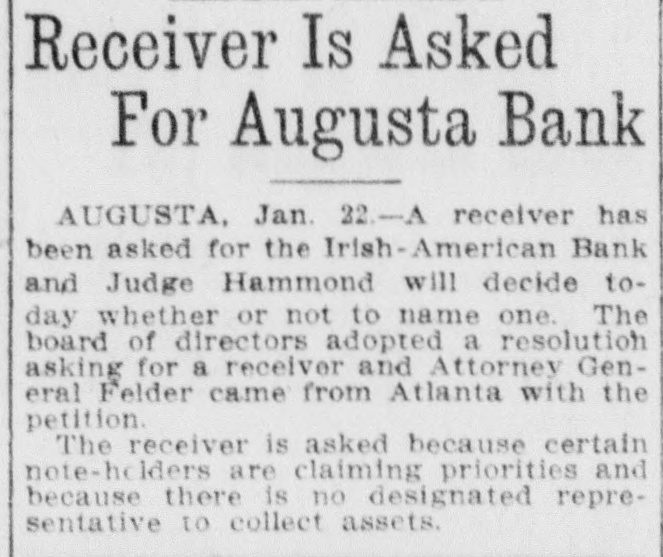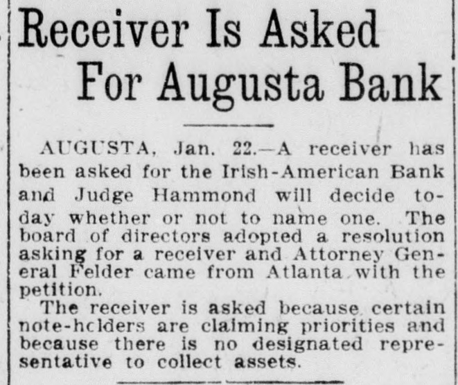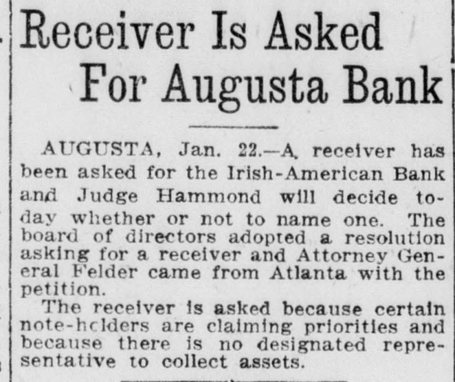 Receiver Is Asked For Augusta Bank AUGUSTA, Jan. 22.-A receiver has been asked for the Irish-American Bank and Judge Hammond will decide today whether or not to name one. The board of directors adopted a resolution asking for a receiver and Attorney General Felder came from Atlanta with the petition. The receiver is asked because certain note-holders are claiming priorities and because there is no designated representative to collect assets.