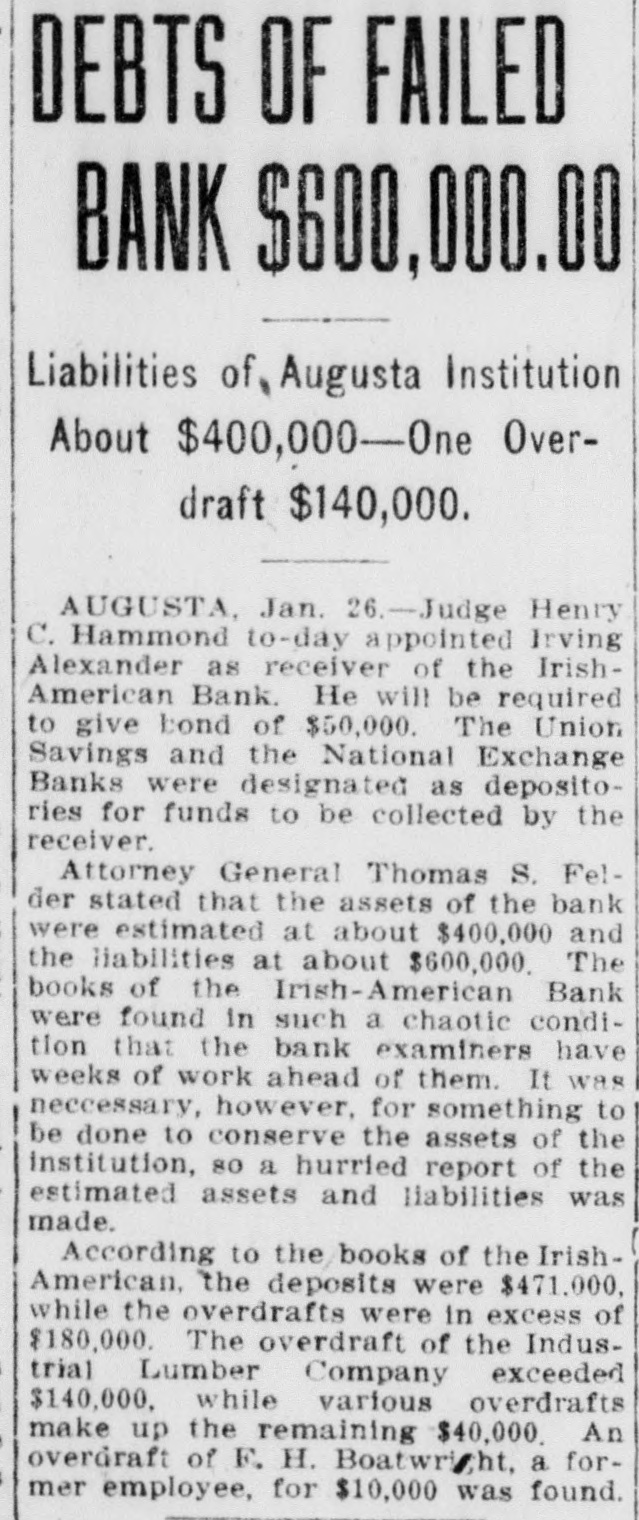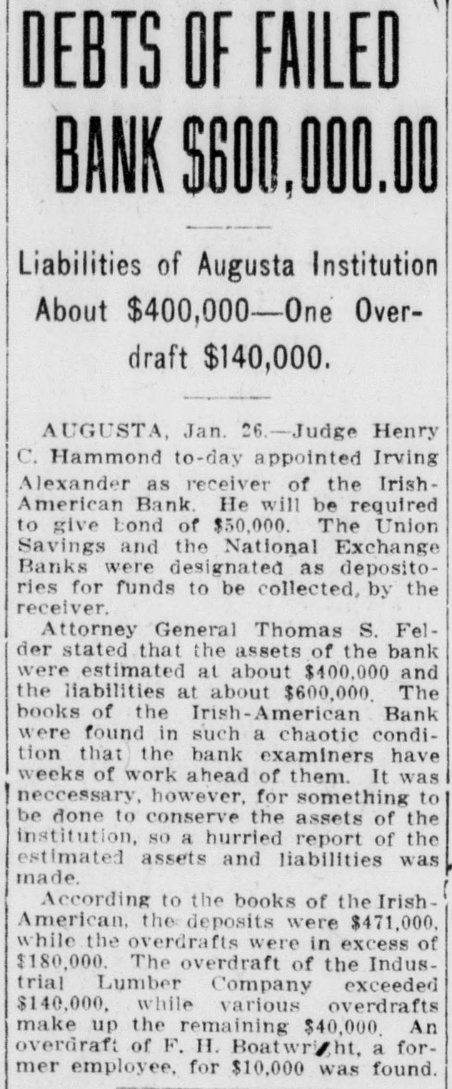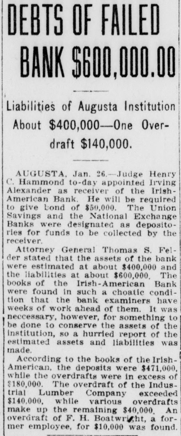 DEBTS OF FAILED BANK $600,000.00 Liabilities of Augusta Institution About $400,000-One Overdraft $140,000. AUGUSTA, Jan. 26.-Judge Henry C. Hammond to-day appointed Irving Alexander as receiver of the IrishAmerican Bank. He will be required to give bond of $50,000. The Union Savings and the National Exchange Banks were designated as depositories for funds to be collected by the receiver. Attorney General Thomas S. Felder stated that the assets of the bank were estimated at about $400,000 and the liabilities at about $600,000. The books of the Irish-American Bank were found in such a choatic condition that the bank examiners have weeks of work ahead of them. It was neccessary, however, for something to be done to conserve the assets of the institution, so a hurried report of the estimated assets and liabilities was made. According to the books of the IrishAmerican, the deposits were $471,000, while the overdrafts were in excess of $180,000. The overdraft of the Industrial Lumber Company exceeded $140,000, while various overdrafts make up the remaining $40,000. An overdraft of F. H. Boatwright, a former employee, for $10,000 was found.
