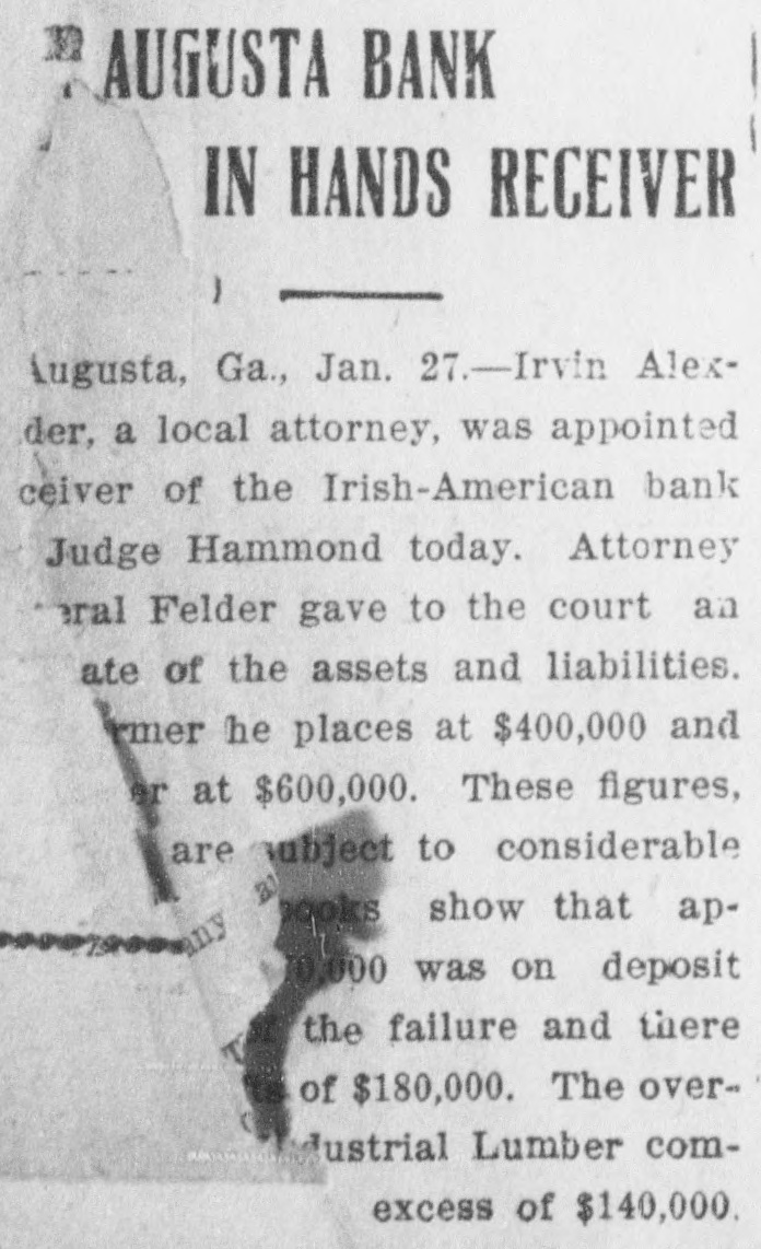 AUGUSTA BANK IN HANDS RECEIVER ) Augusta, Ga., Jan. 27.-Irvin Alexder, a local attorney, was appointed ceiver of the Irish-American bank Judge Hammond today. Attorney eral Felder gave to the court an ate of the assets and liabilities. rmer he places at $400,000 and or at $600,000. These figures, are ubject to considerable books show that apAUE 70,000 was on deposit the failure and there of $180,000. The overlustrial Lumber comexcess of $140,000.