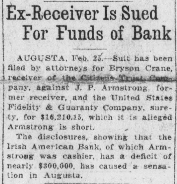 Ex-Receiver Is Sued For Funds of Bank AUGUSTA, Feb. 25. Suit has been filed by attorneys for Bryson Crane, receiver of the Citizens Trust Canzpany, against J. P. Armstrong. former receiver, and the United States Fidelity & Guaranty Company, surety, for $16,210.15, which it is alleged Armstrong is short. The disclosures, showing that the Irish American Bank, of which Armstrong was cashier, has a deficit of nearly $300,000. has caused a sensation in Augusta.