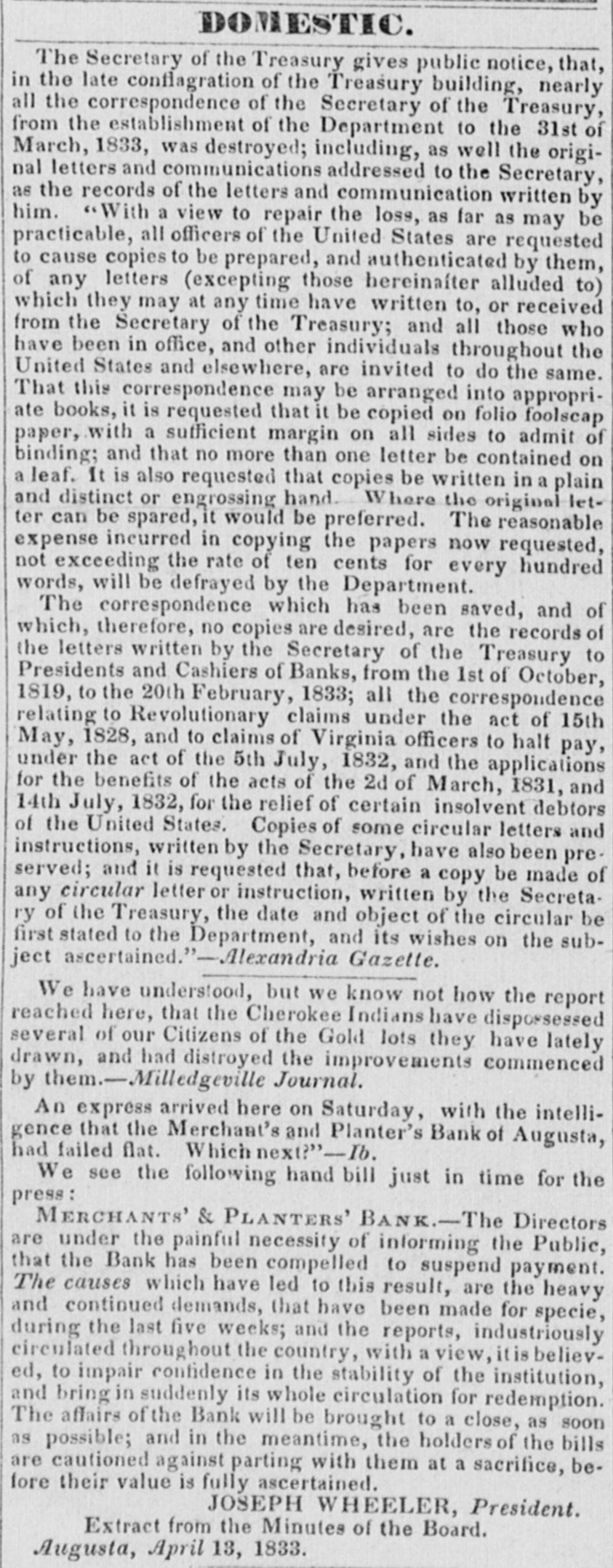 DOMESTIC. The Secretary of the Treasury gives public notice, that, in the late conflagration of the Treasury building, nearly all the correspondence of the Secretary of the Treasury, from the establishment of the Department to the 31st of March, 1833, was destroyed; including, as well the original letters and communications addressed to the Secretary, as the records of the letters and communication written by him. "With a view to repair the loss, as far as may be practicable, all officers of the United States are requested to cause copies to be prepared, and authenticated by them, of any letters (excepting those hereinafter alluded to) which they may at any time have written to, or received from the Secretary of the Treasury; and all those who have been in office, and other individuals throughout the United States and elsewhere, are invited to do the same. That this correspondence may be arranged into appropriate books, it is requested that it be copied on folio foolscap paper, with a sufficient margin on all sides to admit of binding; and that no more than one letter be contained on a leaf. It is also requested that copies be written in a plain and distinct or engrossing hand Where the original letter can be spared, it would be preferred. The reasonable expense incurred in copying the papers now requested, not exceeding the rate of ten cents for every hundred words, will be defrayed by the Department. The correspondence which has been saved, and of which, therefore, no copies are desired, are the records of the letters written by the Secretary of the Treasury to Presidents and Cashiers of Banks, from the 1st of October, 1819, to the 20th February, 1833; all the correspondence relating to Revolutionary claims under the act of 15th May, 1828, and to claims of Virginia officers to half pay, under the act of the 5th July, 1832, and the applications for the benefits of the acts of the 2d of March, 1831, and 14th July, 1832, for the relief of certain insolvent debtors of the United States. Copies of some circular letters and instructions, written by the Secretary, have also been preserved; and it is requested that, before a copy be made of any circular letter or instruction, written by the Secretary of the Treasury, the date and object of the circular be first stated to the Department, and its wishes on the subject ascertained." -Alexandria Gazette. We have understood, but we know not how the report reached here, that the Cherokee Indians have dispossessed several of our Citizens of the Gold lots they have lately drawn, and had distroyed the improvements commenced by them.-Milledgeville Journal. An express arrived here on Saturday, with the intelligence that the Merchant's and Planter's Bank of Augusta, had failed flat. Which next?"--Ib. We see the following hand bill just in time for the press: MERCHANTS' & PLANTERS' BANK.-The Directors are under the painful necessity of informing the Public, that the Bank has been compelled to suspend payment. The causes which have led to this result, are the heavy and continued demands, that have been made for specie, during the last five weeks; and the reports, industriously circulated throughout the country, with a view, itis believed, to impair confidence in the stability of the institution, and bring in suddenly its whole circulation for redemption. The affairs of the Bank will be brought to a close, as soon as possible; and in the meantime, the holders of the bills are cautioned against parting with them at a sacrifice, before their value is fully ascertained. JOSEPH WHEELER, President. Extract from the Minutes of the Board. Augusta, April 13, 1833.